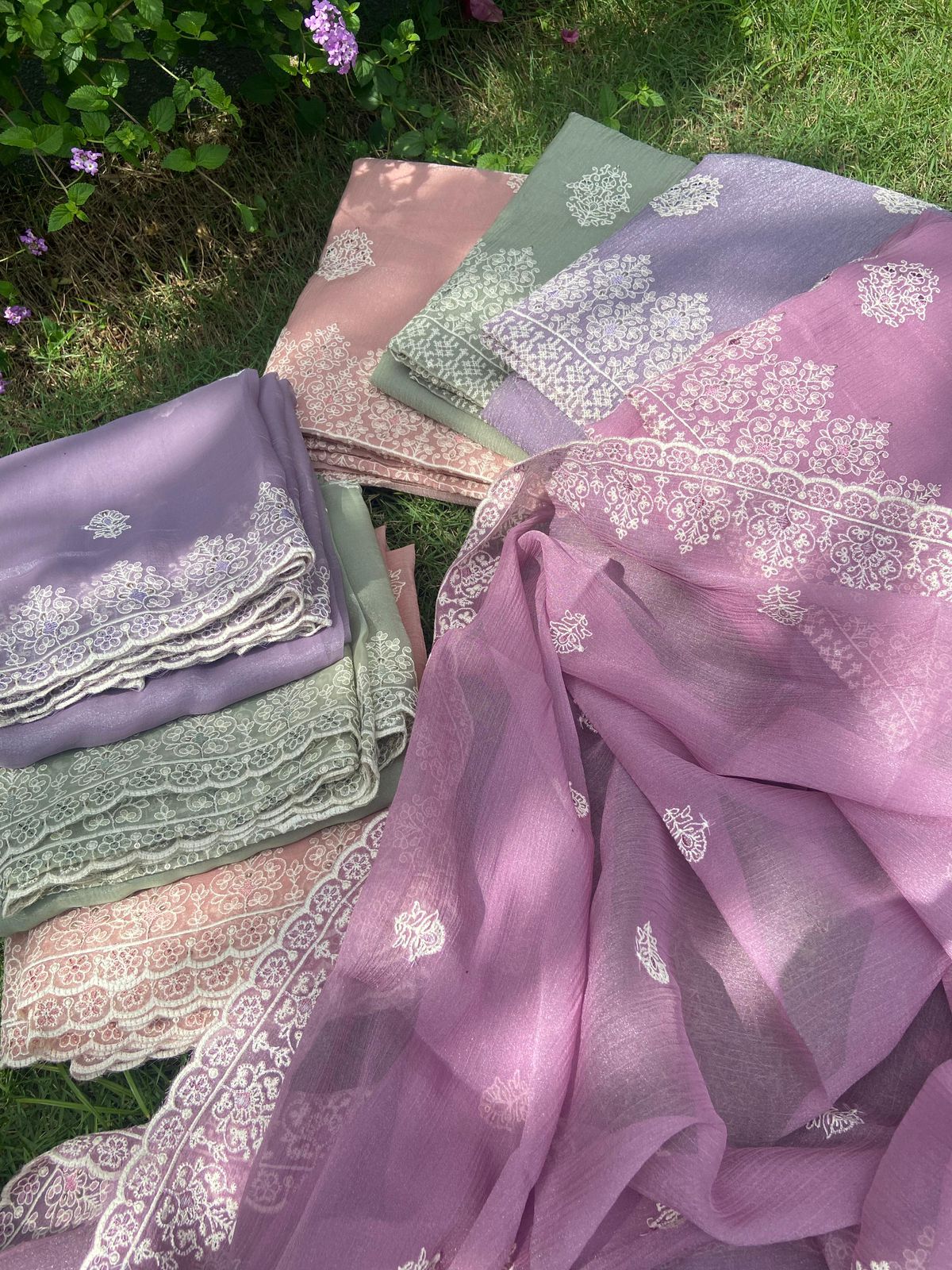 Presenting out Brand New Collection for Onam at a Special Price of ₹1499/- curated on Chiffon woth Cutwork and beautiful floral embroidery! Ethereal hues of Pink, Pearl Green, Ivory gold, Dusty pink & Jet black on Chiffon top and Duppatta with floral embroidery & Cutwork. The floral embroidery design is created to resemble pearl embroidery. Bottom is cotton silk