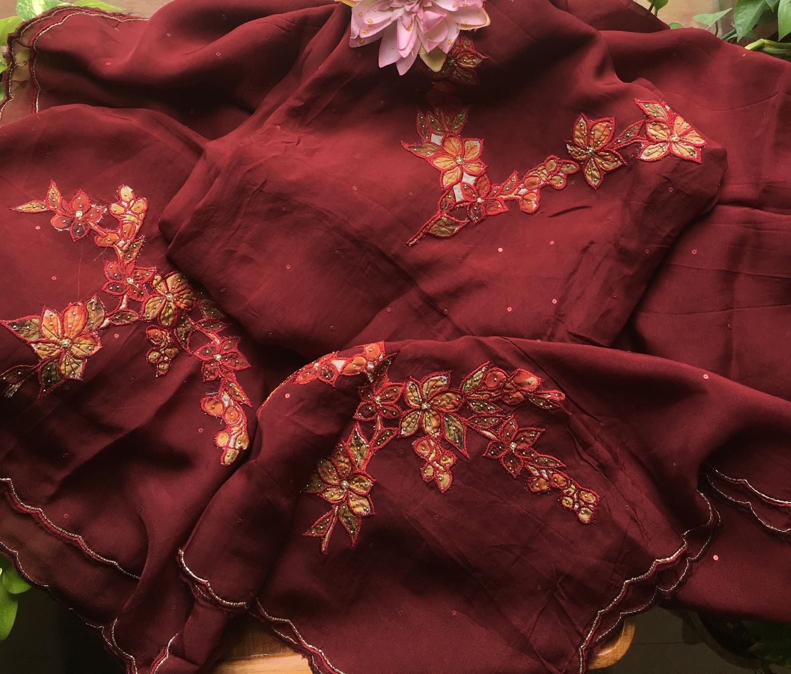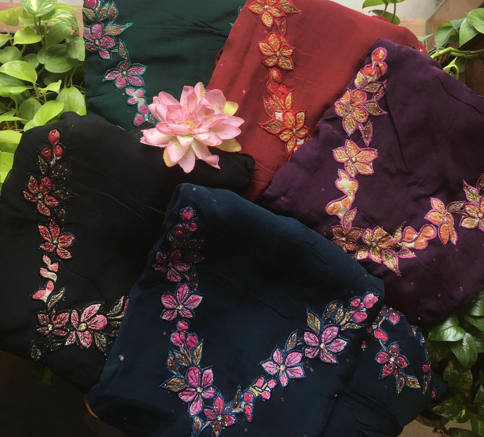 Presenting out Brand New Collection for Onam at a Special Price of ₹1499/- curated on Chiffon woth Cutwork and beautiful floral embroidery! Ethereal hues of Pink, Pearl Green, Ivory gold, Dusty pink & Jet black on Chiffon top and Duppatta with floral embroidery & Cutwork. The floral embroidery design is created to resemble pearl embroidery. Bottom is cotton silk
