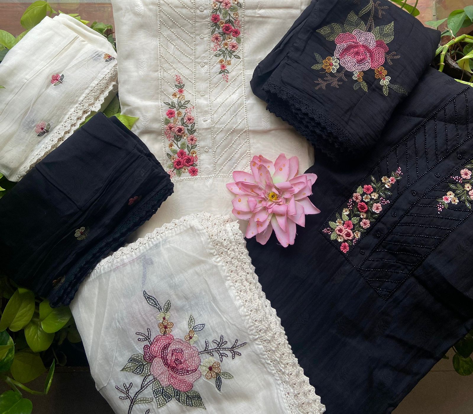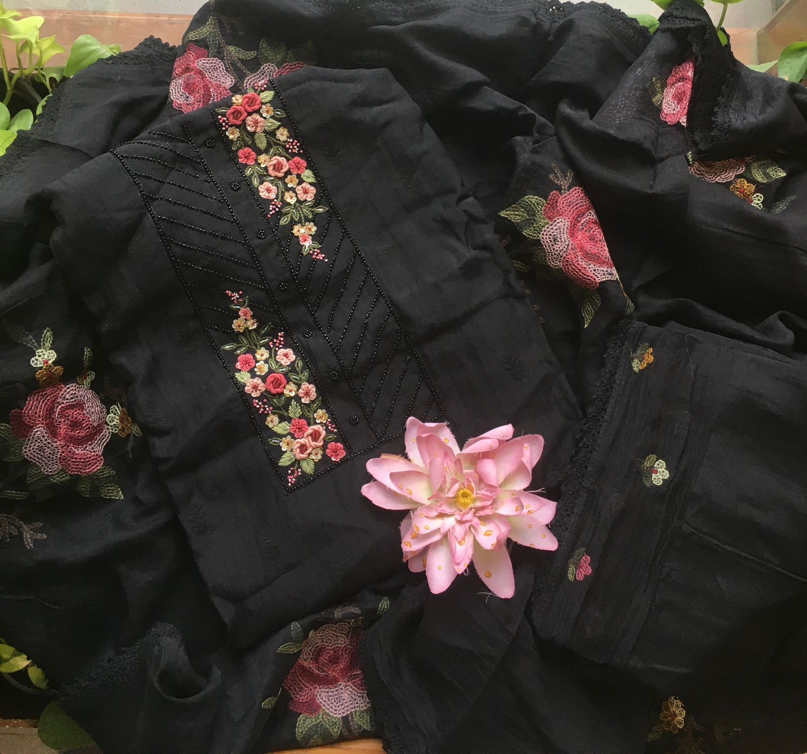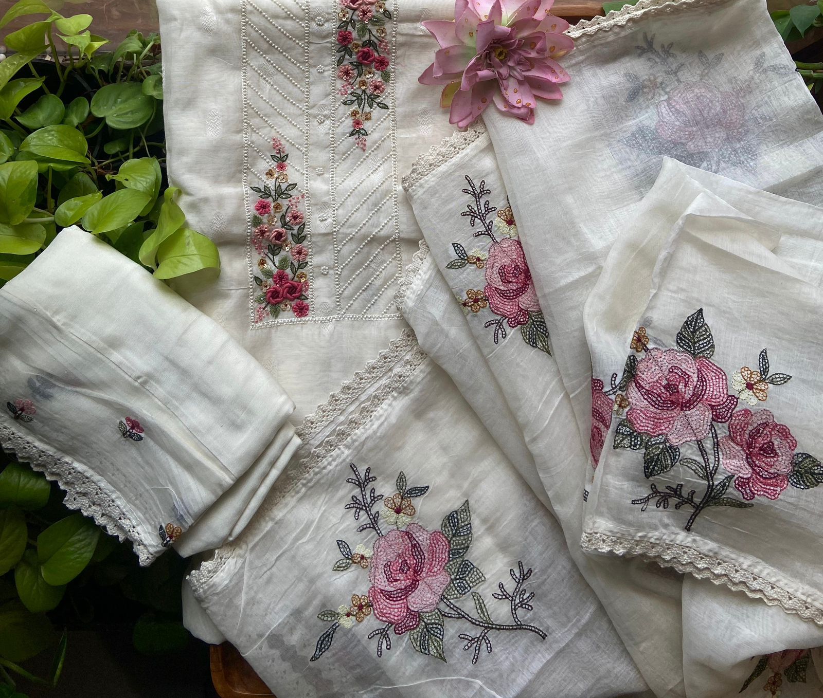 A stunningly gorgeous hand made pure Malai Chandheri silk top with intricate floral embroidery detailing on yoke , sleeve borders & on Santoon bottom as well. Duppatta is truly stunning with intricate embroidery . Premium & limited in numbers hurry before we run out of these