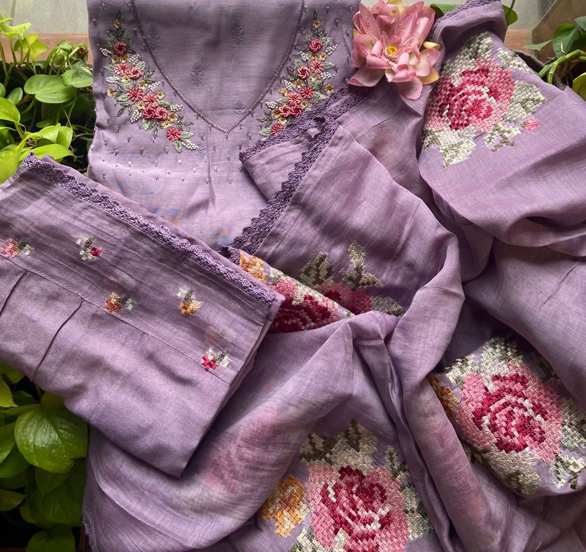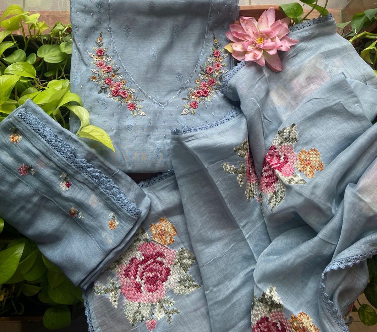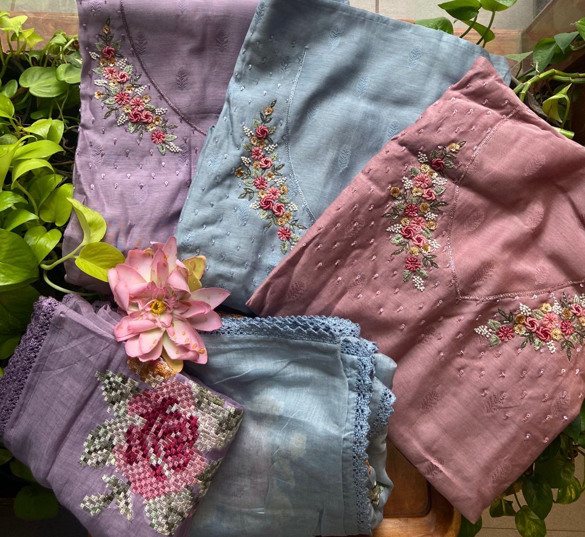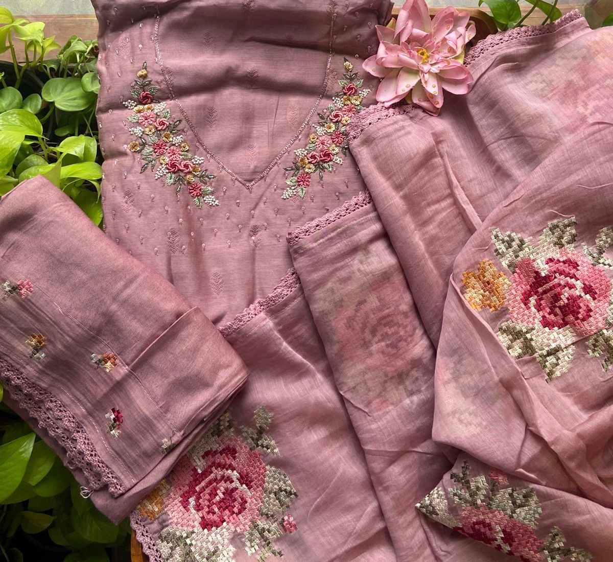 Beautiful Linen Suits in lovely handpicked color hues with exquisite hand embroidery featuring bullion knots, satin stitches, French knots n more