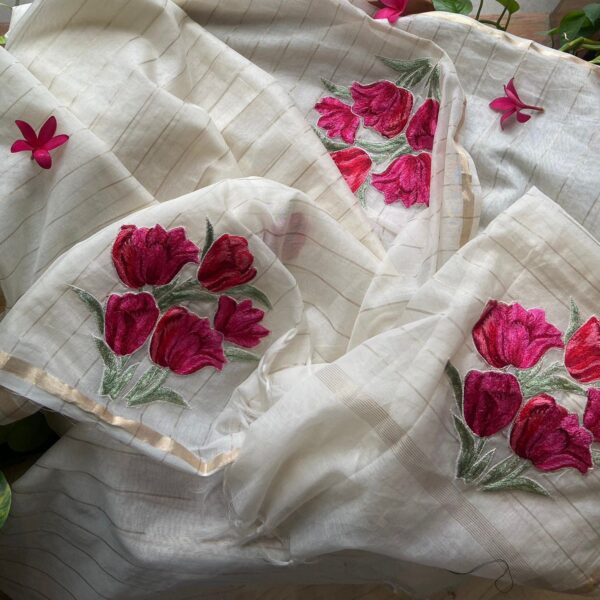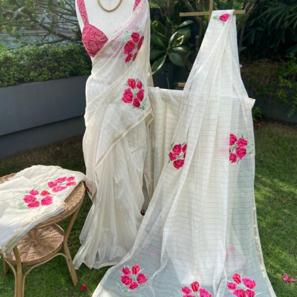 Presenting our beautiful New Exclusive Pure Malai Chandheri Saree with exquisite AppliquƩ embroidery on entire saree , pallav & a stunningly gorgeous blouse with appliquƩ on sleeves