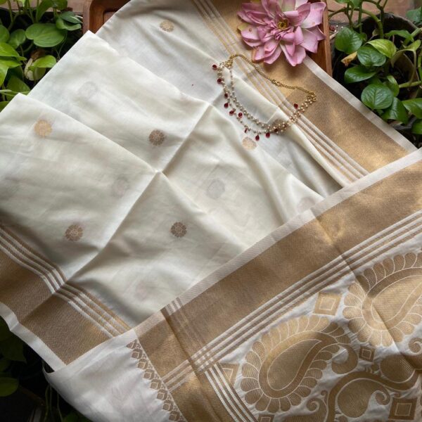 A stunningly beautiful Dola Silk saree with a beautiful weave of Antique Gold Lotus & floral butta weaving creating a stunning visual impact. With blouse self with borders. The ethereal antique Ivory Gold hue of the saree creates a beautiful drape once worn ensuring you steal the show this Onam ! (The displayed blouse is customised additionally)