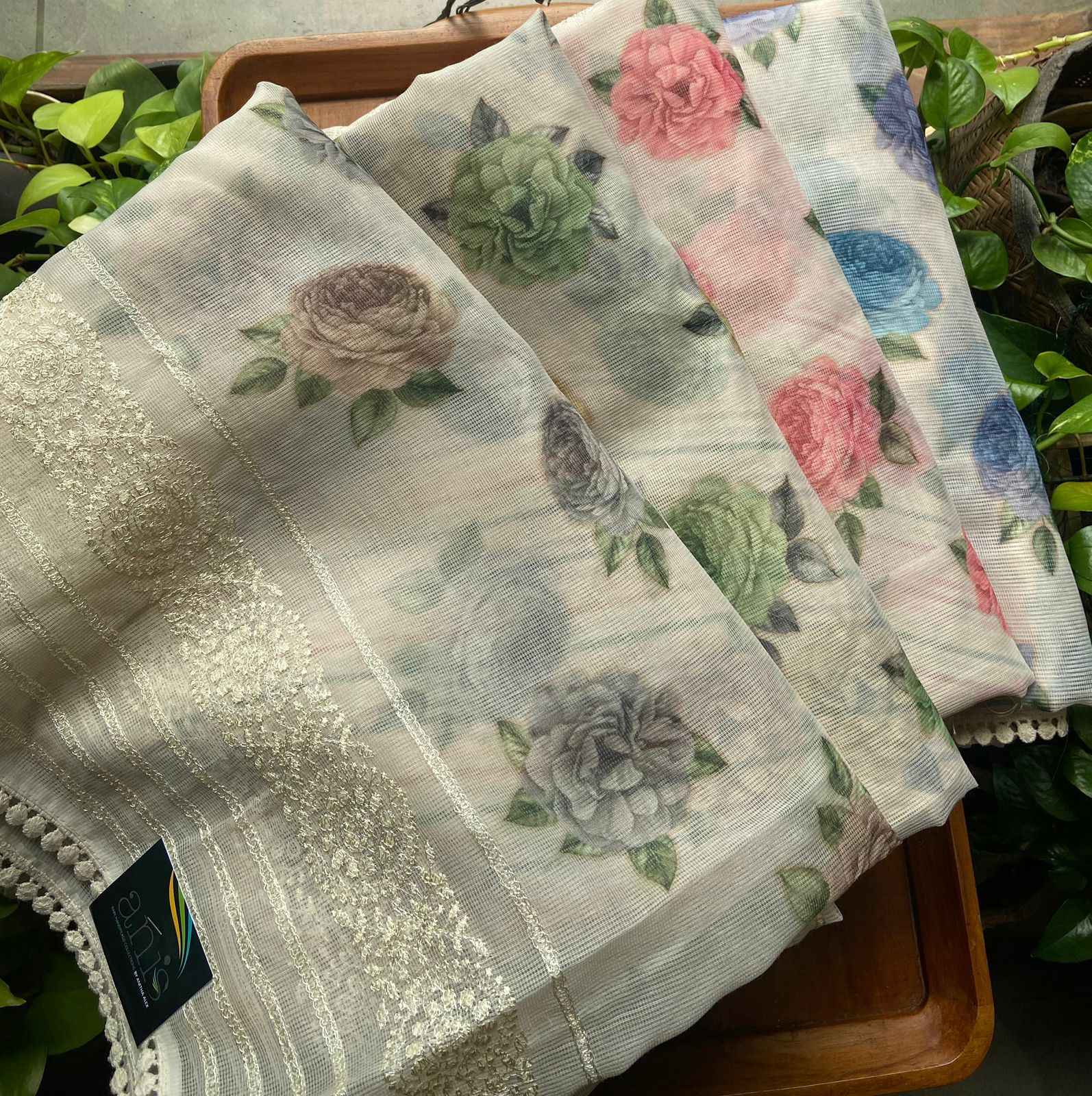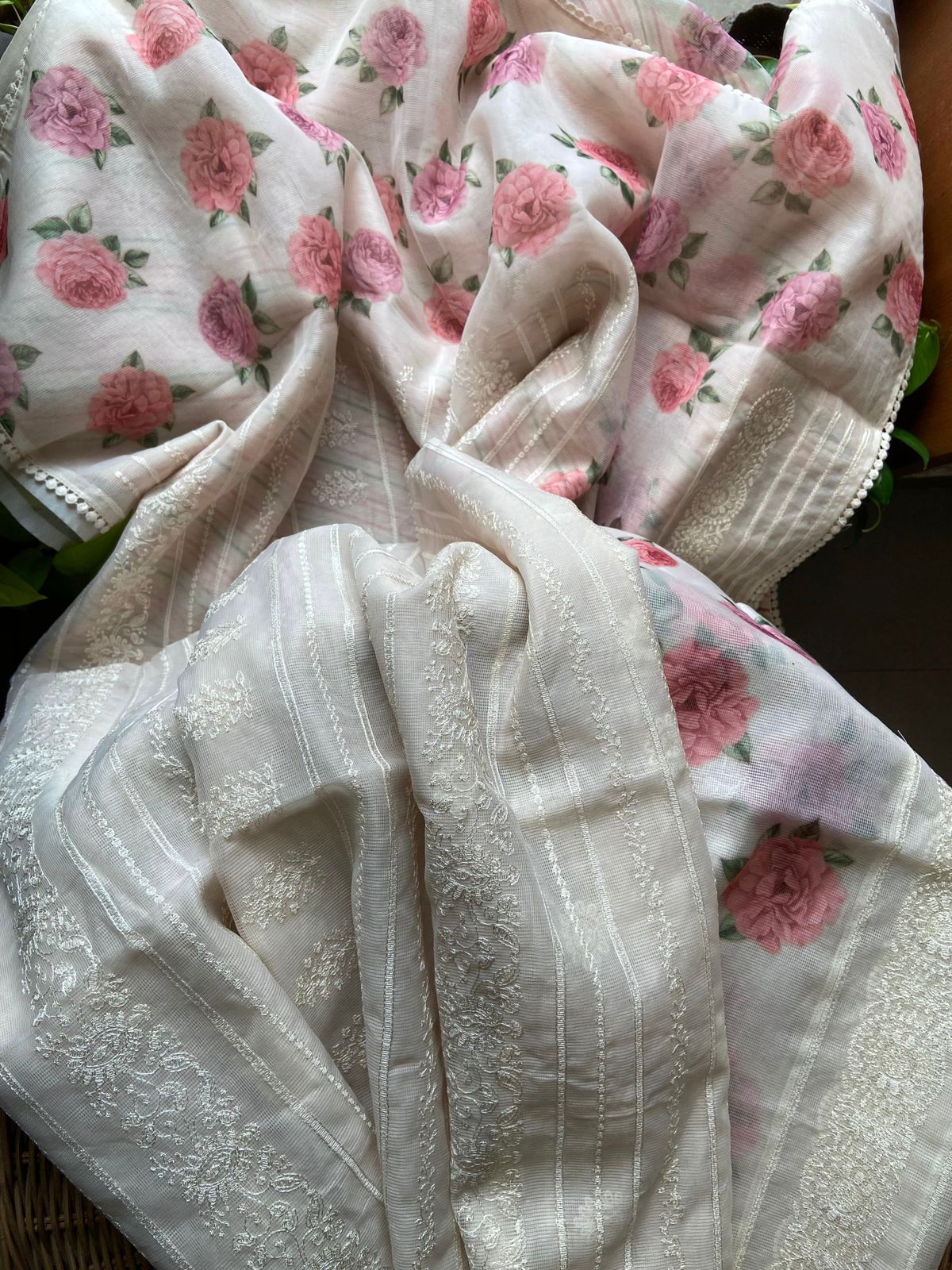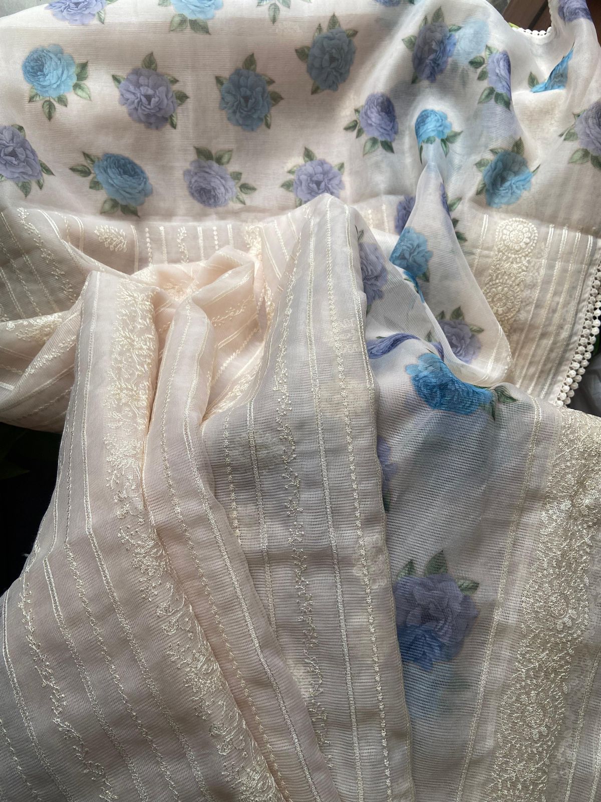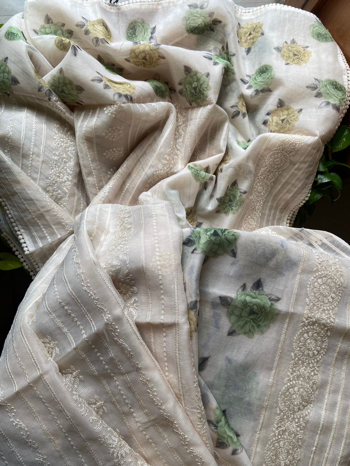 An ethereal collection of Offwhite Kota silk sarees with beautiful floral prints & Chikankari embroidery