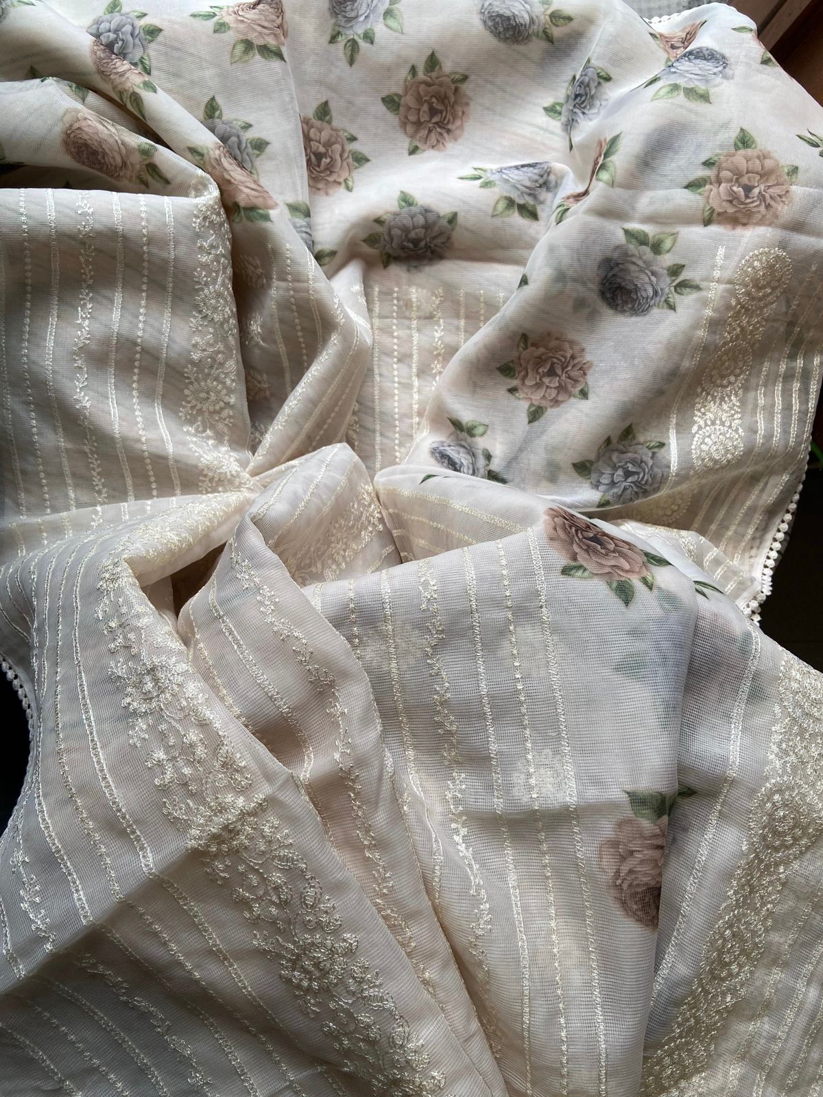 HomeSarees An ethereal collection of Offwhite Kota silk sarees with beautiful floral prints & Chikankari embroidery