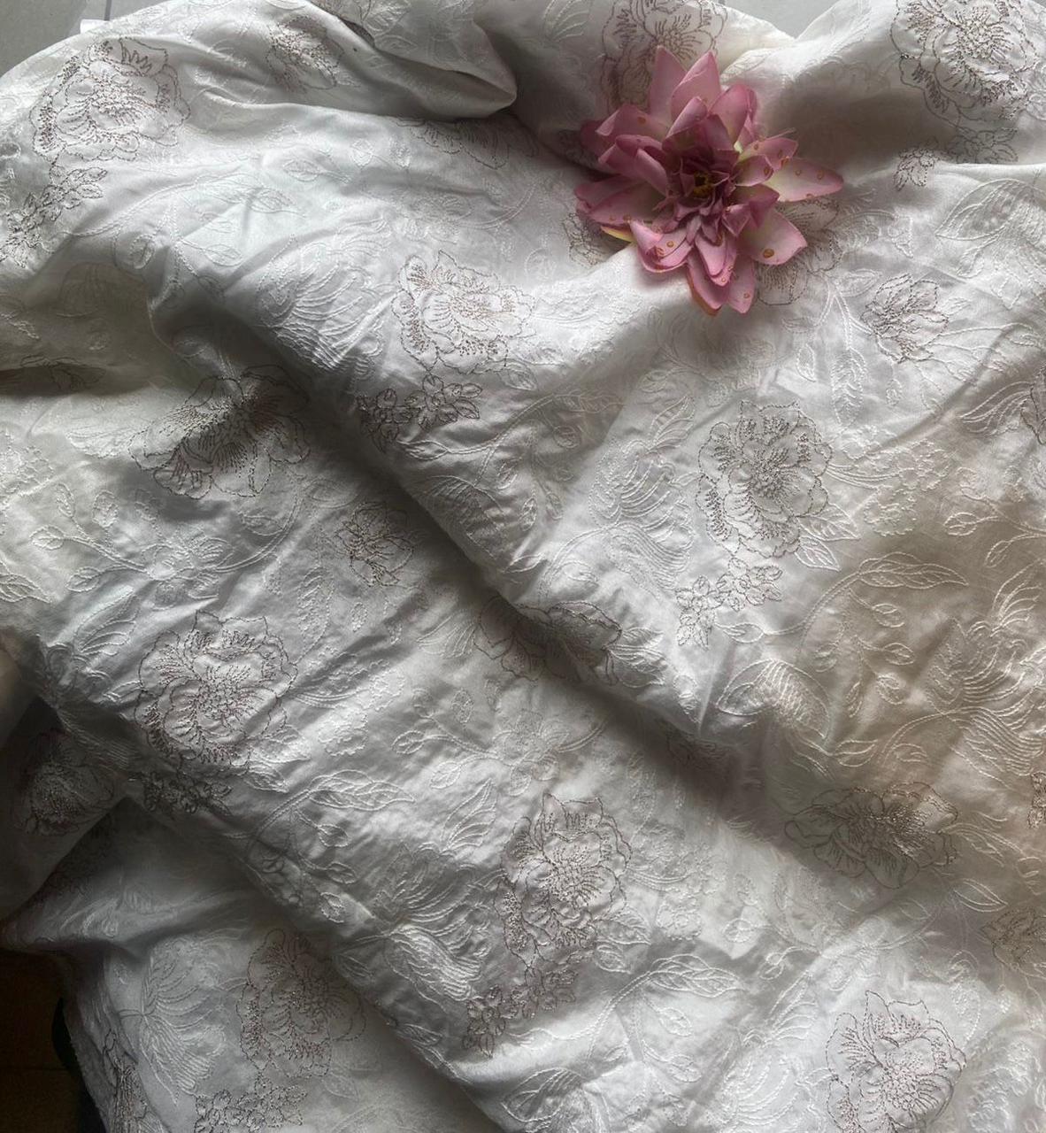 Be the first to review “An ethereal Ivory Offwhite Running fabric in pure Uppada silk with intricate Zari & threads embroidery throughout. The fabric can be cut in meterage as per your requirement. The fabric with tiny embroidery is ideal to converted as saree , suit or frock and is hand crafted on pure Uppada & is entirely dyeable to the shade of your choice” Cancel reply