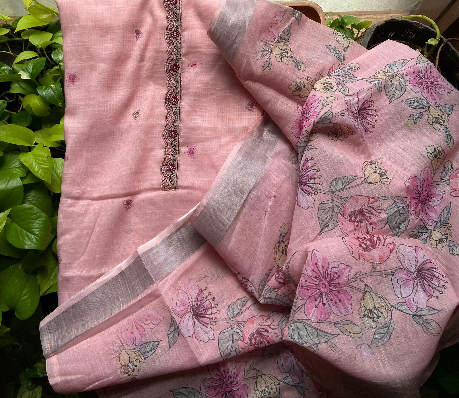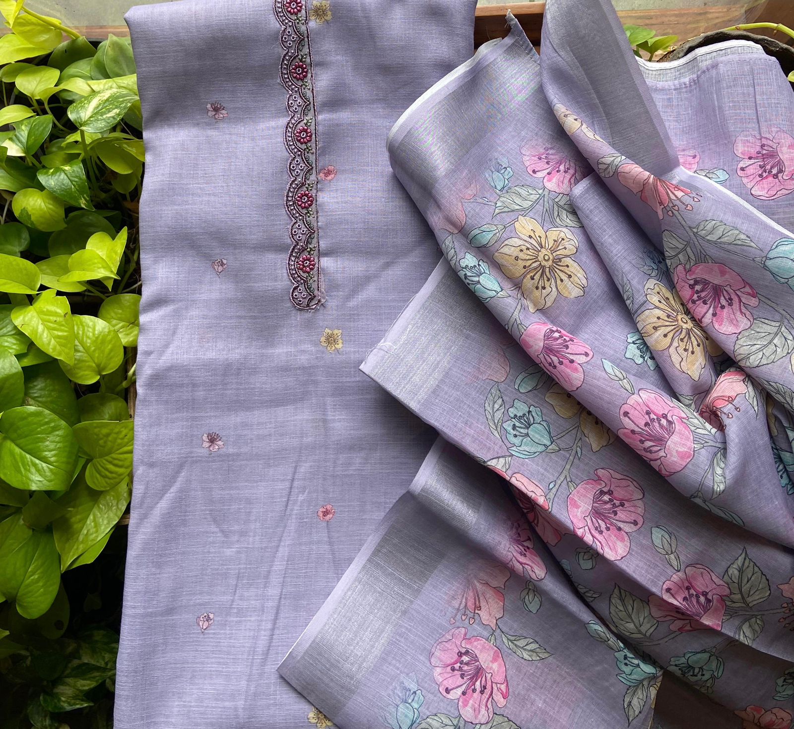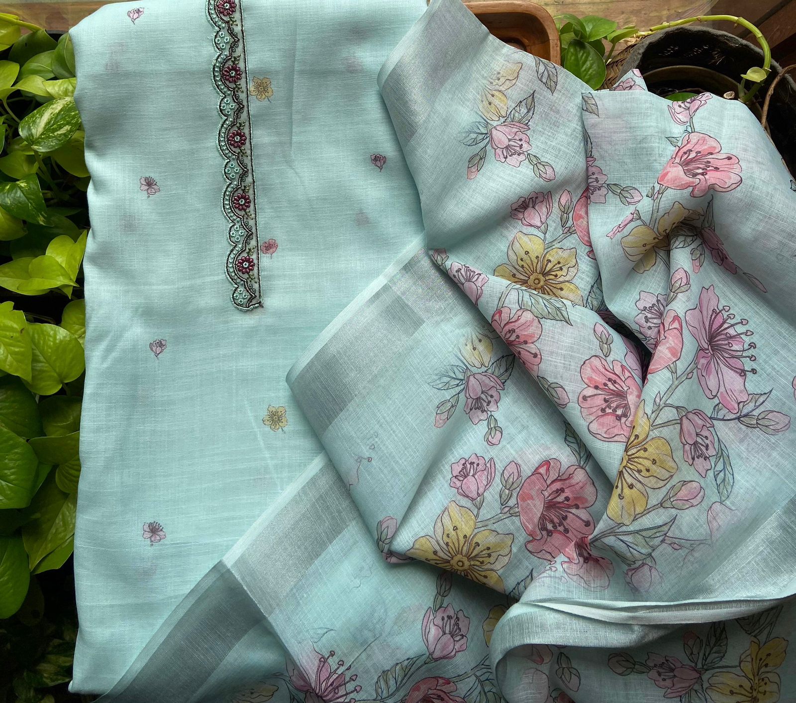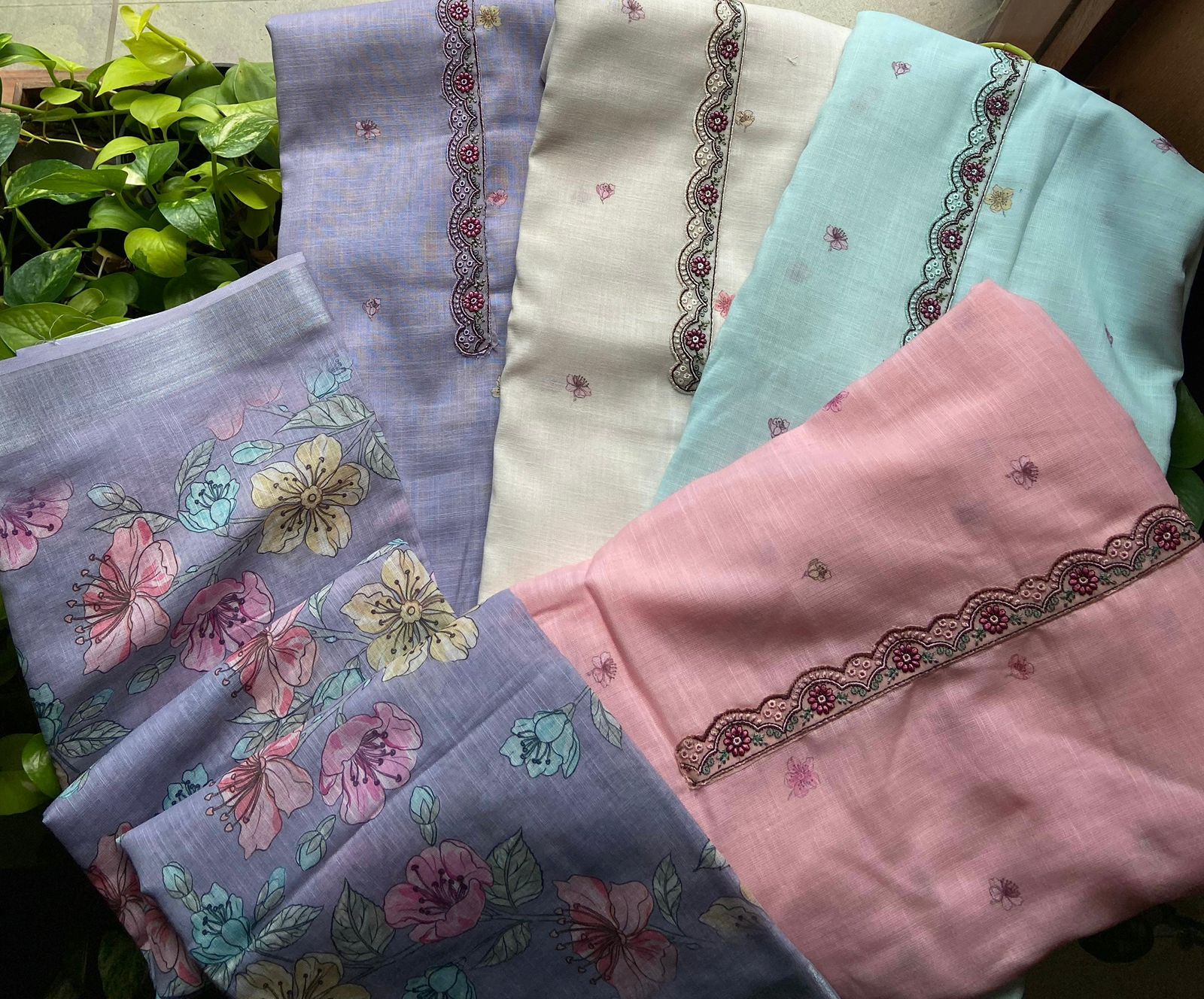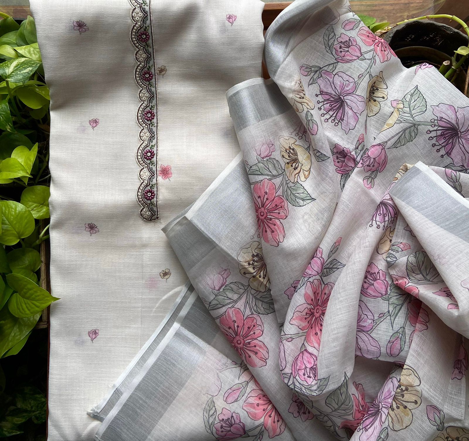 Are you looking out for a Beautiful & classy Linen Cotton Suits to add to your wardrobe ? These suits with intricate embroidery & floral prints are the perfect choice! Pure Linen cotton top with pretty floral prints & embroidery, santoon bottom & linen Duppatta with floral prints & silver Zari embroidery
