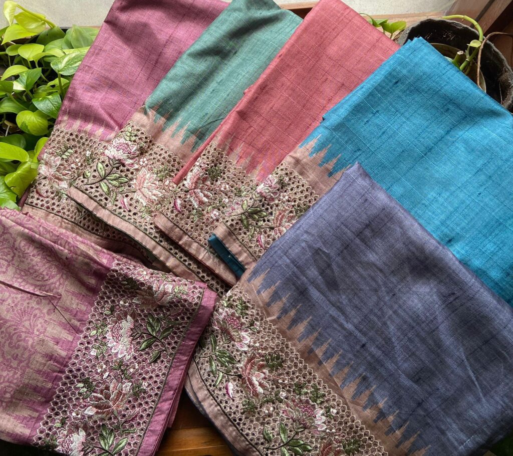 A beautiful collection of Tussar silk sarees with very elegant check weaving on entire saree & borders finished with beautiful cross stitch reminiscent floral embroidery. With blouse pure Benarasi silk