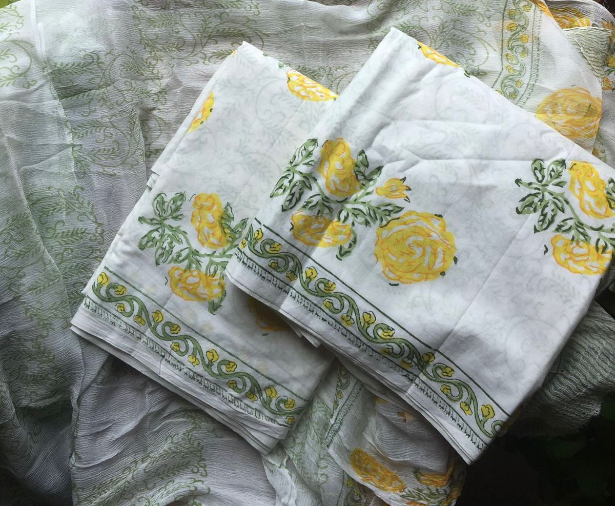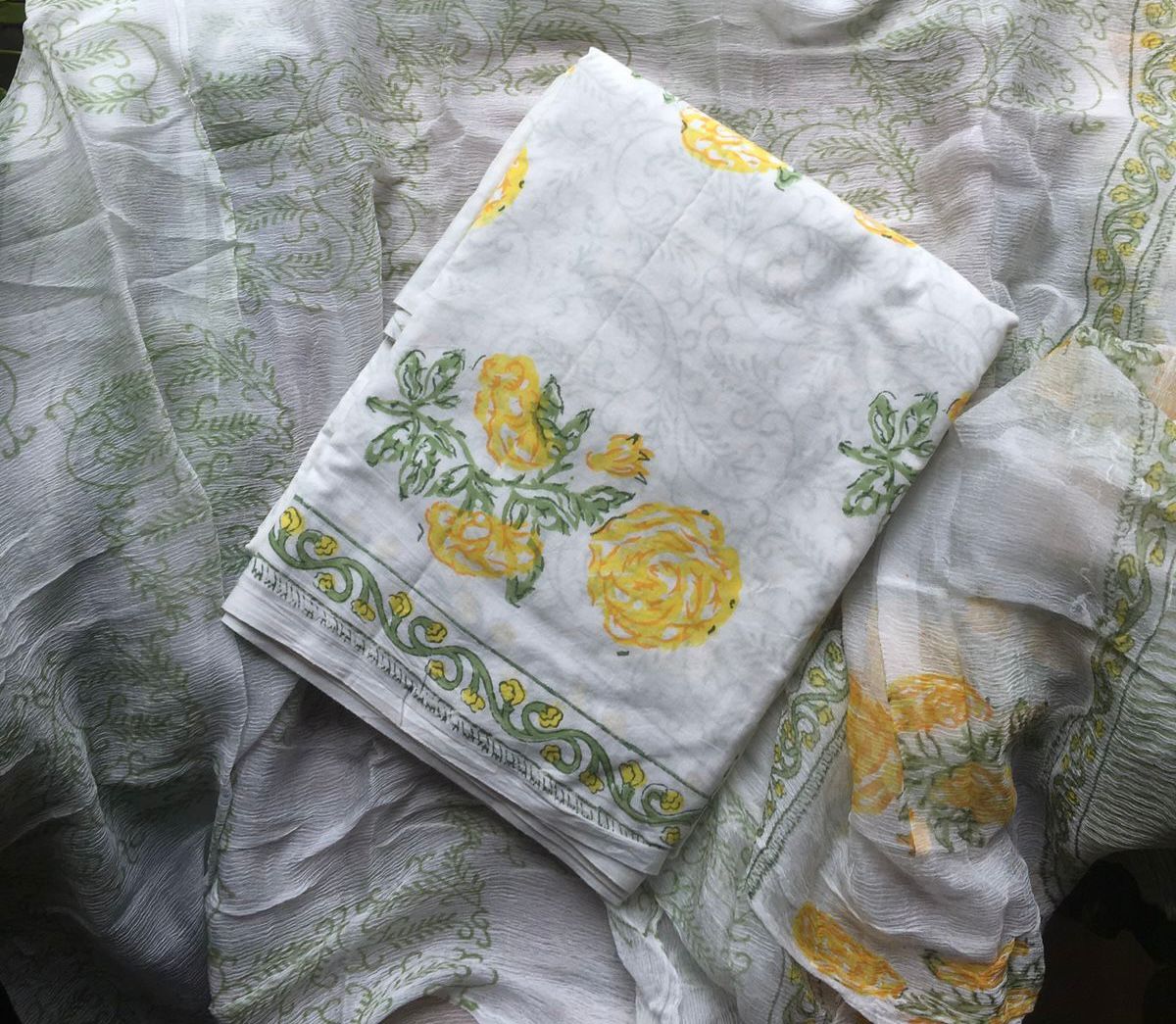 Are you looking out for a Beautiful Cotton Suits to add to your wardrobe ? These lovely cottons are the perfect choice! Pure cotton top with beautiful block prints & borders for styling , cotton bottom & chiffon Duppatta