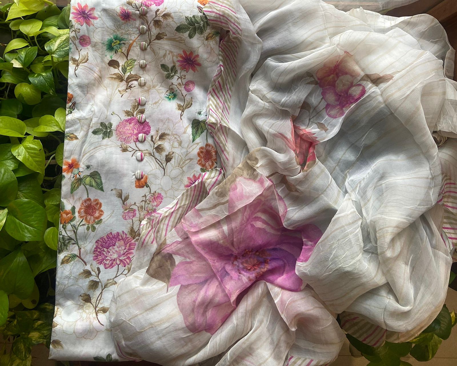 Are you looking out for a Beautiful Floral Suit to add to your wardrobe ? These suits with gorgeous floral prints are the perfect choice! Pure muslin cotton top with pretty floral prints , cotton bottom & chiffon Duppatta with floral prints