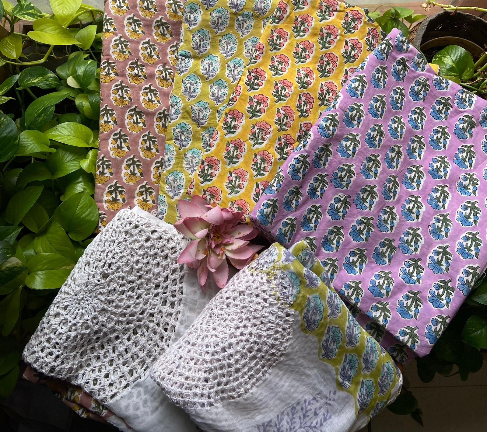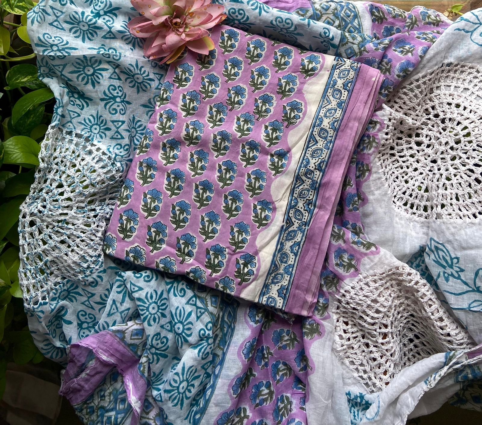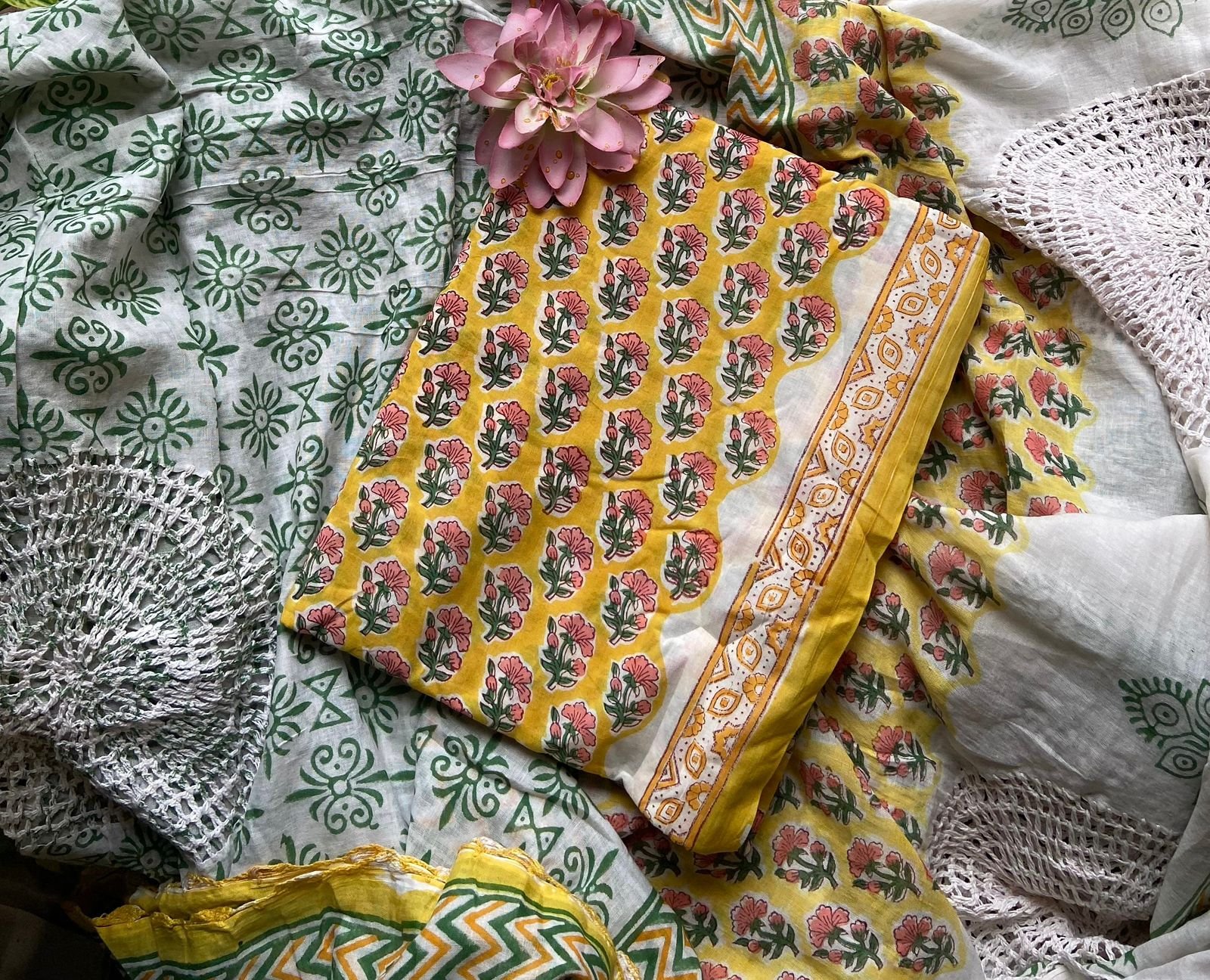 Are you looking out for Beautiful cotton suits to add to your wardrobe ? These suits with beautiful floral prints is the perfect choice! Pure cotton top with pretty floral prints , printed cotton bottom & pure Mal duppatta with floral prints& hand crochet