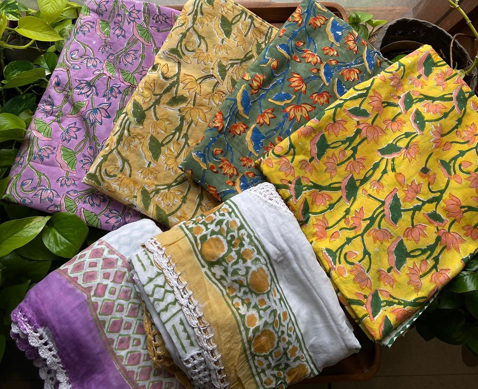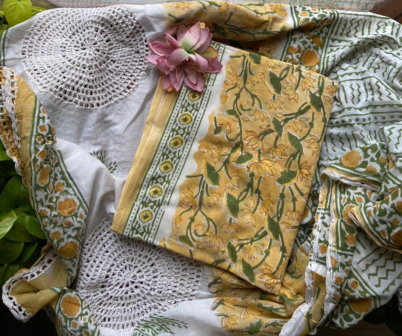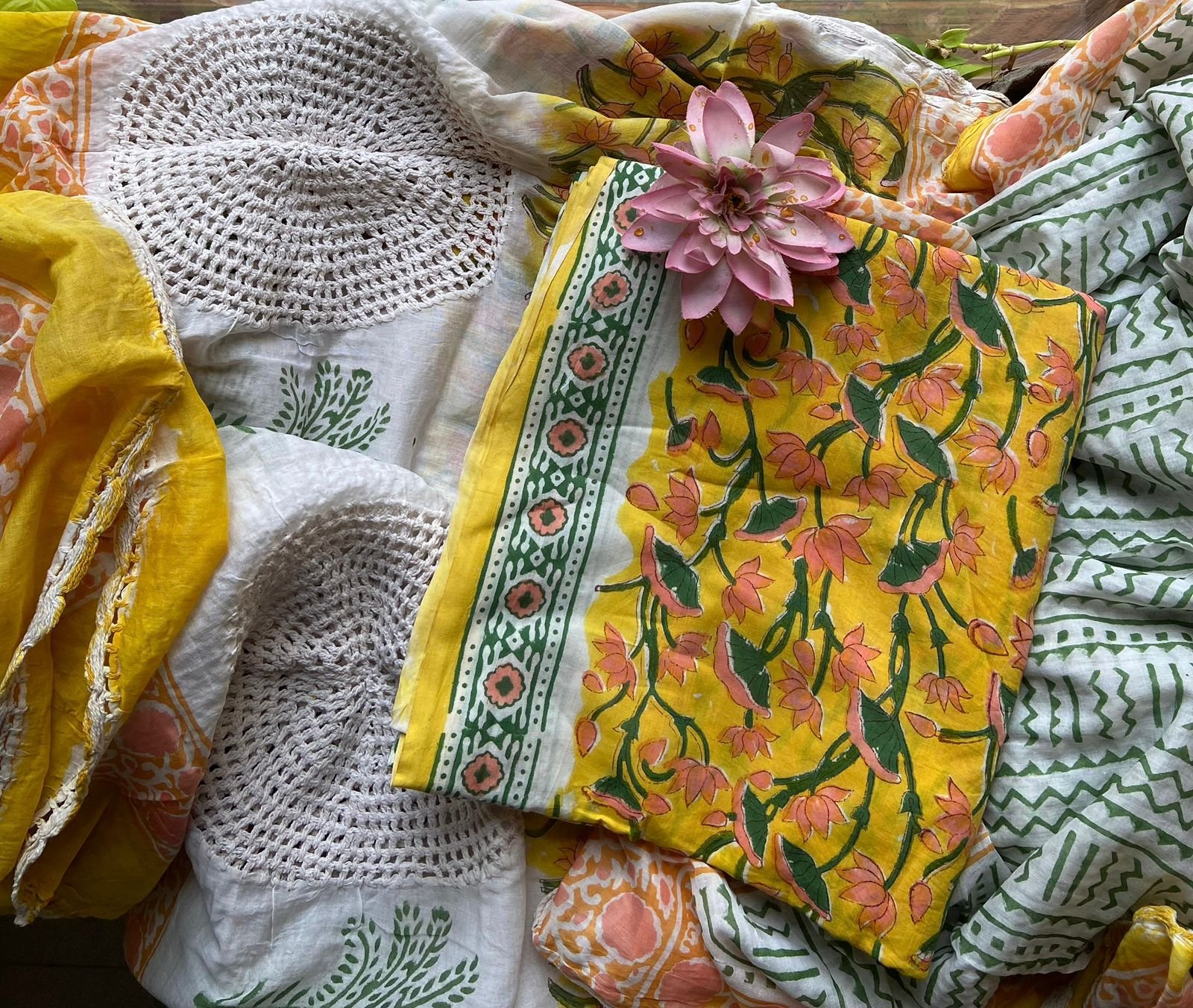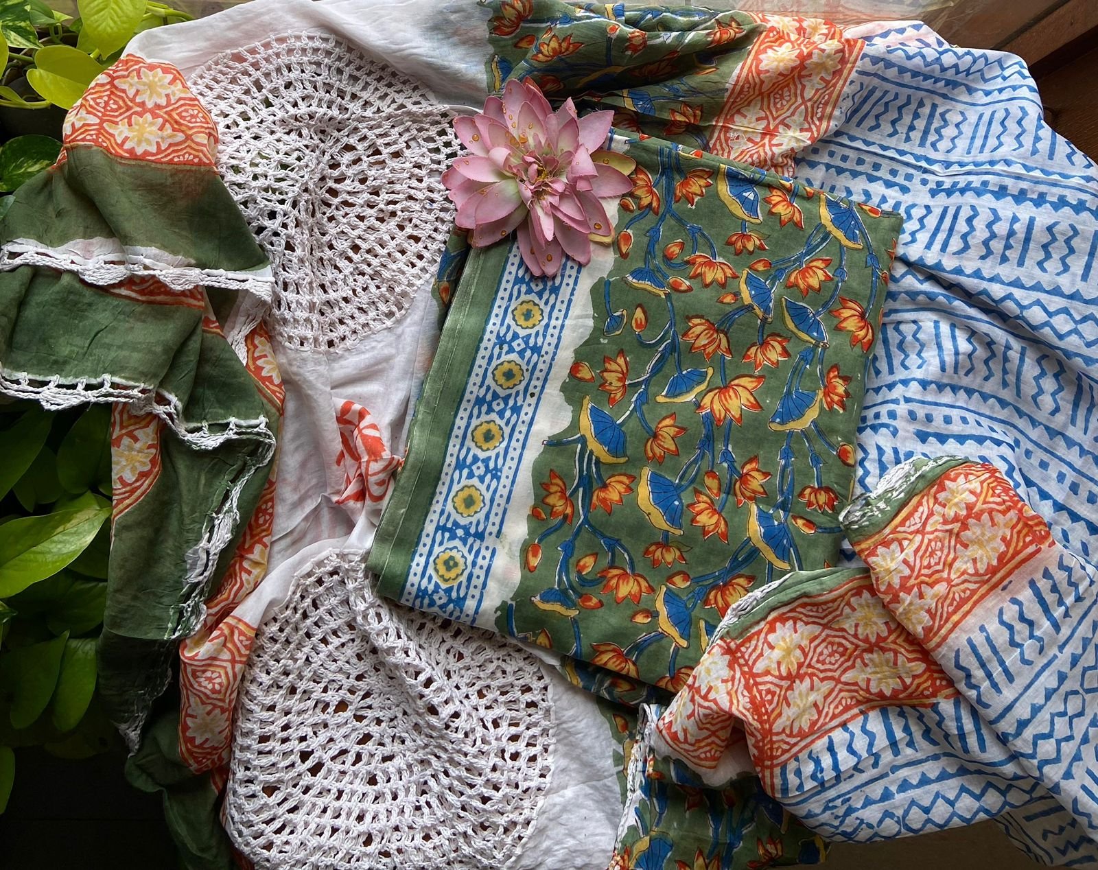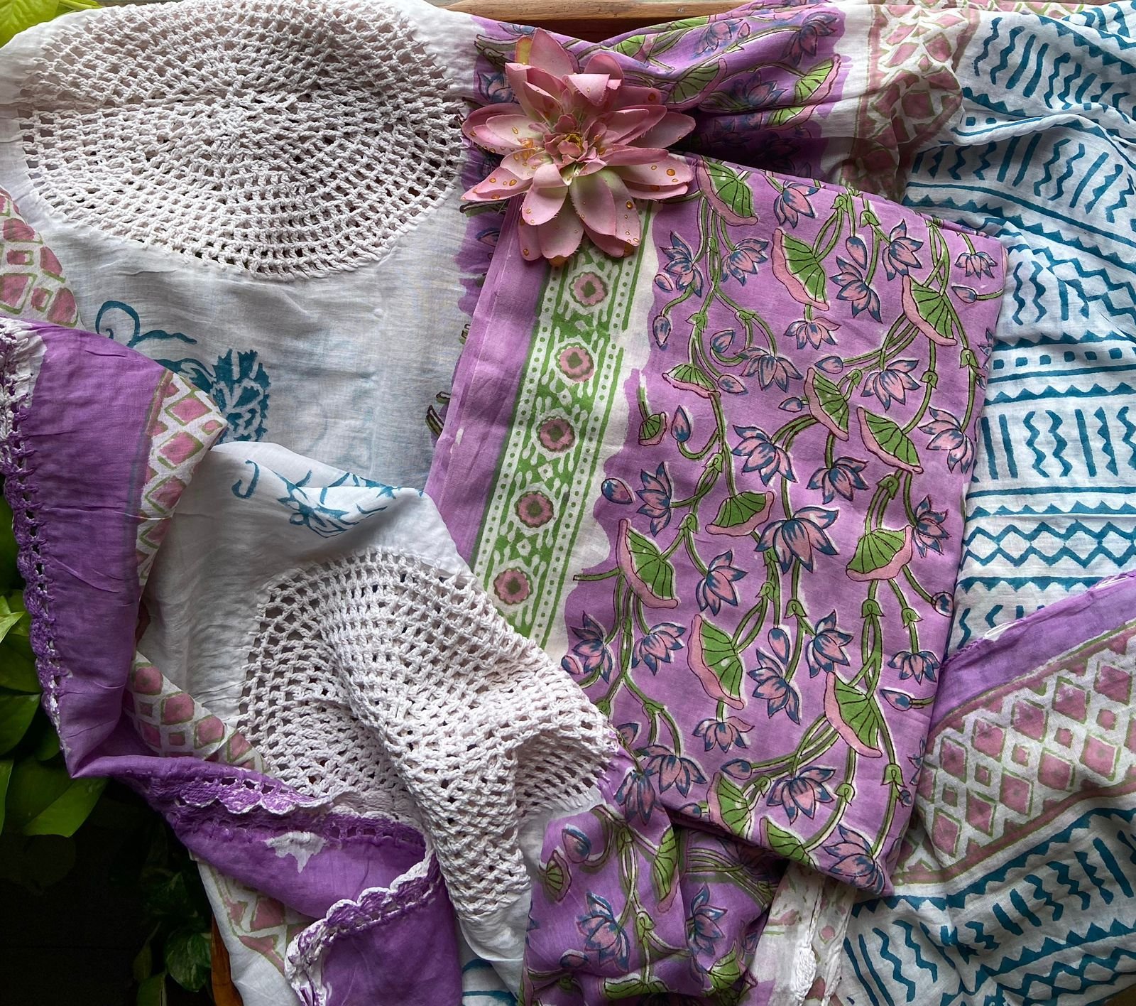 Are you looking out for Beautiful cotton suits to add to your wardrobe ? These suits with beautiful floral prints is the perfect choice! Pure cotton top with pretty floral prints, printed cotton bottom & pure Mal duppatta with floral prints & hand crochet