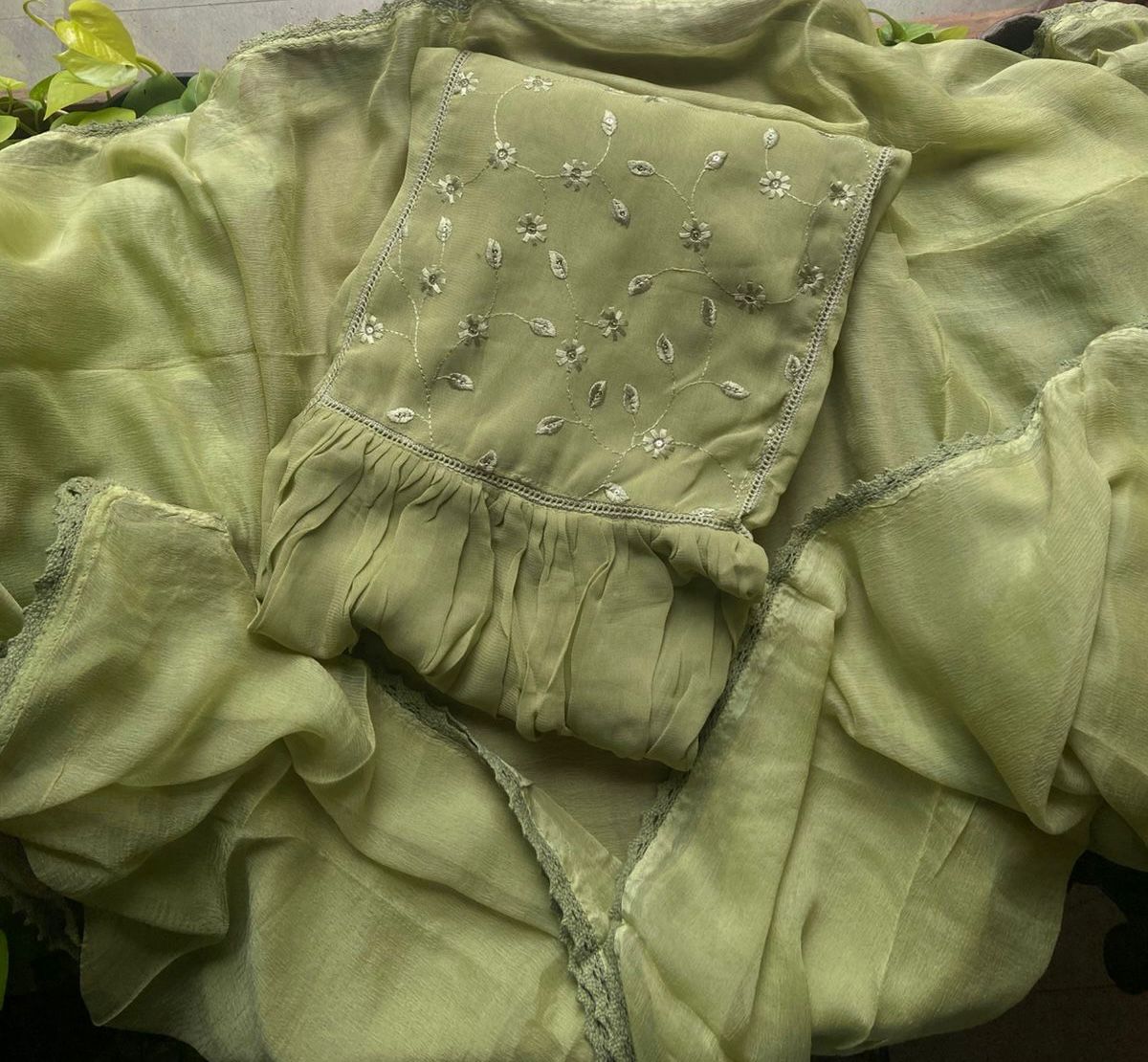 Presenting out Brand New Collection for Onam at a Special Price of ₹1499/- curated on Chiffon woth Cutwork and beautiful floral embroidery! Ethereal hues of Pink, Pearl Green, Ivory gold, Dusty pink & Jet black on Chiffon top and Duppatta with floral embroidery & Cutwork. The floral embroidery design is created to resemble pearl embroidery. Bottom is cotton silk