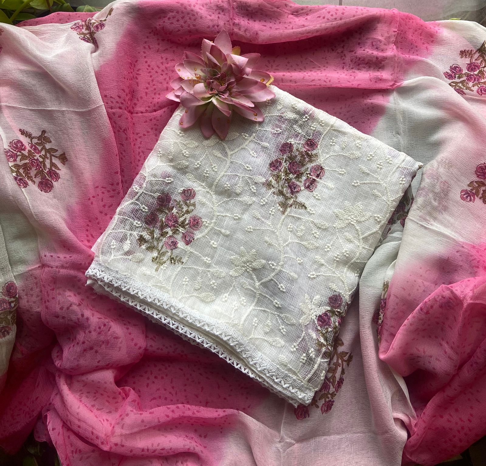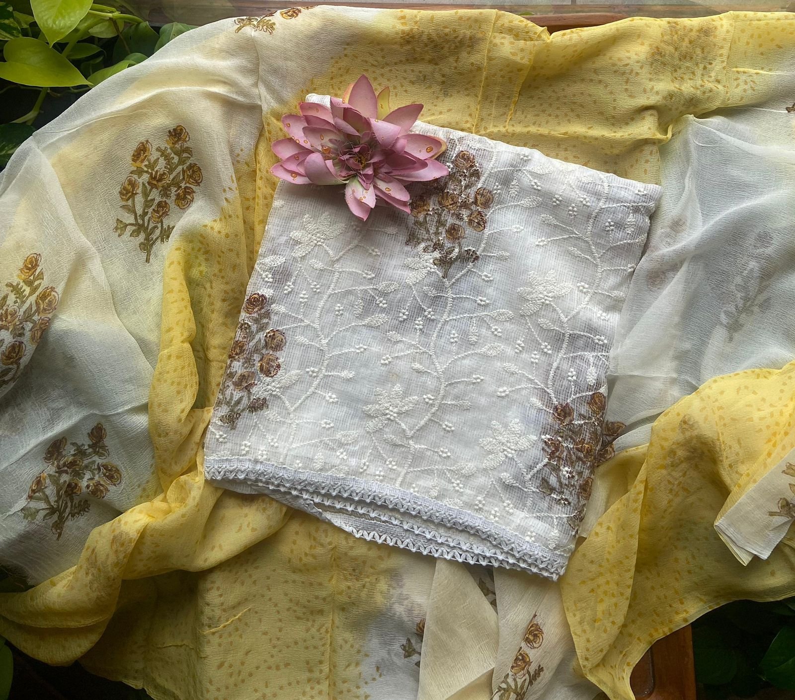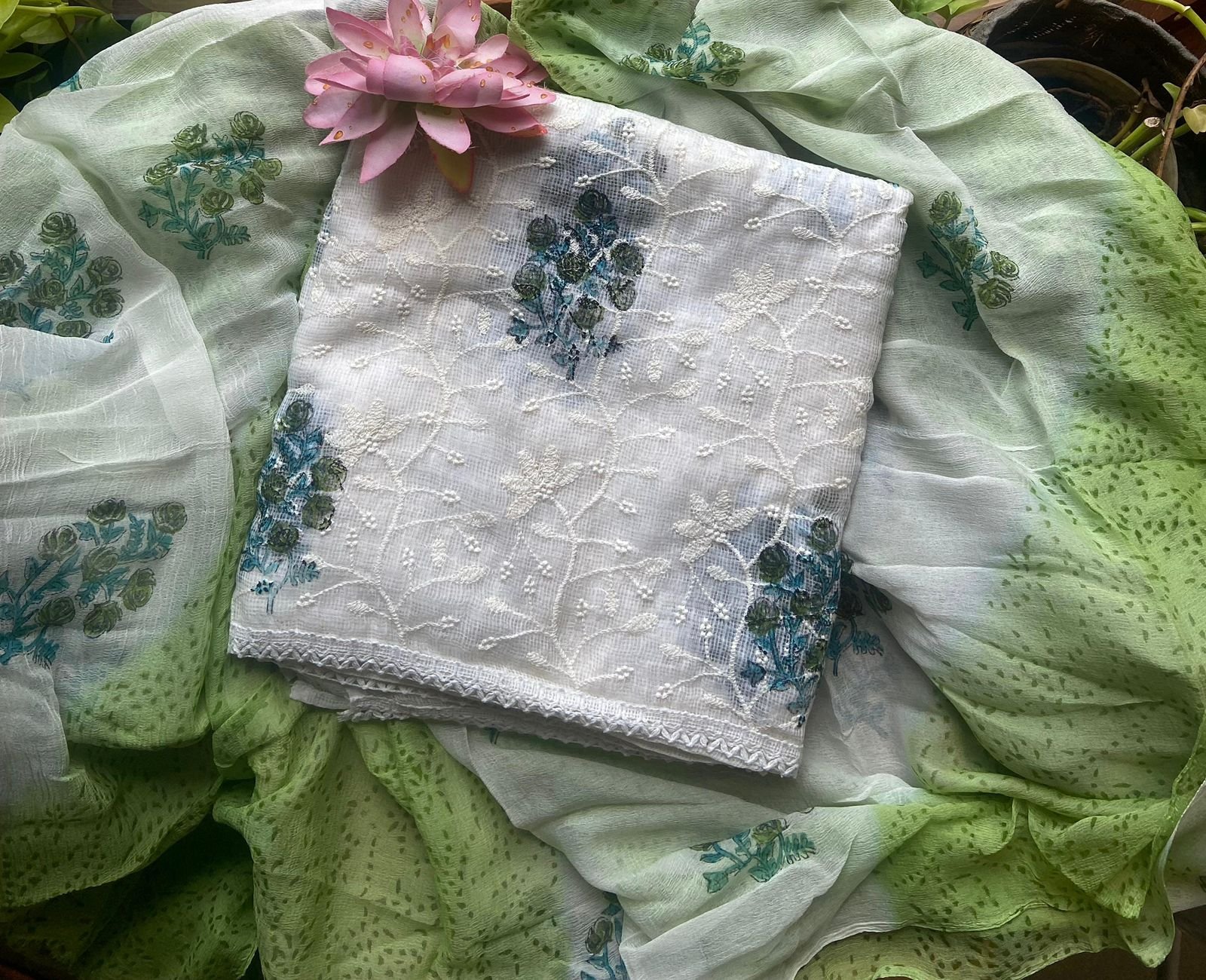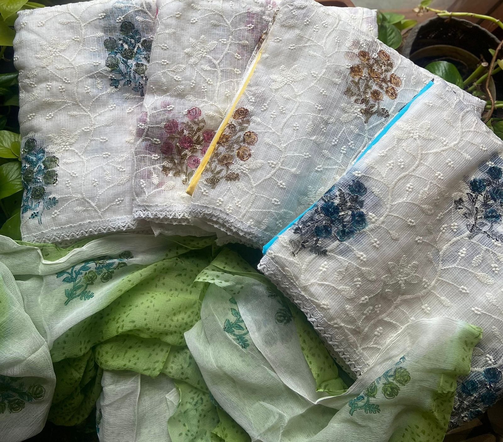 A beautiful collection in pure linen top and Duppatta with silver Zari borders and exquisite hand embroidery and cotton bottom