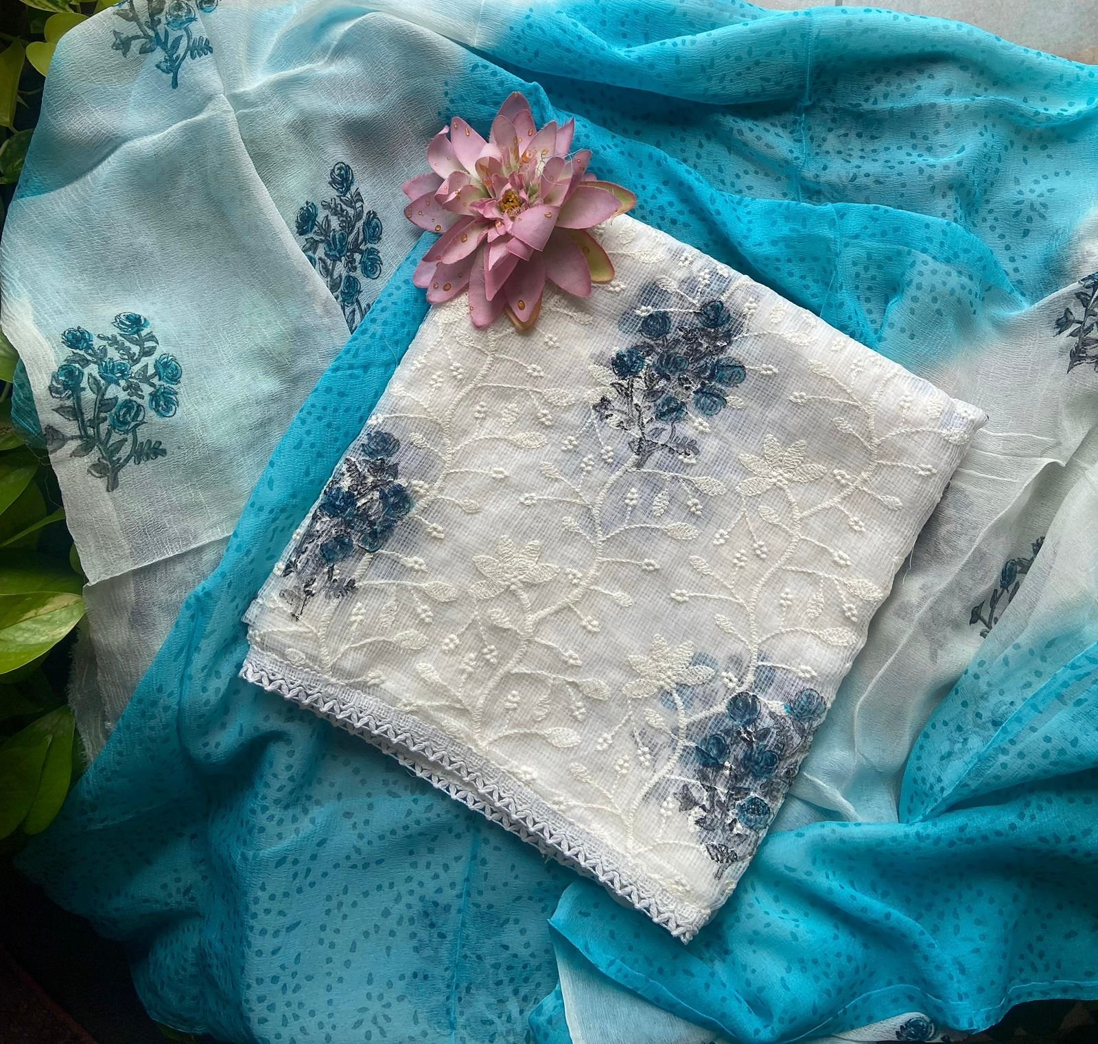 Beautiful, stunning & trending Pure Georgette Designer Suits with exquisite French lace detailing on top & Duppatta
