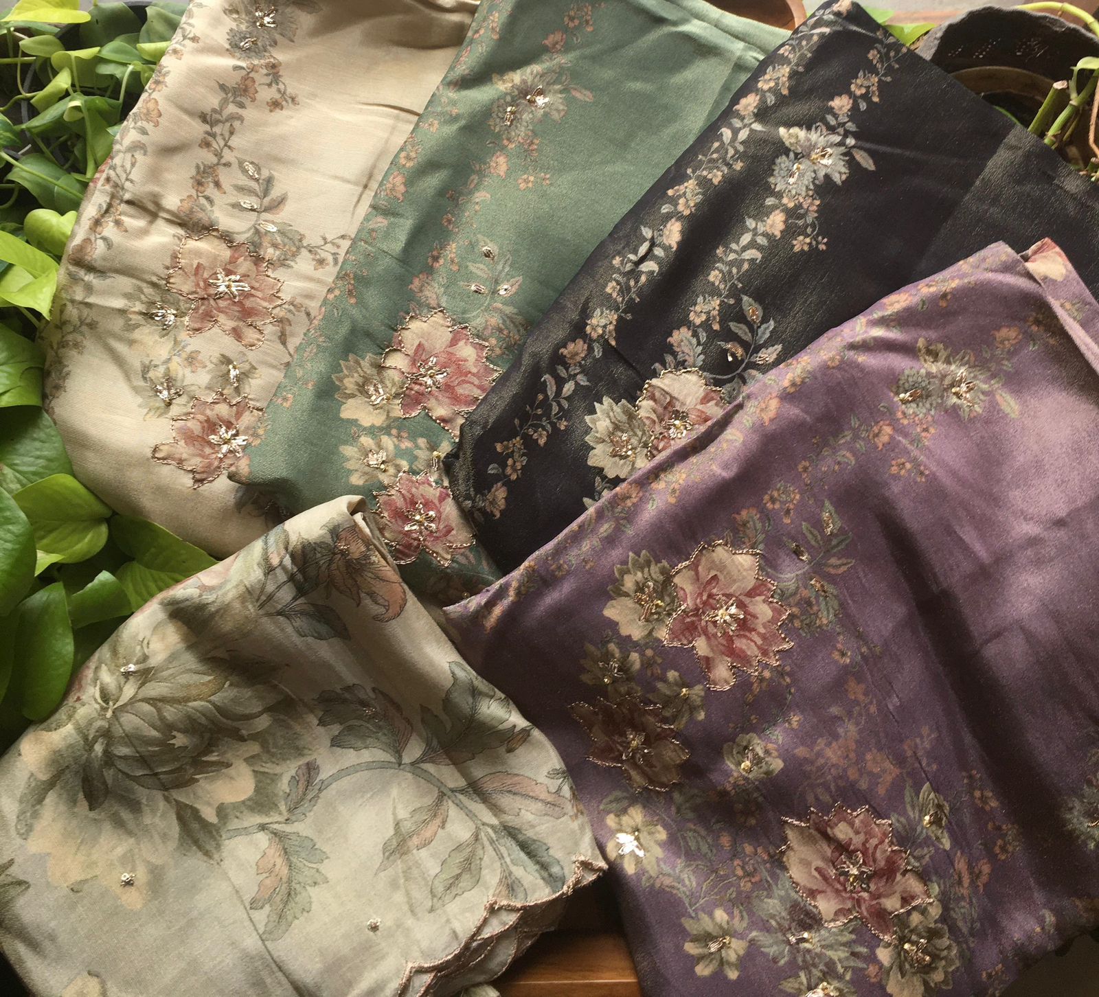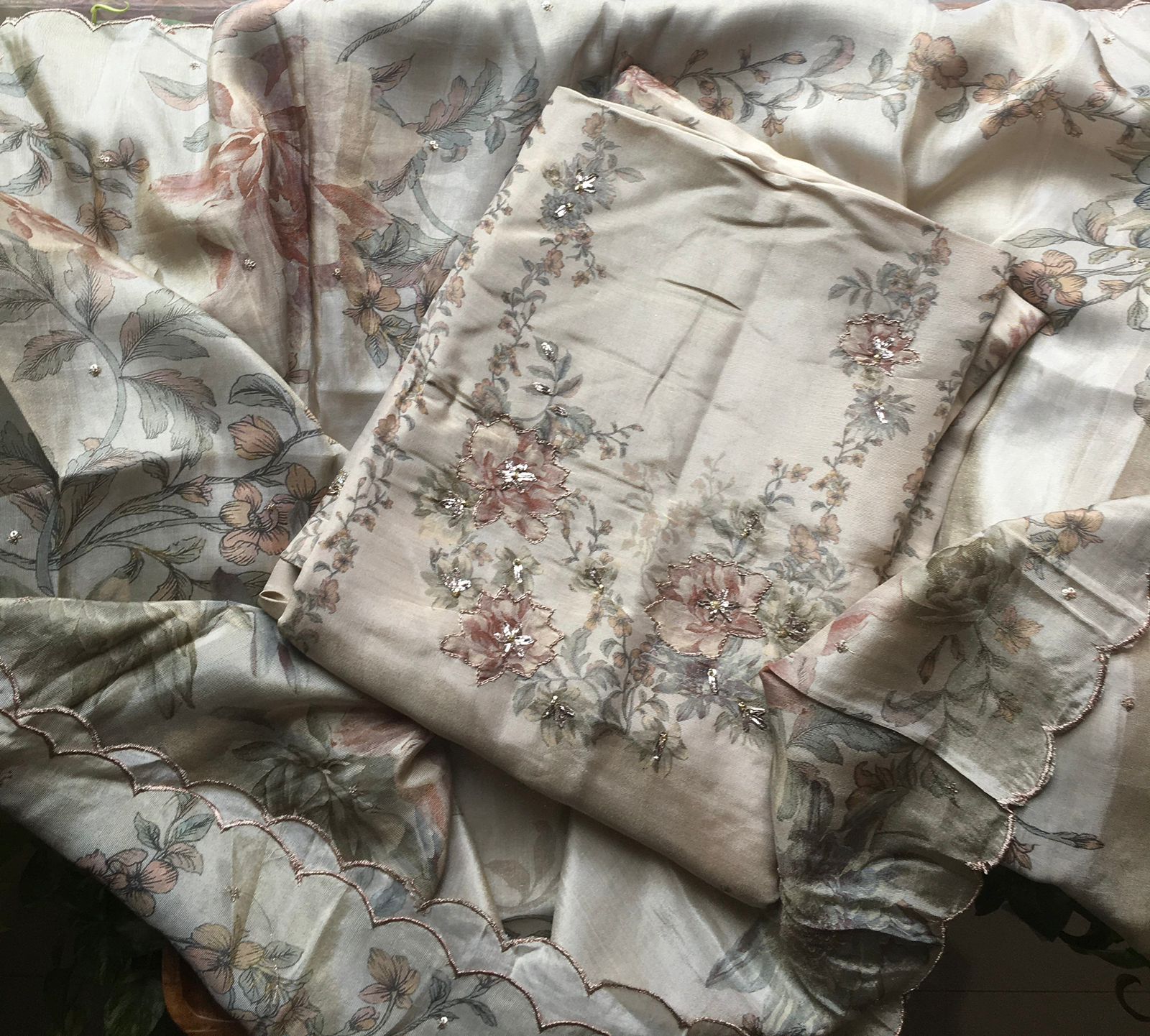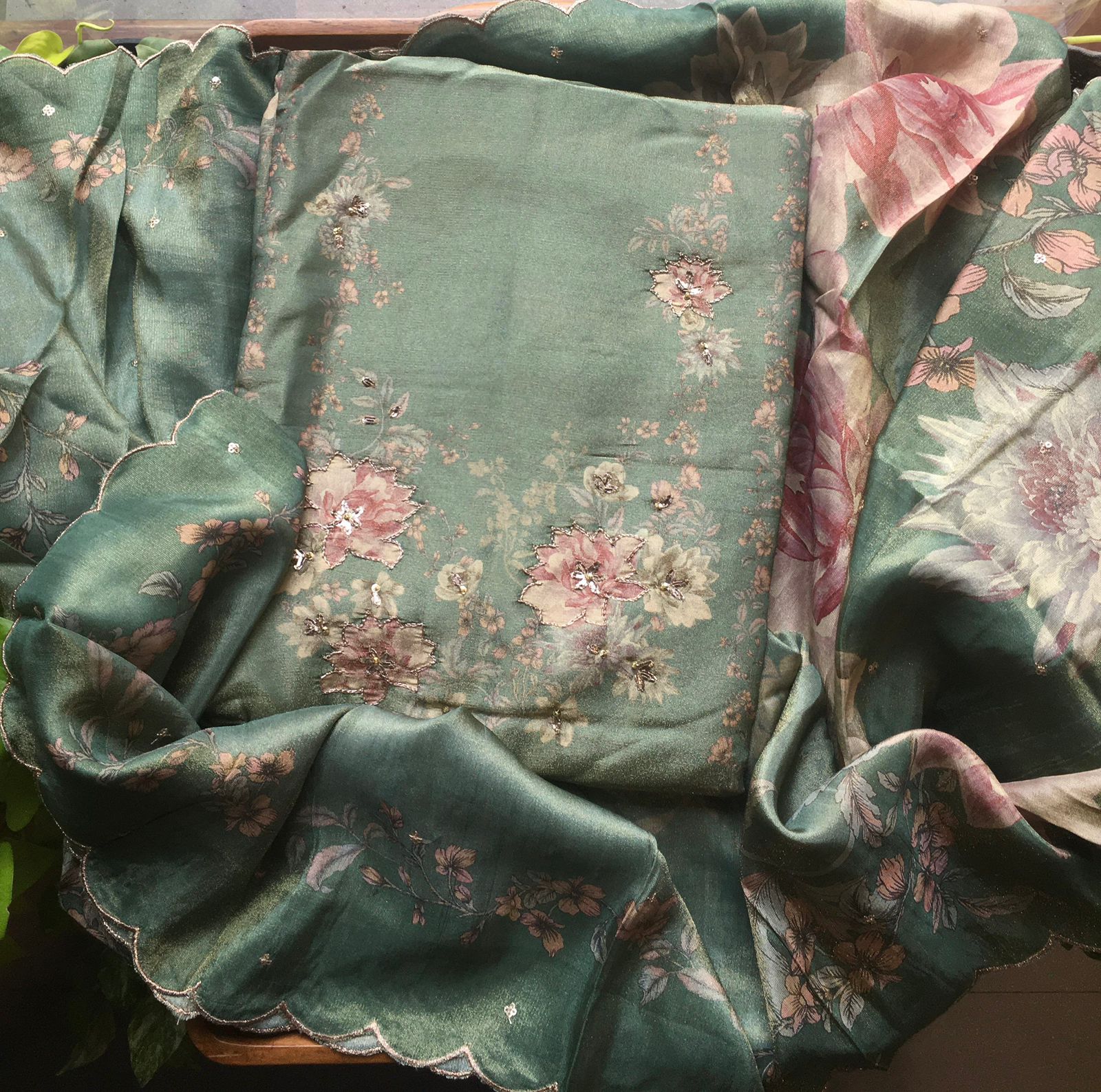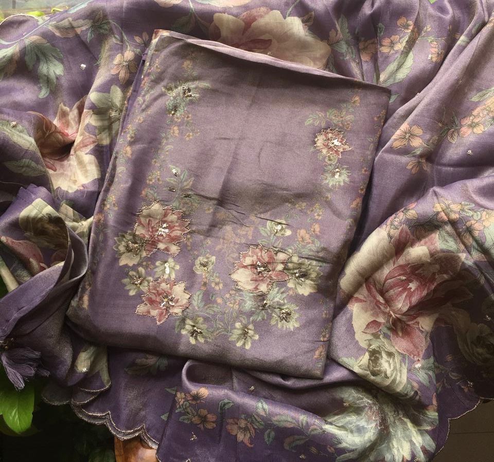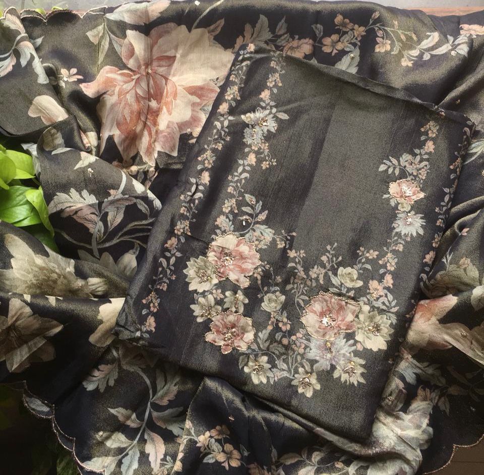 Are you looking out for Beautiful Floral Suits to add to your wardrobe ? These beautiful Tissue Silk Suits are the perfect choice ! Pure tissue silk top & Duppatta with gorgeous floral prints & Zari embroidery detailing & santoon bottom
