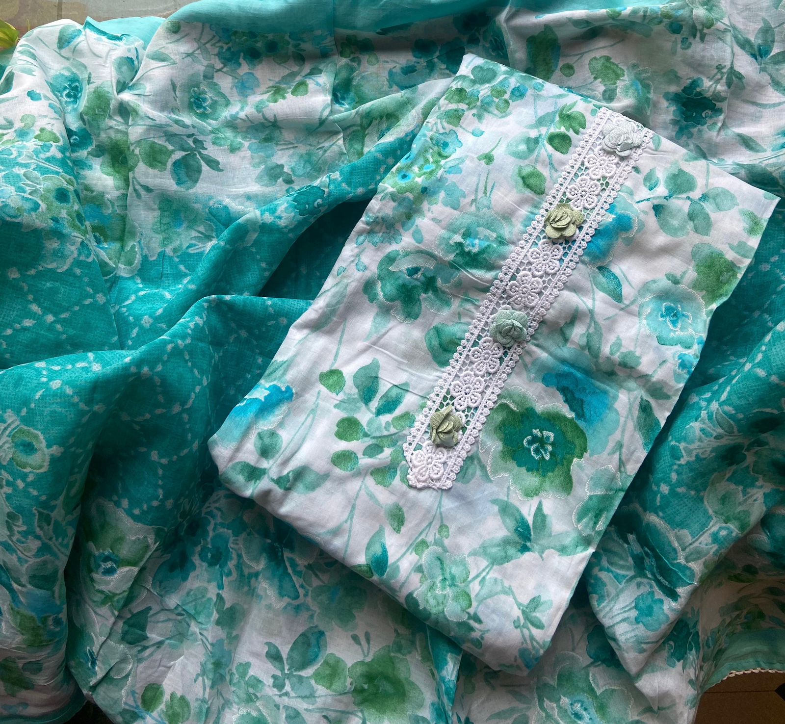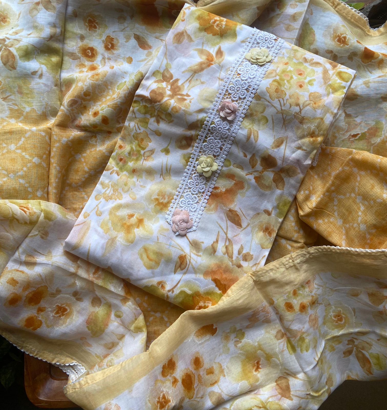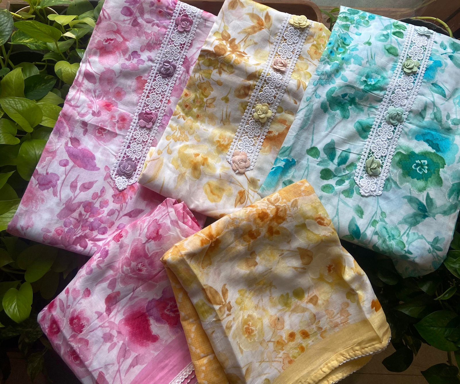 Are you looking out for beautiful florals to add to your summer wardrobe ? These beautiful floral cottons are the perfect choice. Pure cotton top & Duppatta with floral prints & cotton bottom