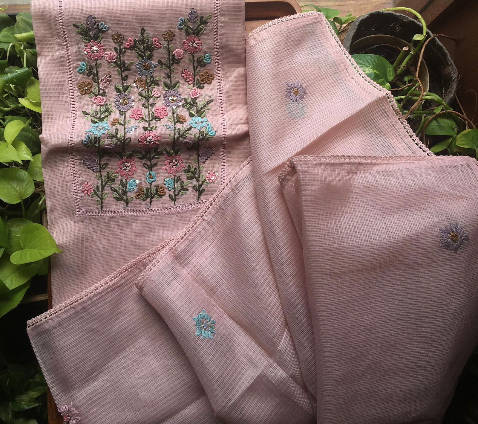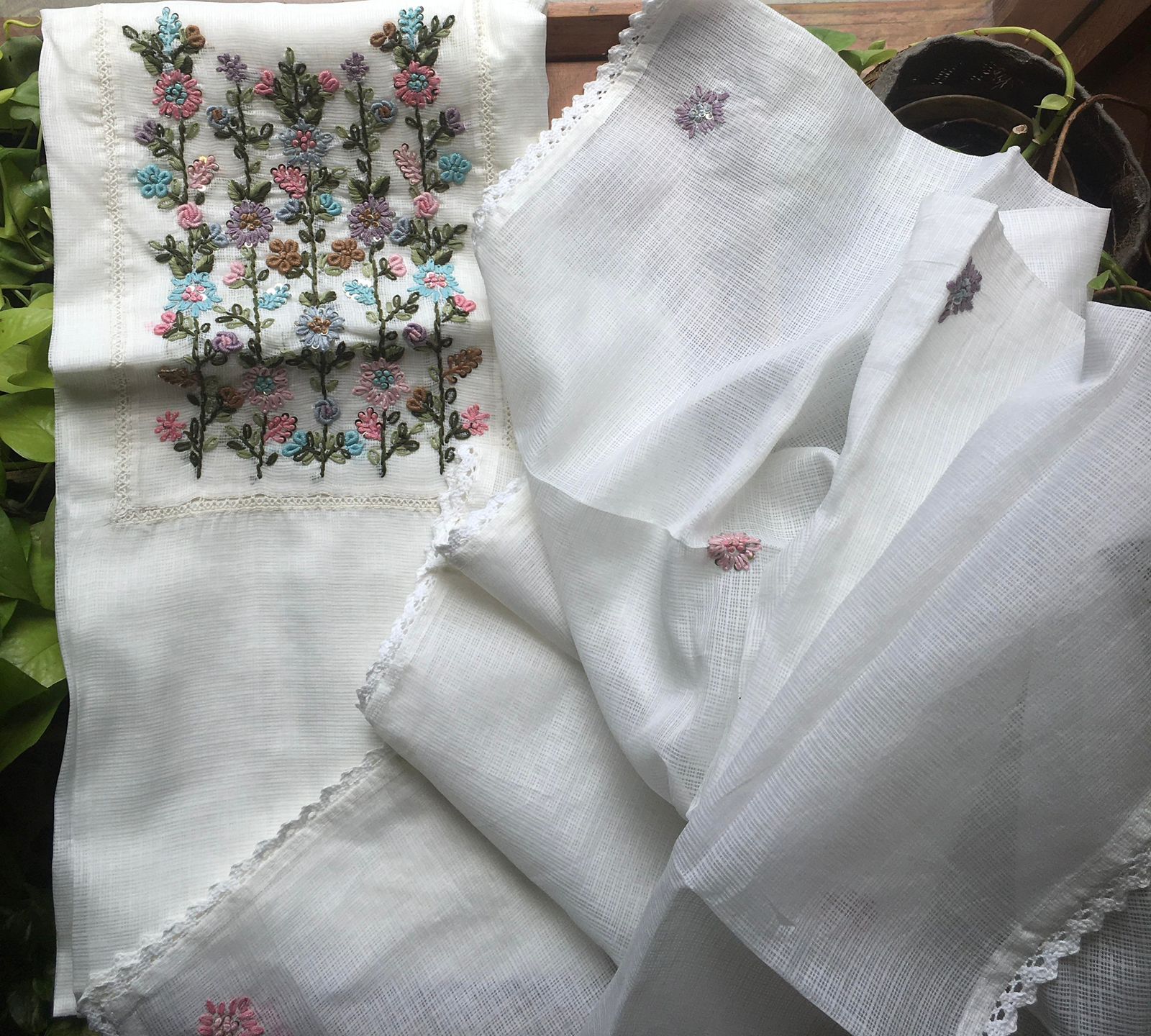 A beautiful collection in pure linen top and Duppatta with silver Zari borders & exquisite hand embroidery & cotton bottom