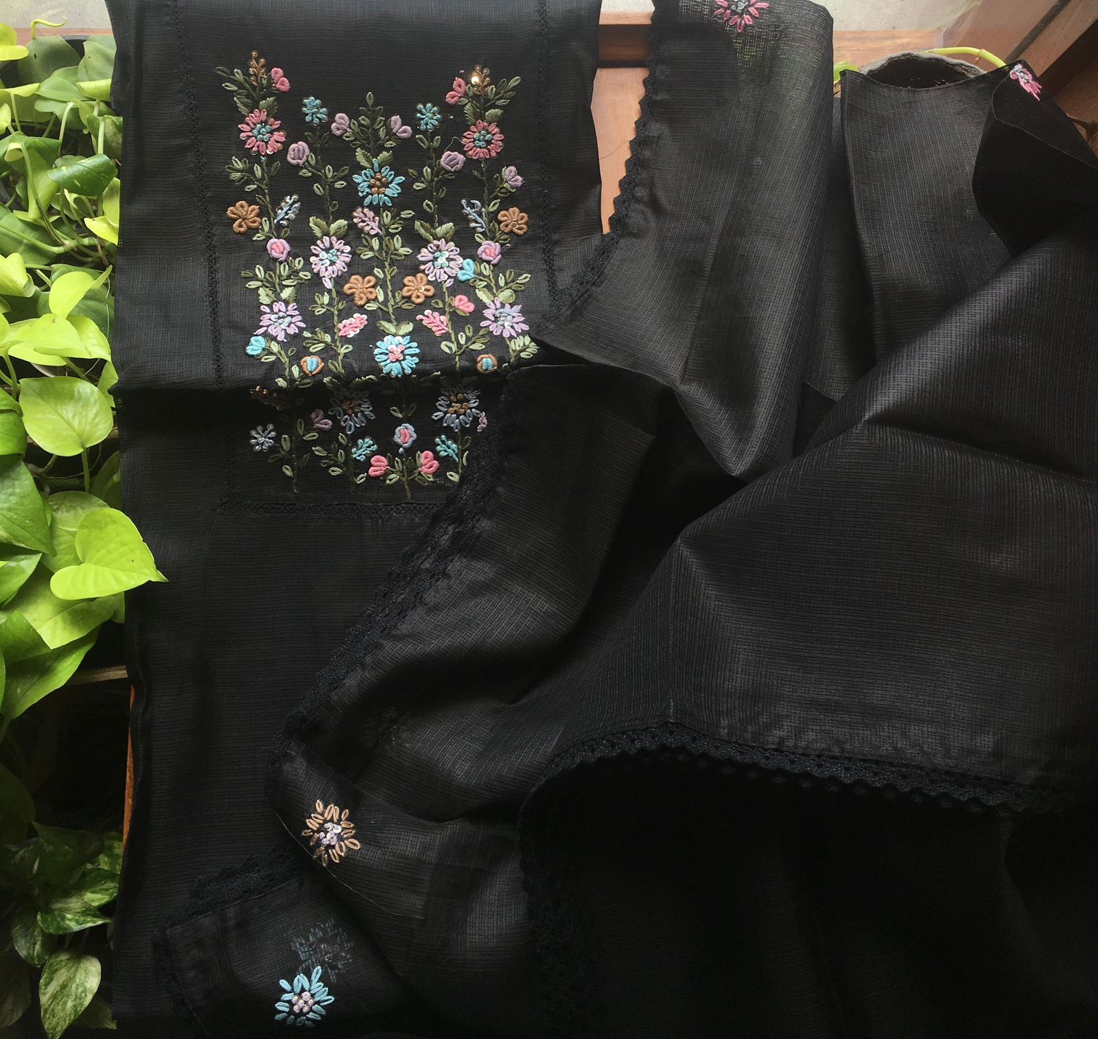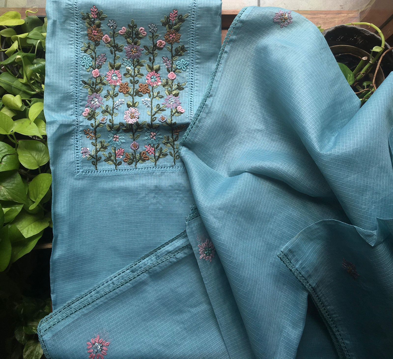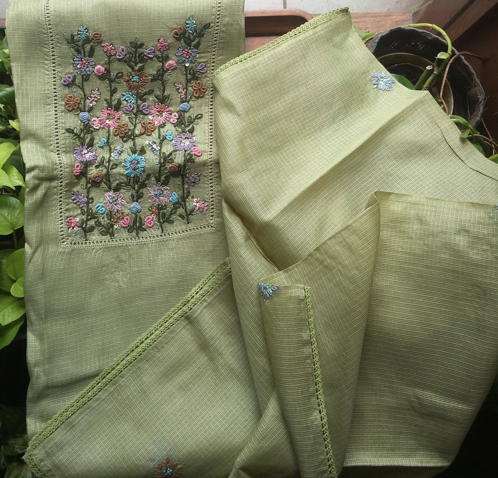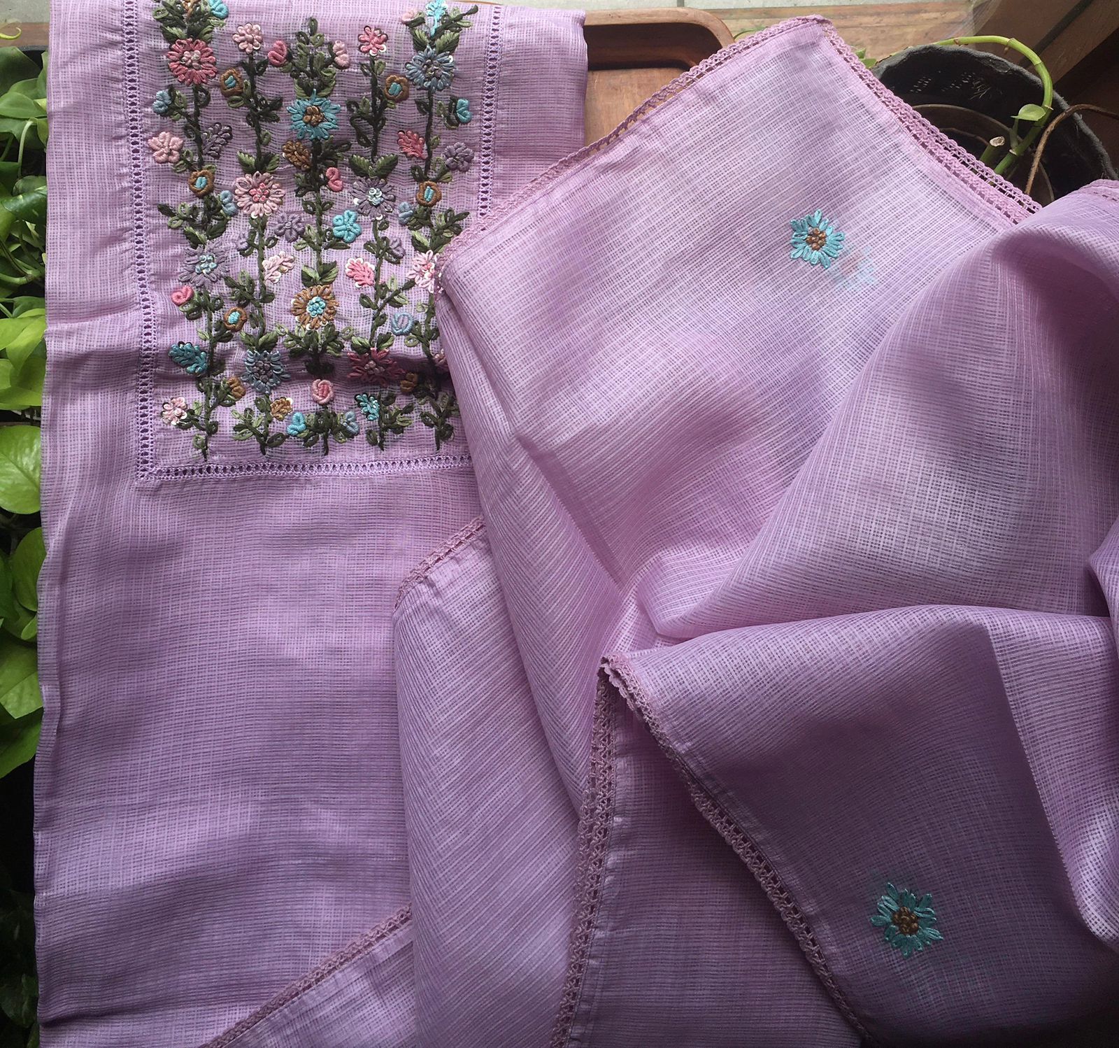 Are you looking out for Beautiful Handworked Kotas to add to your wardrobe ? Pure Kota silk top &  Duppatta with intricate hand embroidery detailing all along & cotton bottom