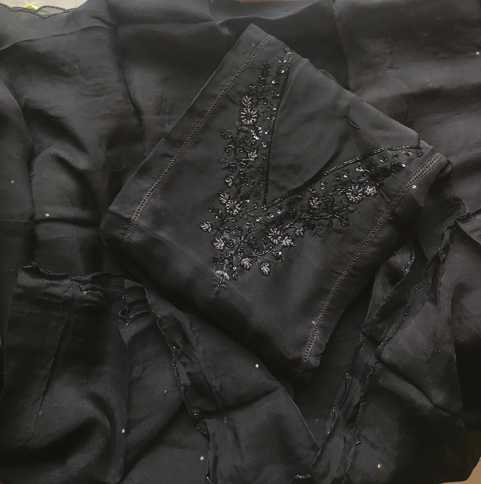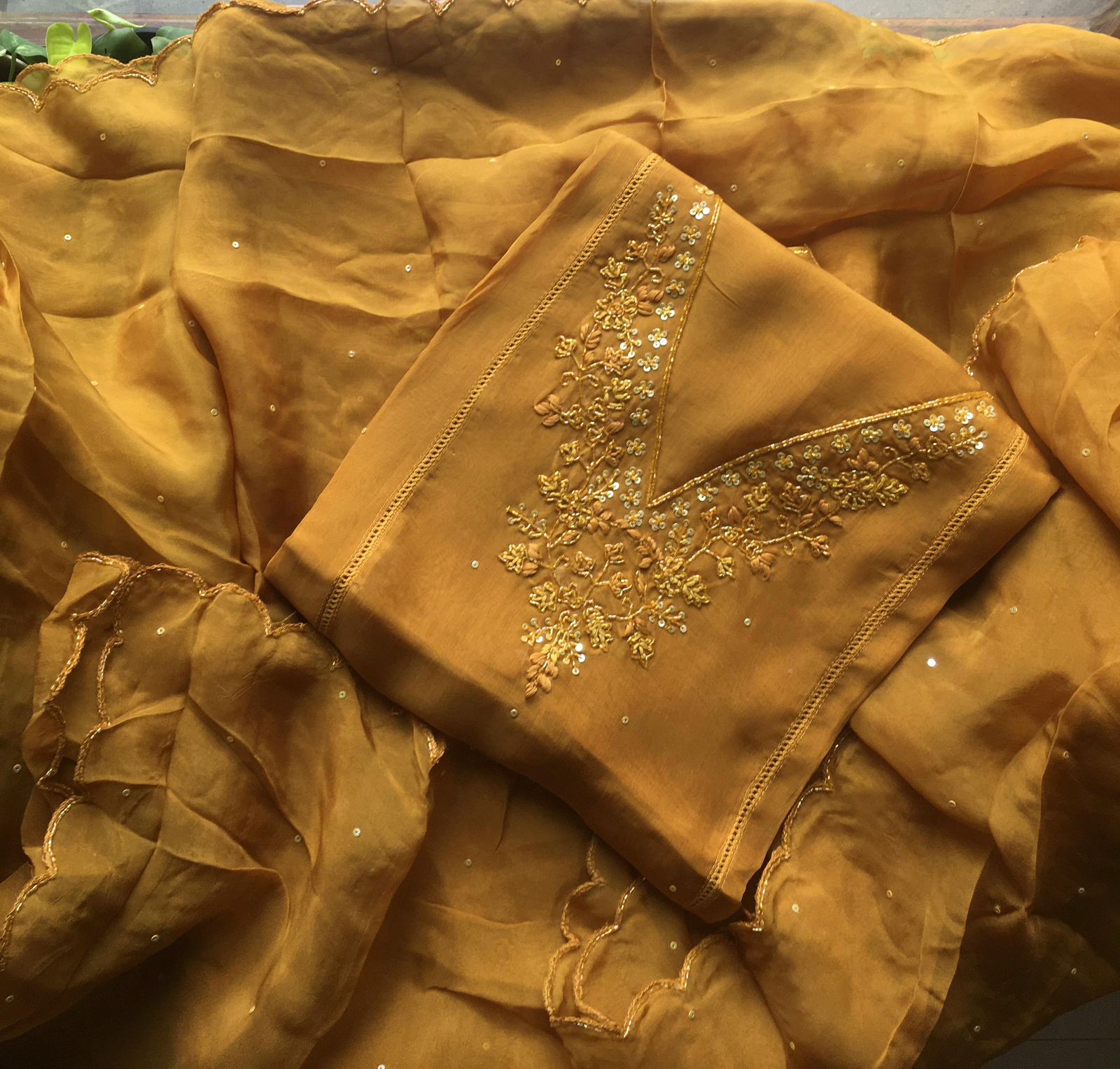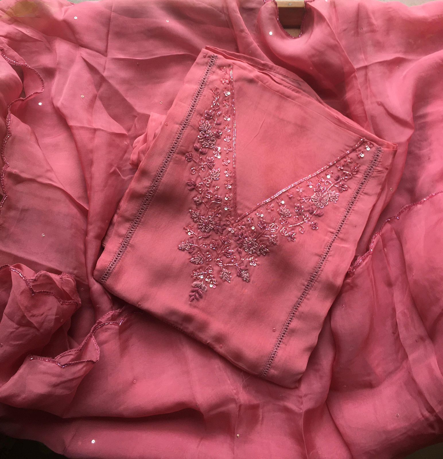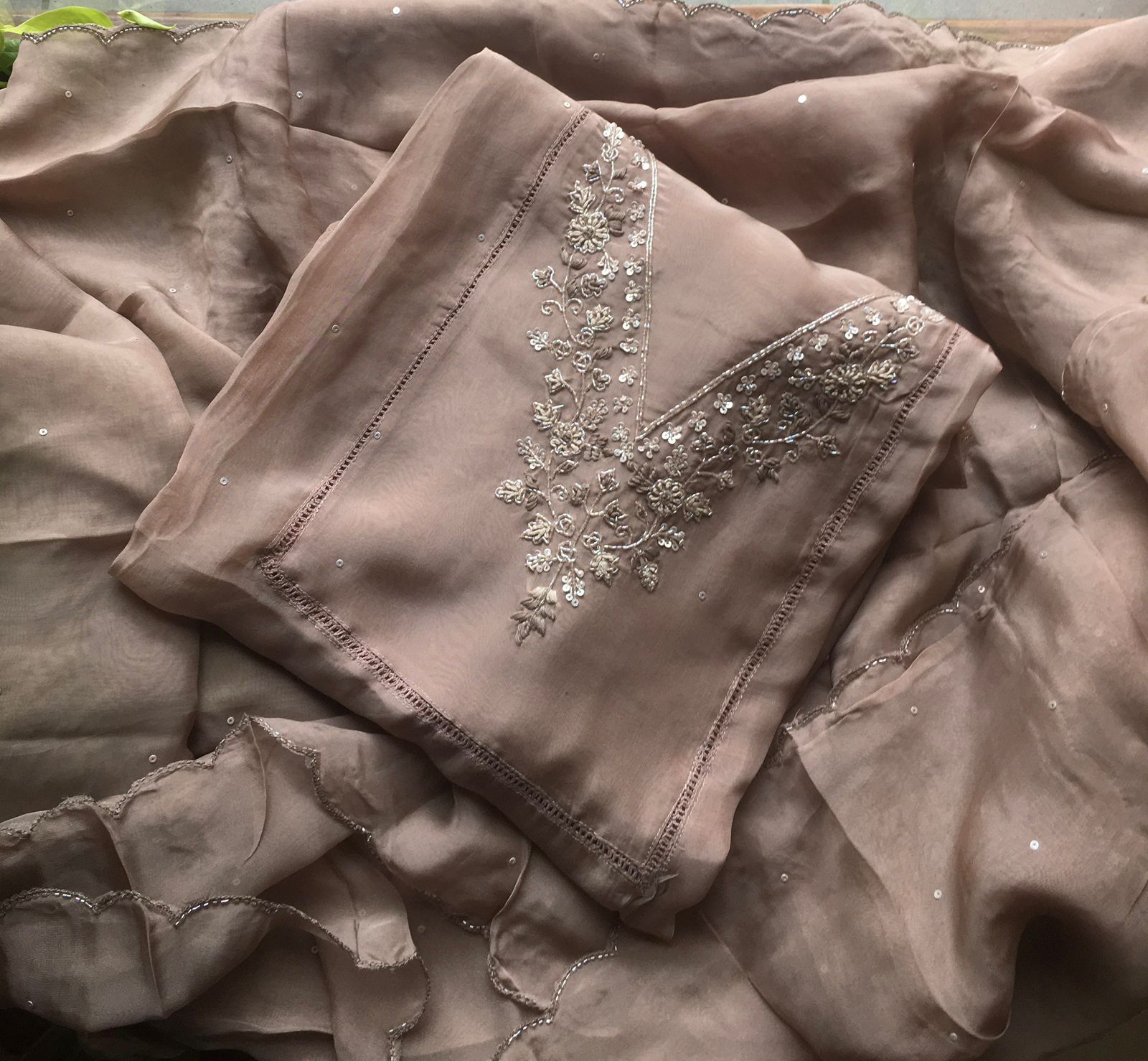 Are you looking out for Beautiful Handworked Pure Organza Suits to add to your wardrobe ? We have the perfect pick for you !Pure soft organza top & Duppatta with intricate hand embroidery detailing & santoon bottom