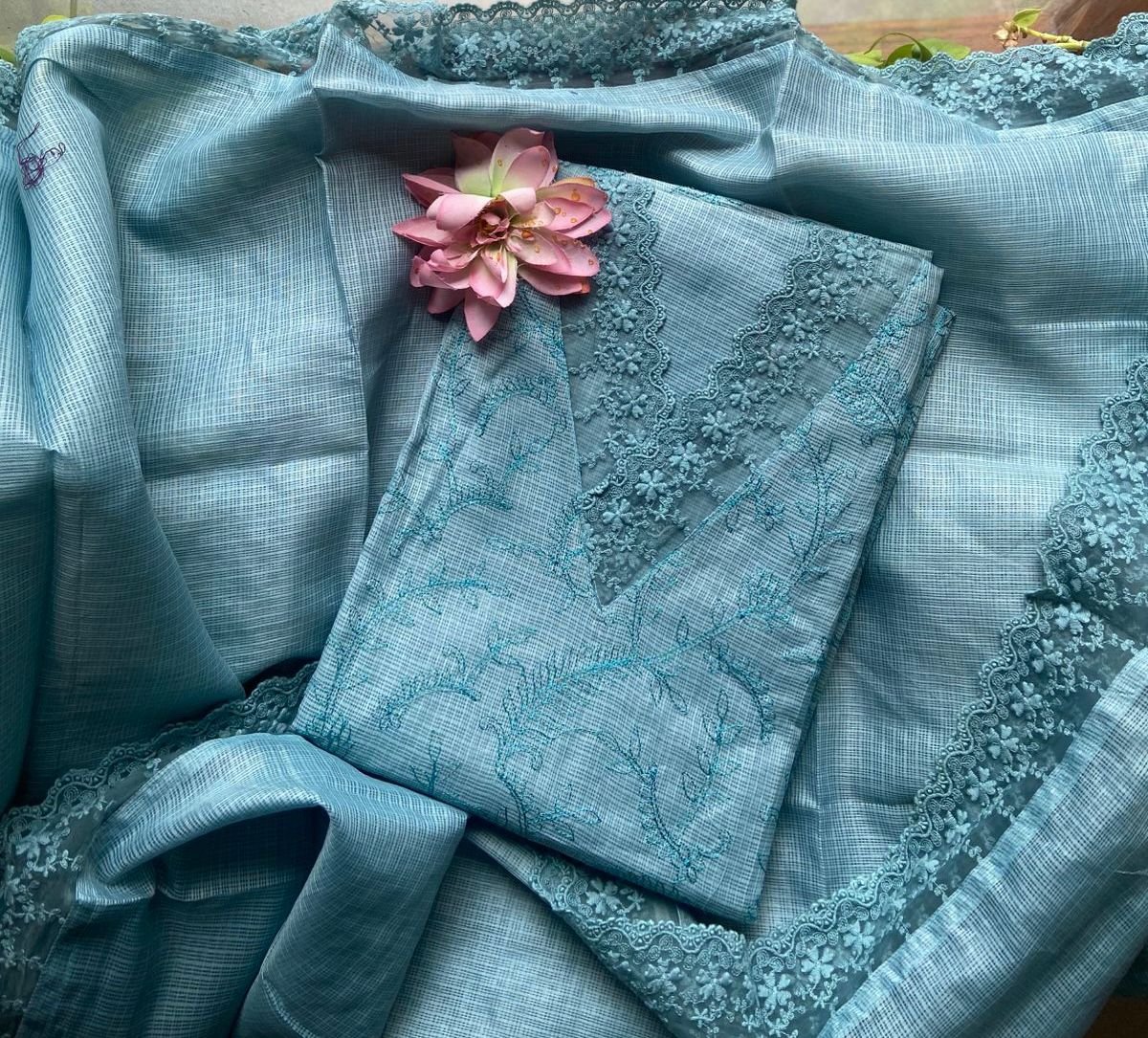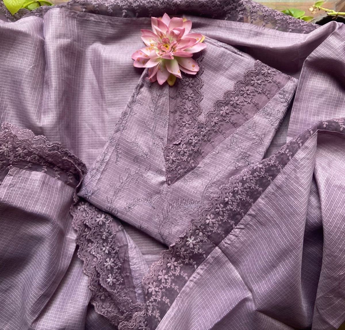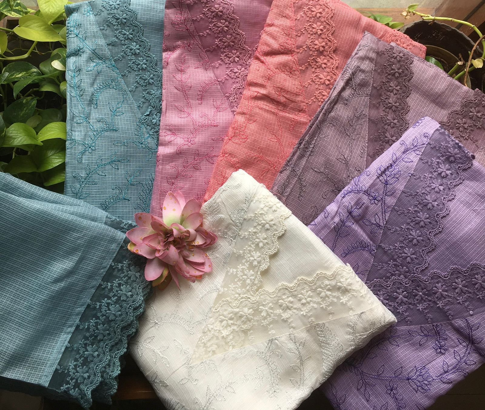 Are you looking out for Beautiful Kota Chikankari French Lace suits to add to your wardrobe ? These suits are the perfect choice ! Kota silk top with Chikankari reminiscent embroidery , cotton silk bottom and Kota silk Duppatta with French lace detailing