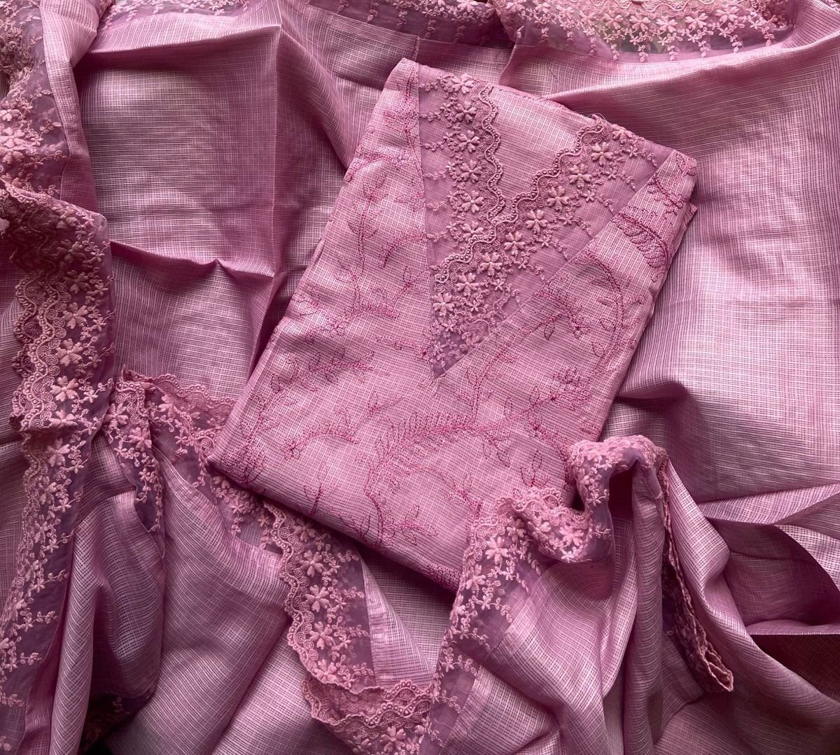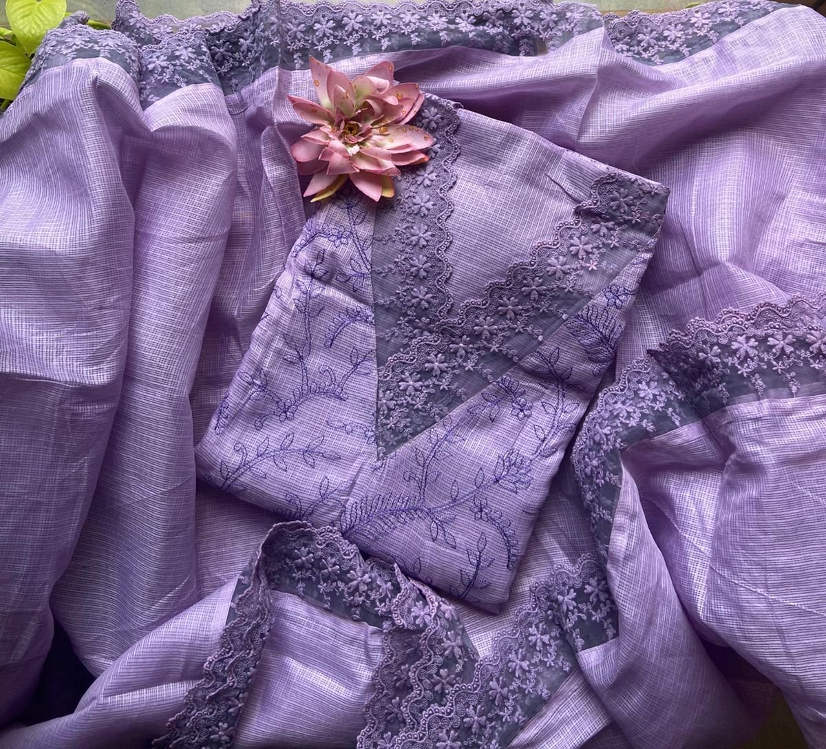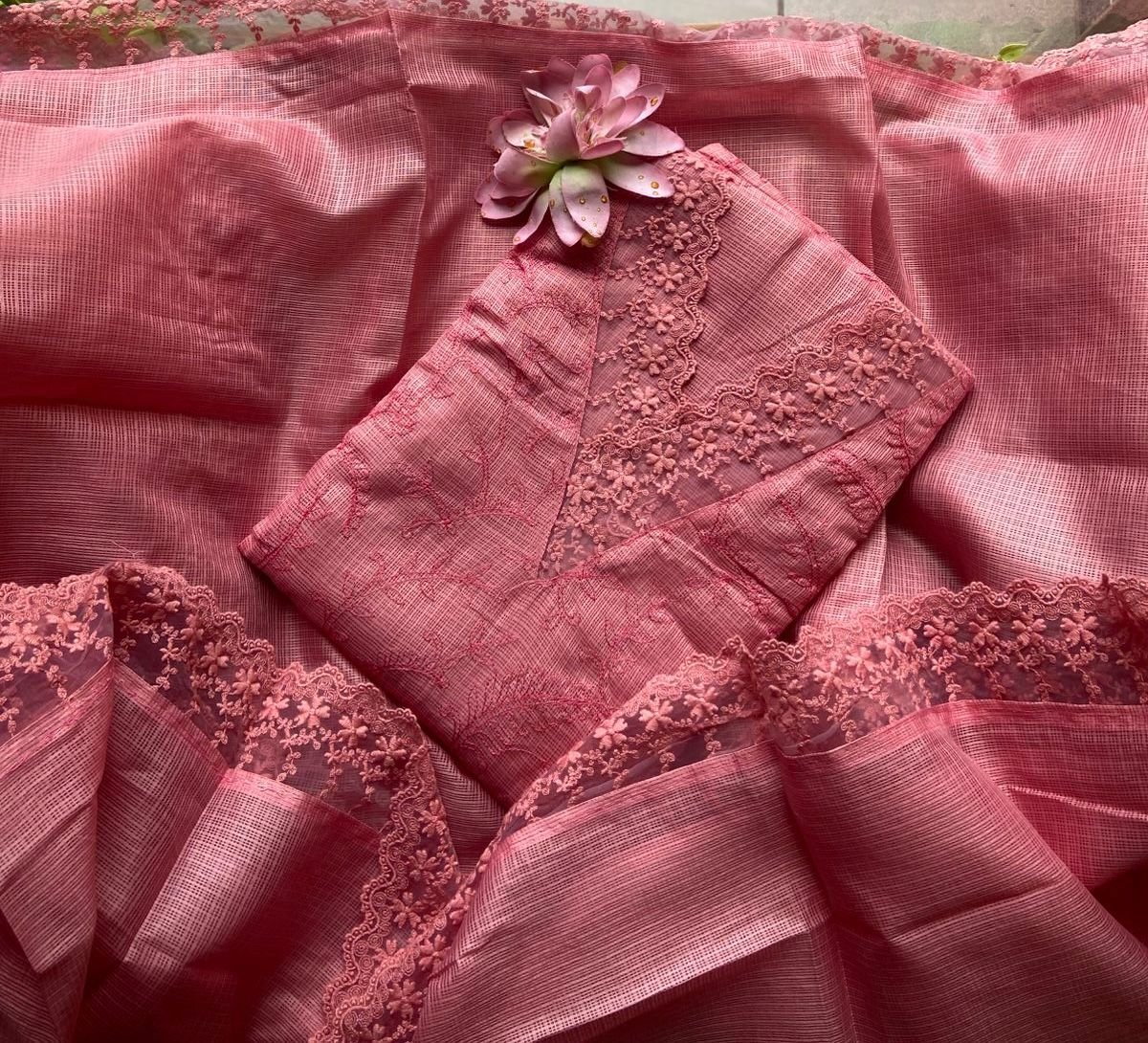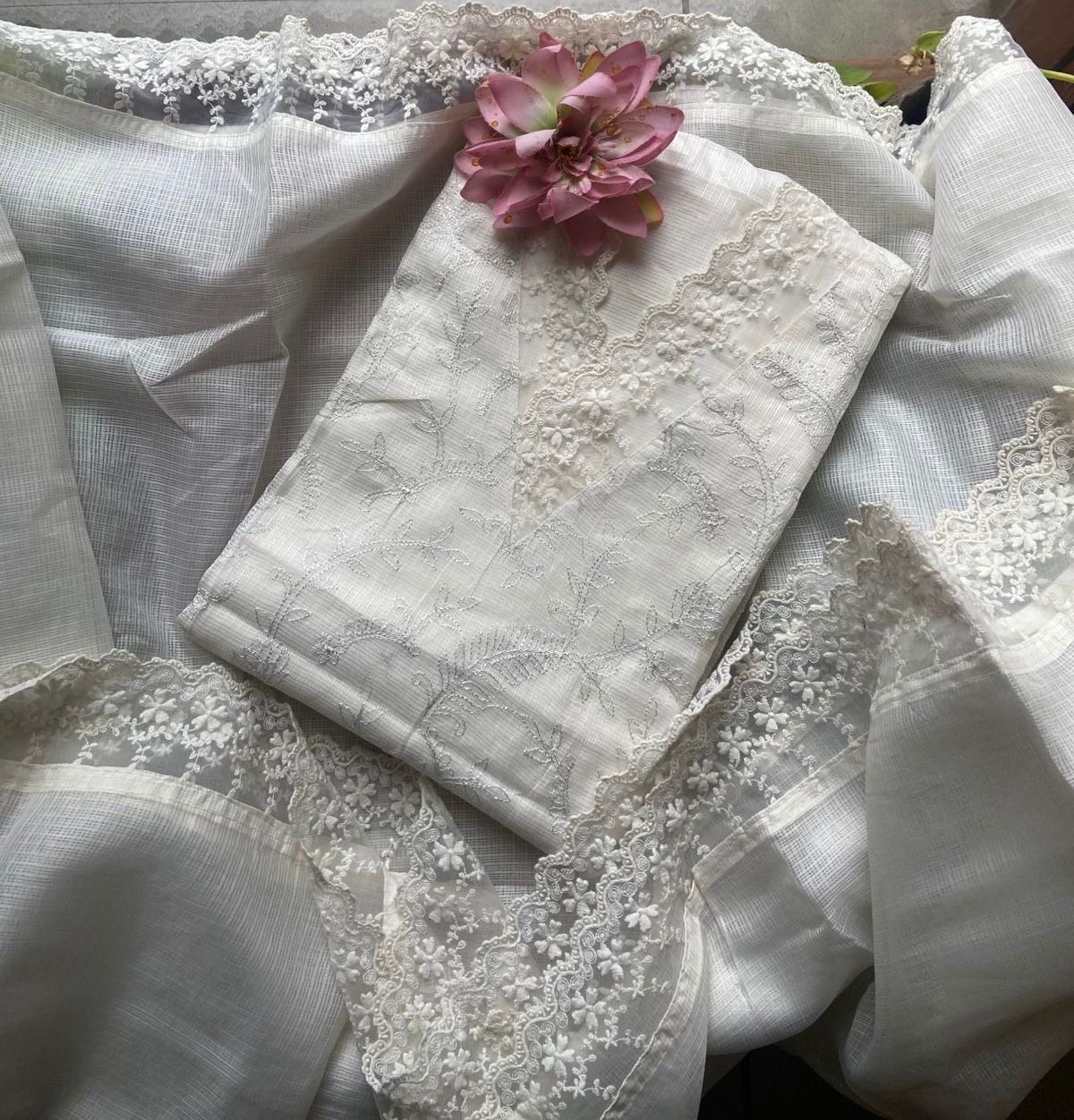 Are you looking out for Beautiful Kota Chikankari French Lace suits to add to your wardrobe ? These suits are the perfect choice ! Kota silk top with Chikankari reminiscent embroidery , cotton silk bottom and Kota silk Duppatta with French lace detailing
