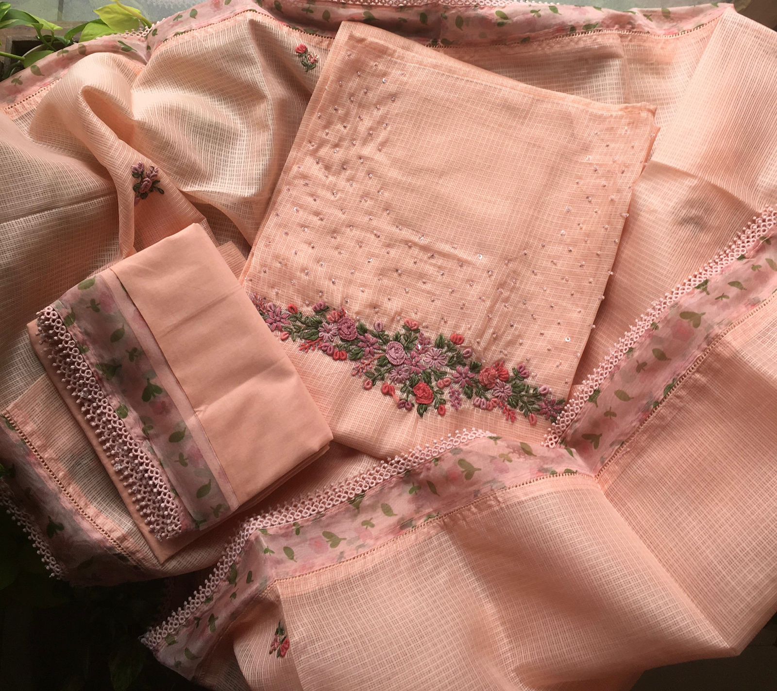 Are you looking out for Beautiful Floral Suits to add to your wardrobe ? These Floral Linen Cotton Suits are the perfect choice!Linen cotton top with floral prints & French lace detailing , santoon bottom & linen cotton Duppatta with floral prints & silver Zari borders
