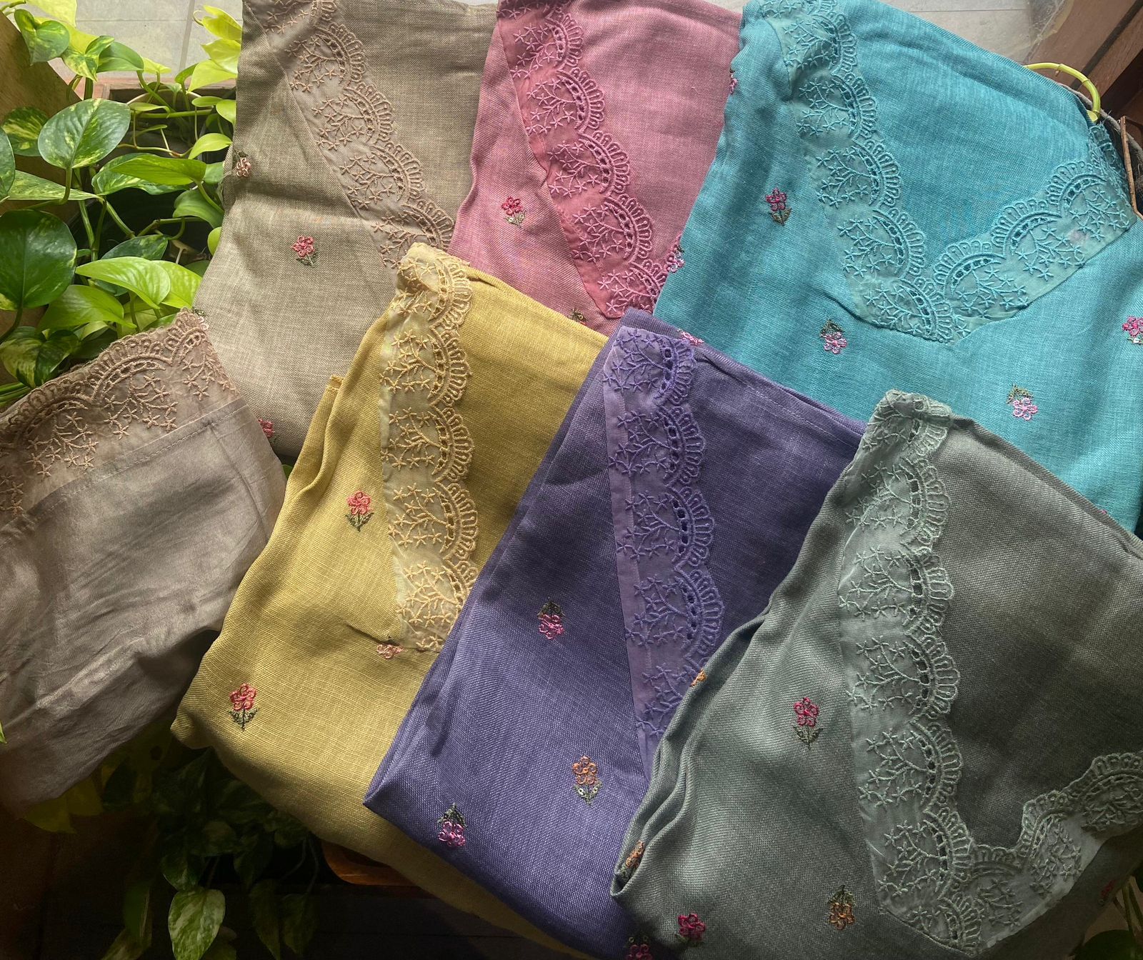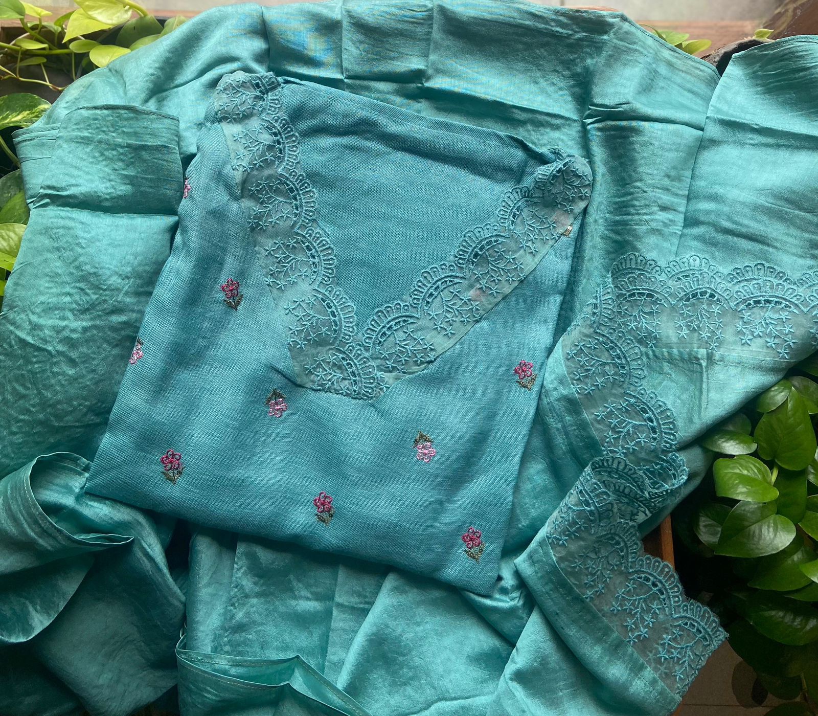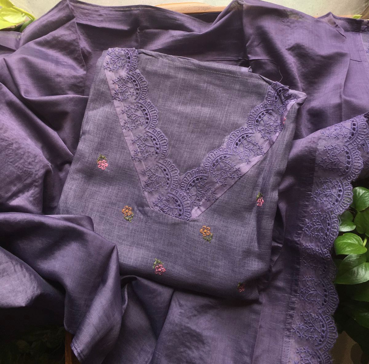Are you looking out for Beautiful Linen cotton Suits to add to your wardrobe ? These suits with floral embroidery & French lace detailing are the perfect choice! Pure Linen Cotton top with floral embroidery & french lace detailing top, cotton silk bottom & Muslin Duppatta with French lace detailing