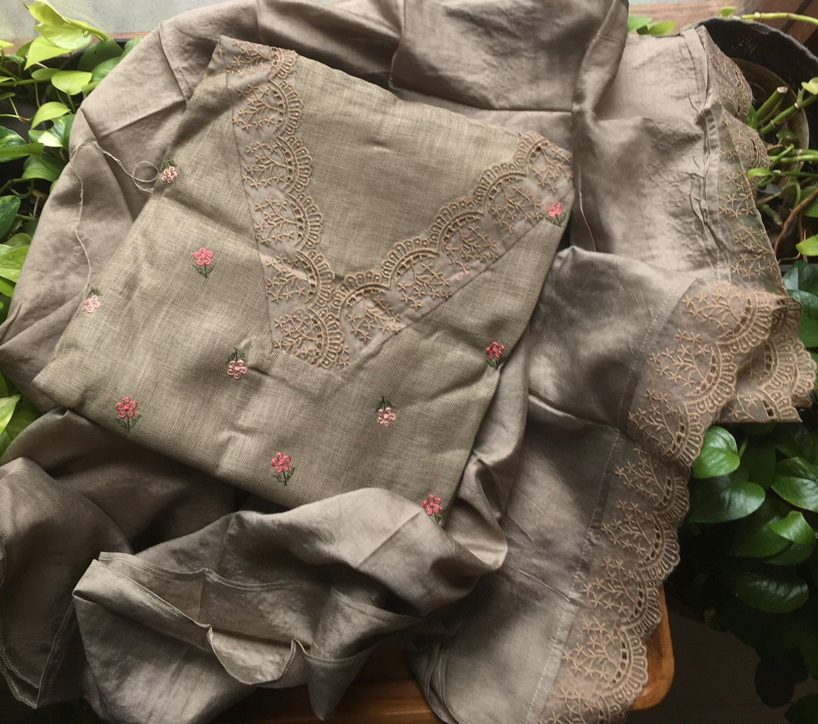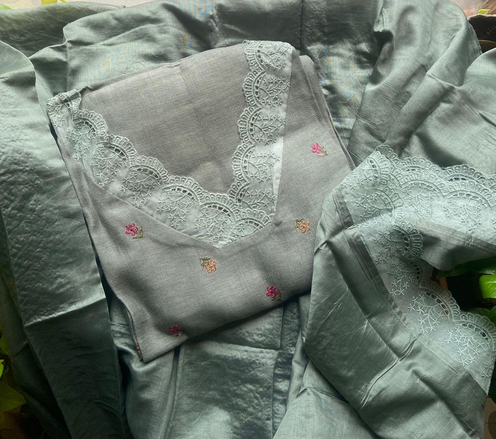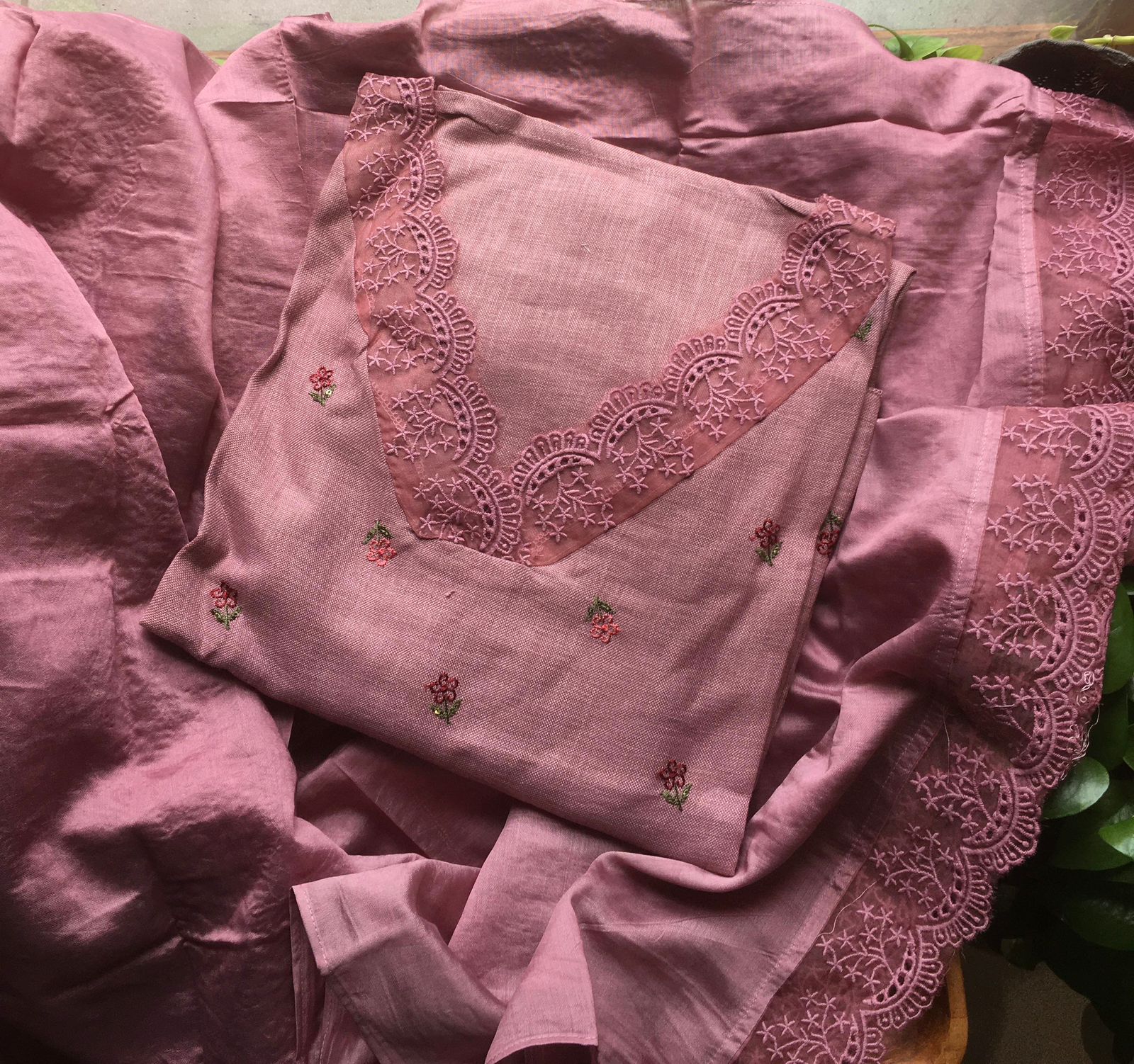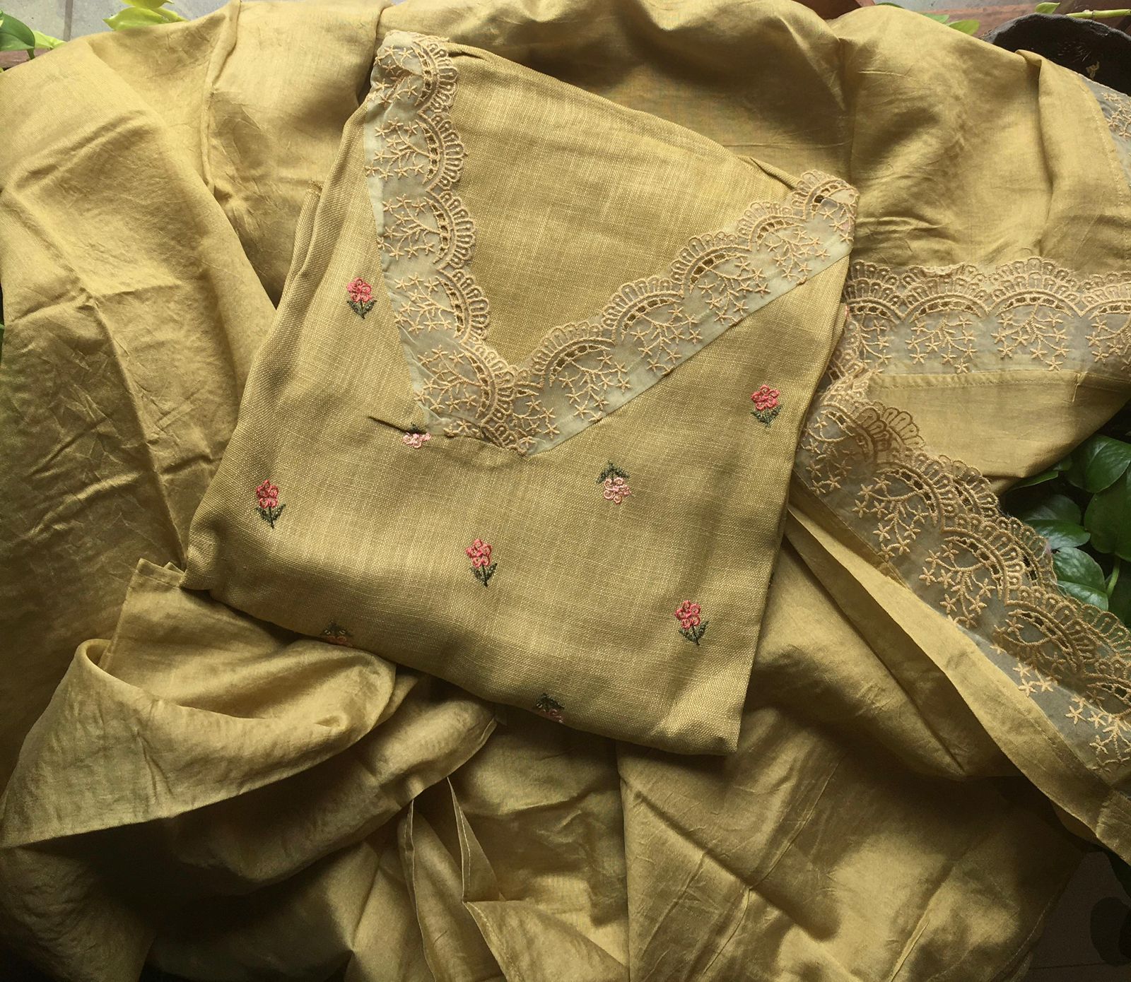 Are you looking out for Beautiful Linen cotton Suits to add to your wardrobe ? These suits with floral embroidery & French lace detailing are the perfect choice! Pure Linen Cotton top with floral embroidery & french lace detailing top, cotton silk bottom & Muslin Duppatta with French lace detailing