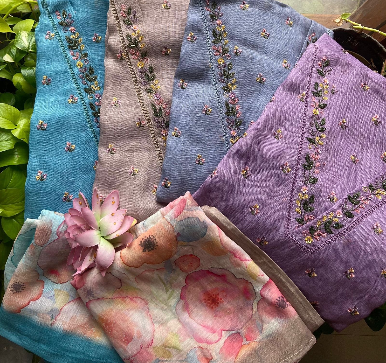 Beautiful Linen Suits in lovely handpicked color hues with exquisite hand embroidery featuring bullion knots, satin stitches, French knots n more and santoon bottom