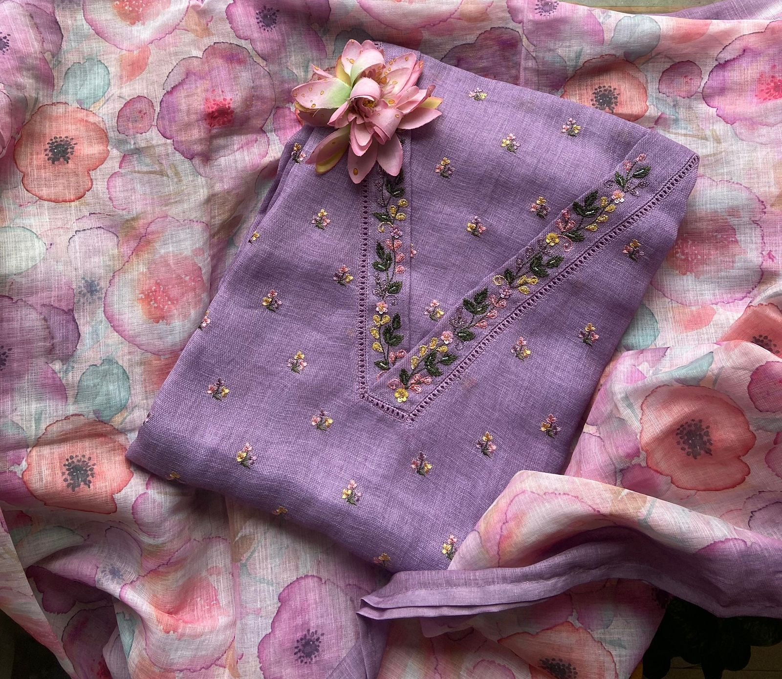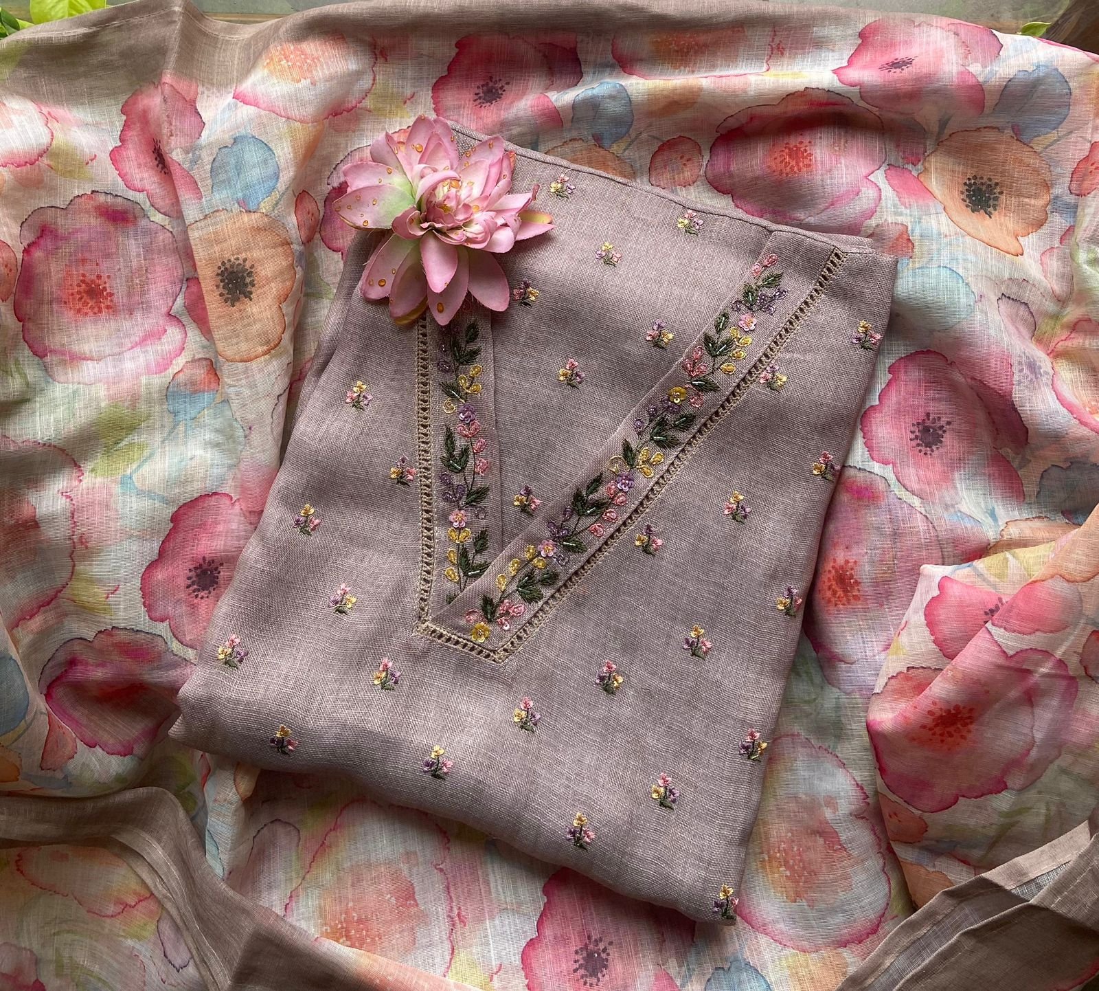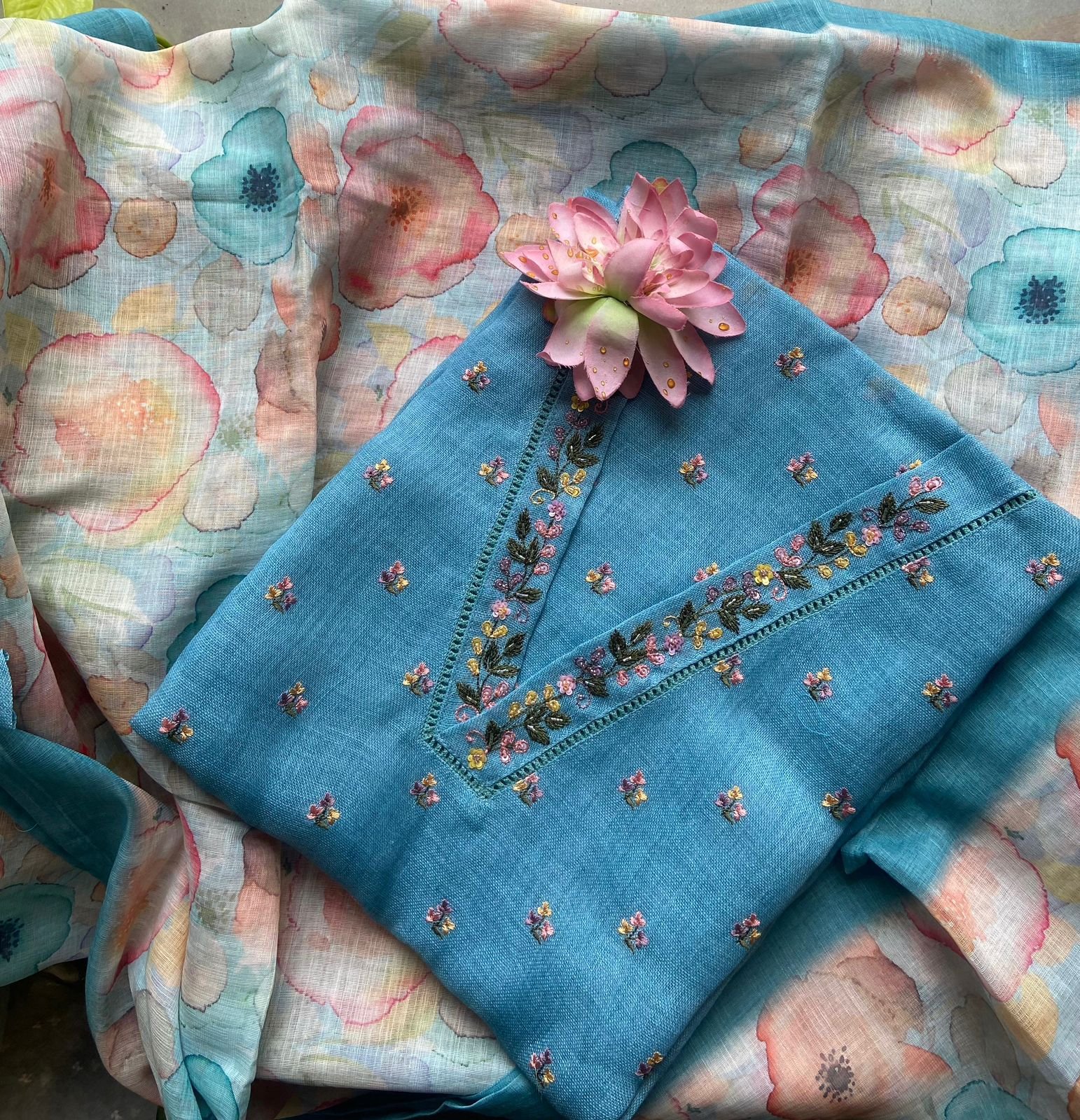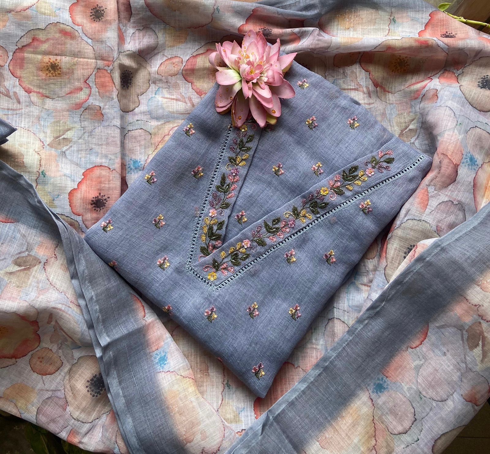 Are you looking out for Beautiful Linen suits to add to your wardrobe ? These suits with beautiful hand work is the perfect choice! Linen top with beautiful floral embroidery , santoon bottom & linen floral printed dupatta