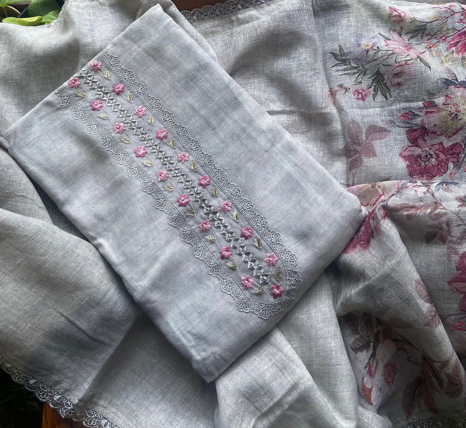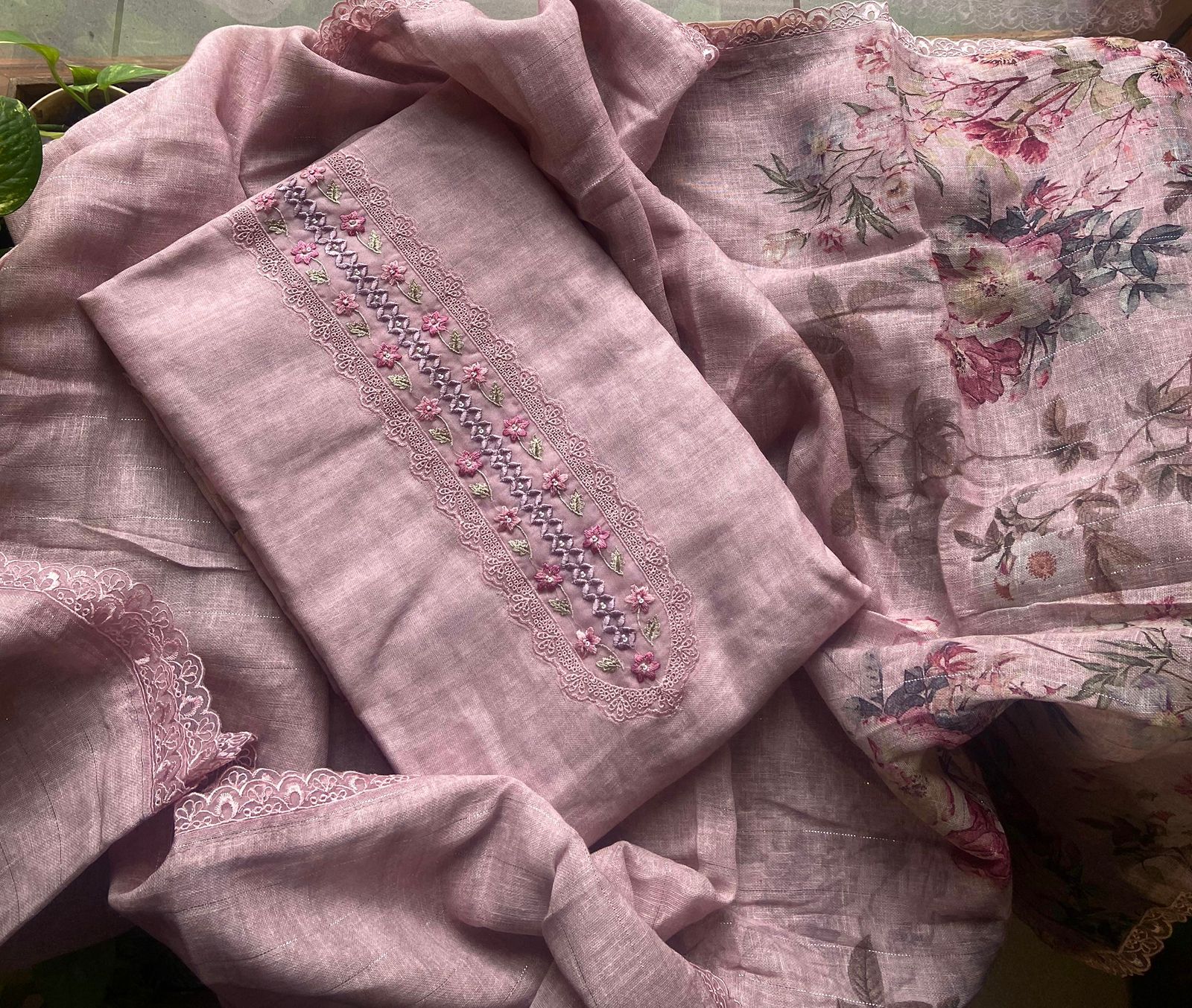 Beautiful Linen Suits in lovely handpicked color hues with exquisite hand embroidery featuring bullion knots, satin stitches, French knots n more