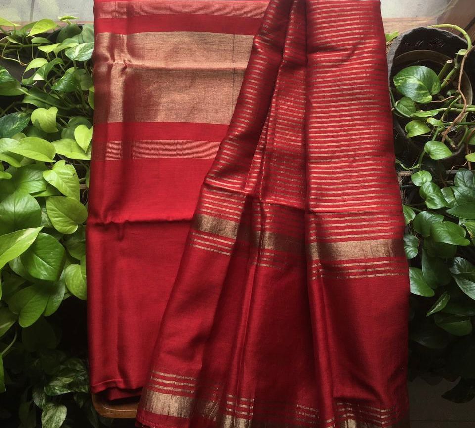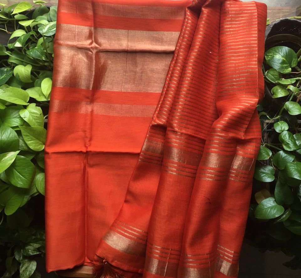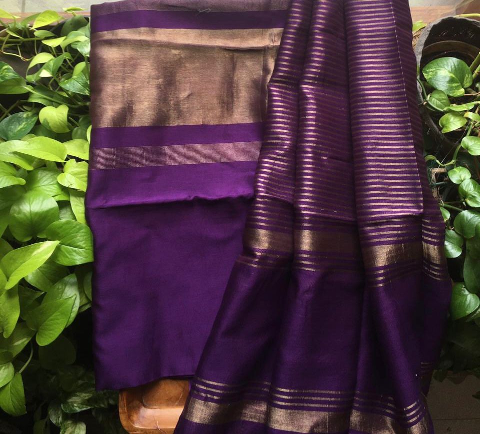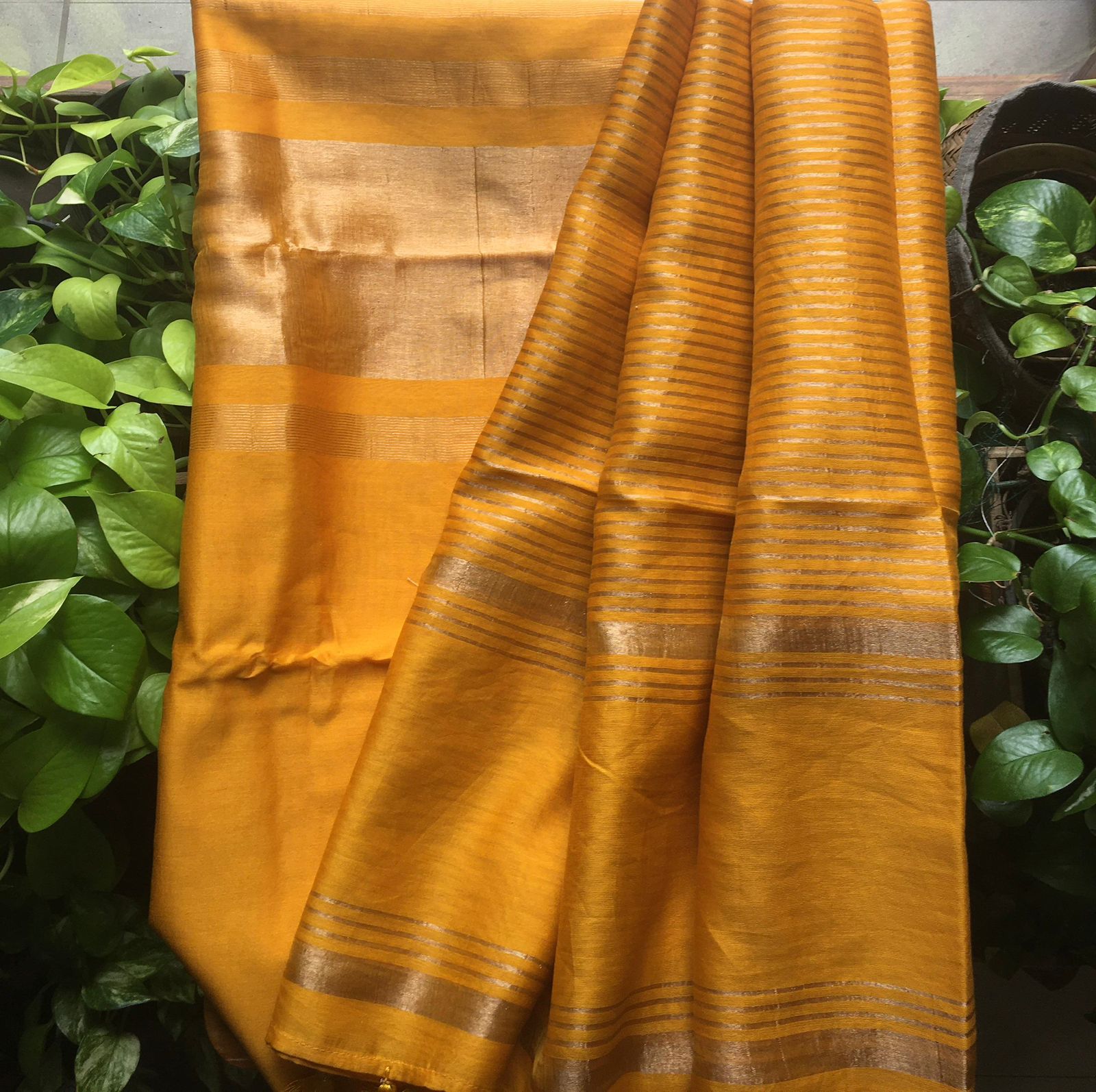 A beautiful collection of Tussar silk sarees with very elegant check weaving on entire saree & borders finished with beautiful cross stitch reminiscent floral embroidery. With blouse pure Benarasi silk