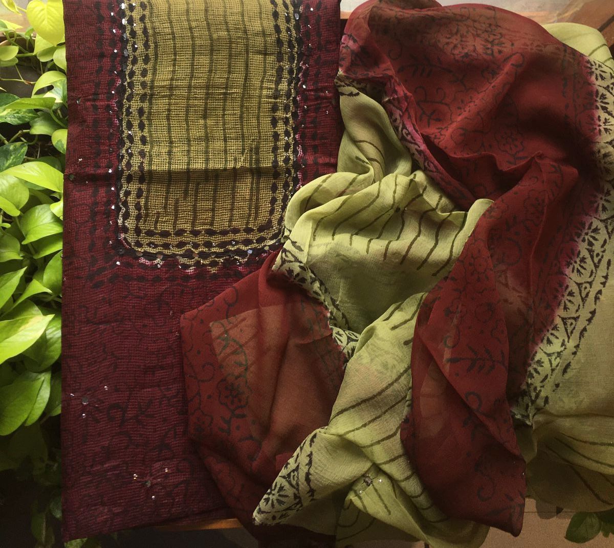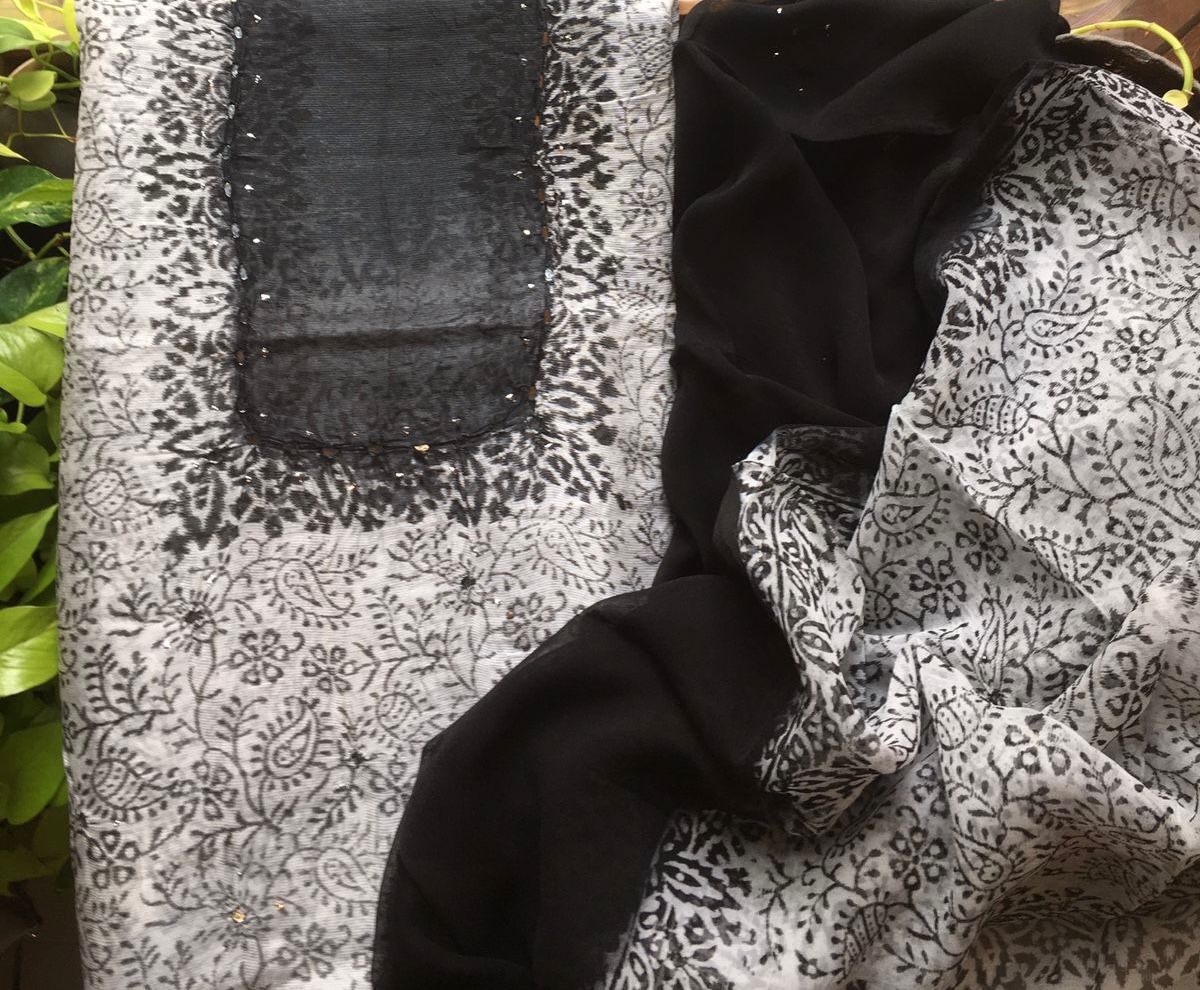 Are you looking out for Beautiful Mirror worked Kota silk suits to add to your wardrobe ? These suits with beautiful mirror work & ombré dyeing is the perfect choice! Pure kota silk top with ombré dyeing & mirror work , cotton printed bottom & chiffon Duppatta with mirror work & block prints