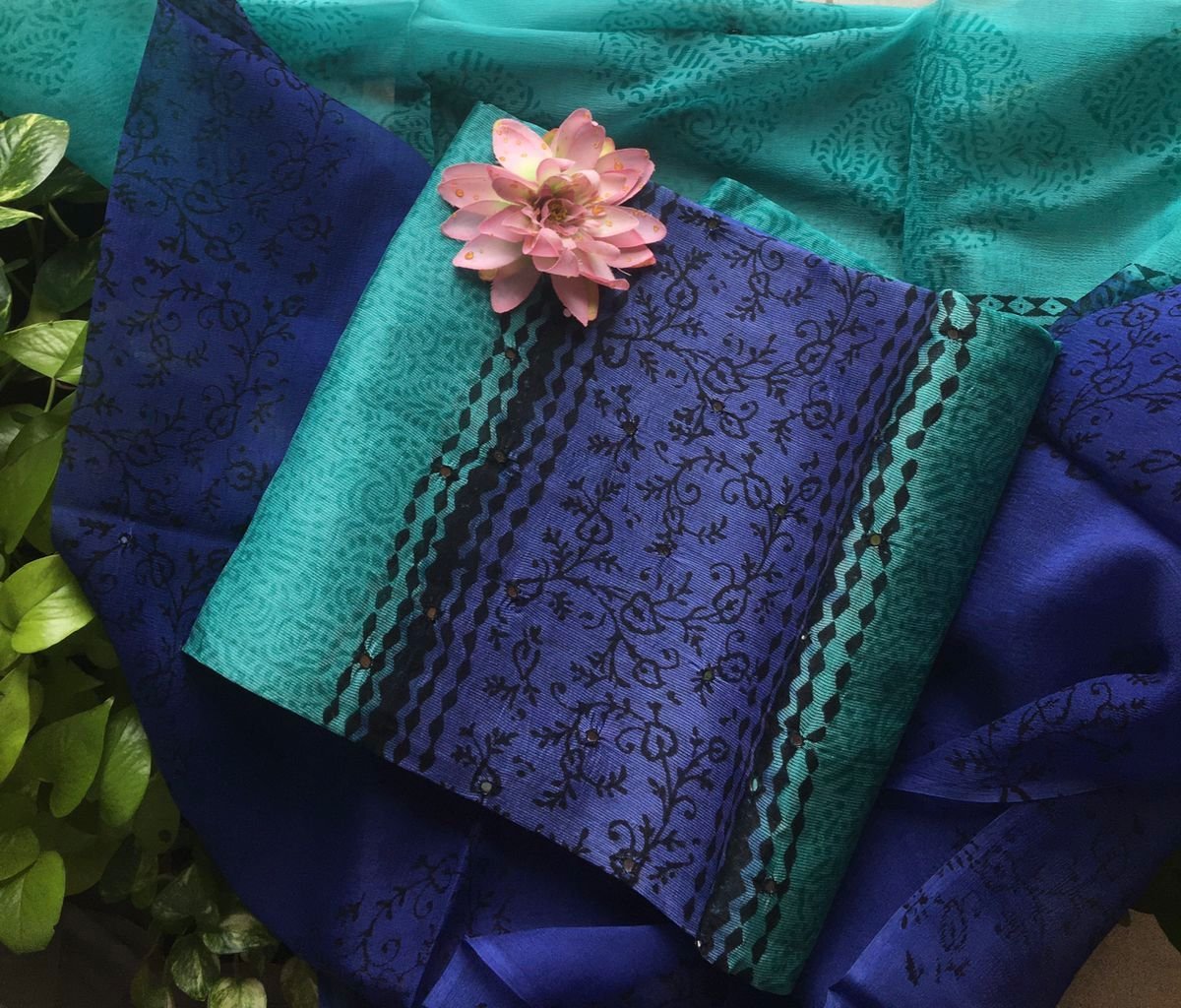 Are you looking out for Beautiful Mirror worked Kota silk suits to add to your wardrobe ? These suits with beautiful mirror work & ombré dyeing is the perfect choice! Pure kota silk top with ombré dyeing & mirror work , cotton printed bottom & chiffon Duppatta with mirror work & block prints