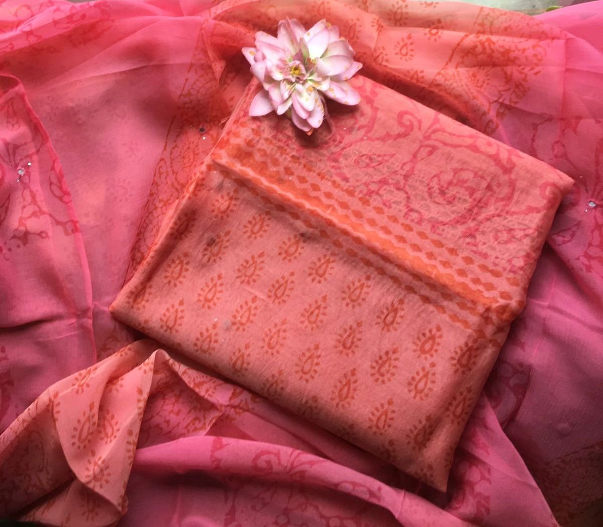 A Beautiful designer collection in Pure Khadi Georgette top and Duppatta top with stunning vertical weave benarasi hand weaving and santoon bottom in such lovely colours