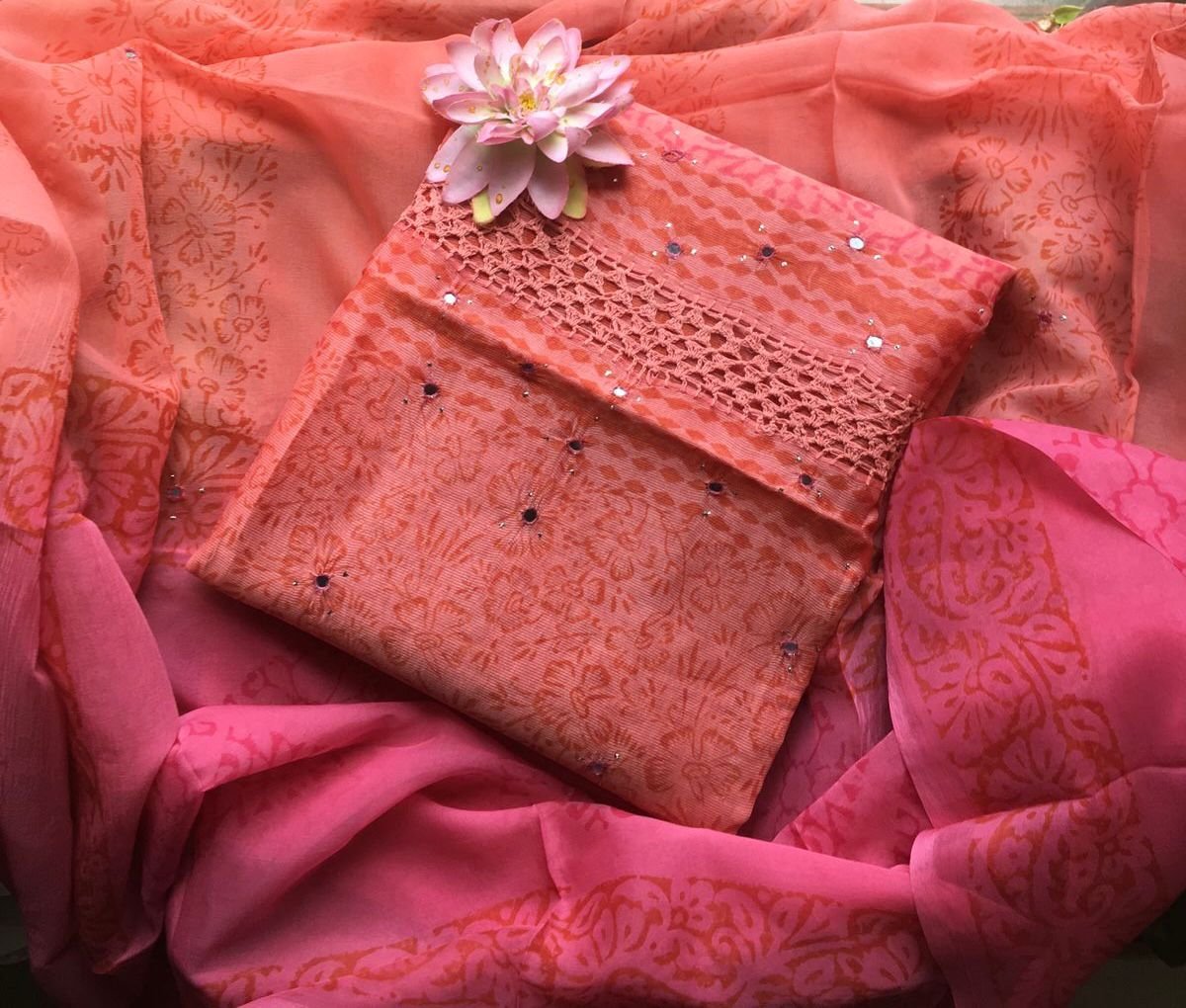 Styling tip : The beautiful floral prints and embroidery on handpicked colours makes these very pretty and a simple styling of some lace detailing for a trending v neck will add to the beauty of the suit