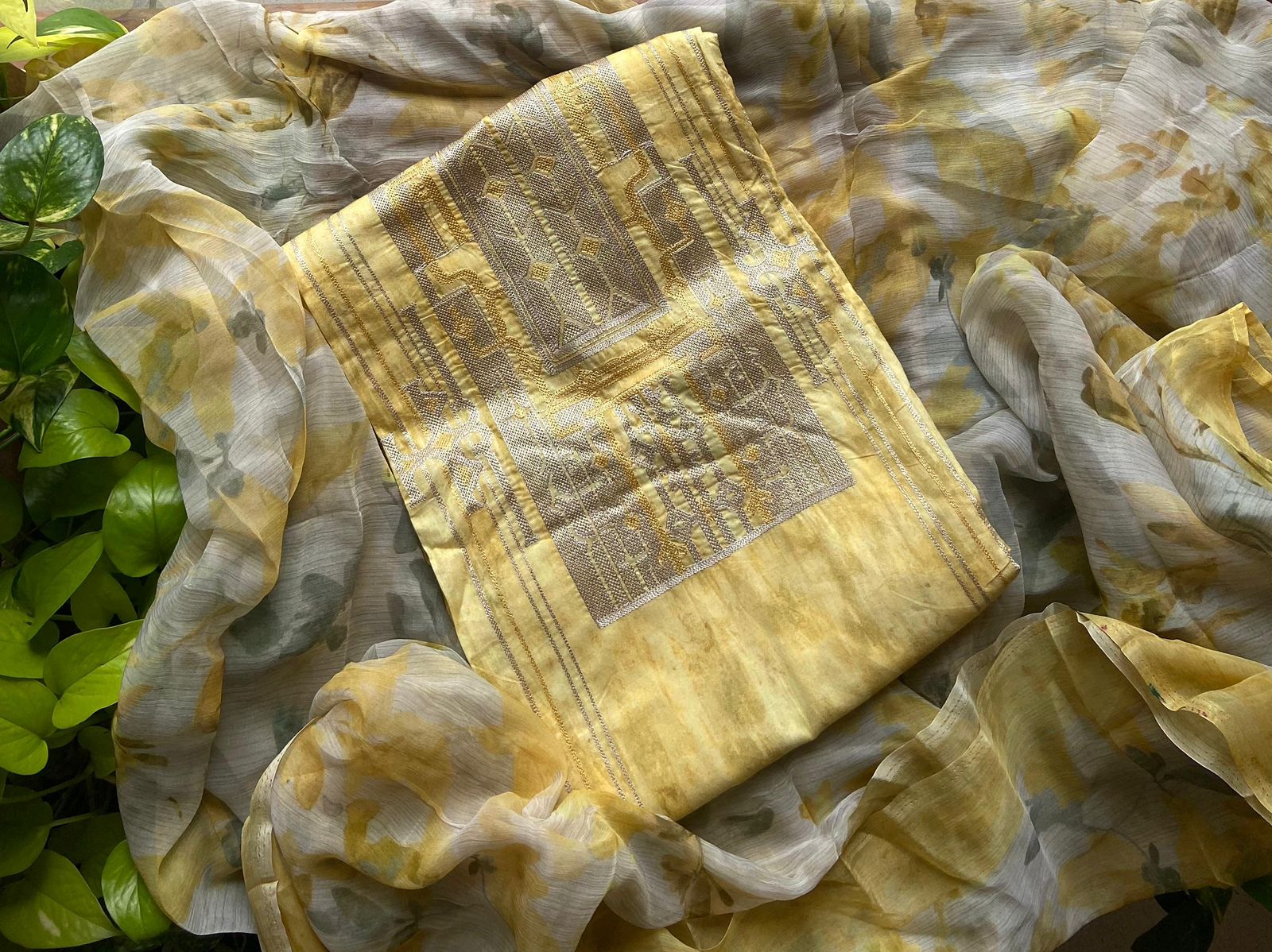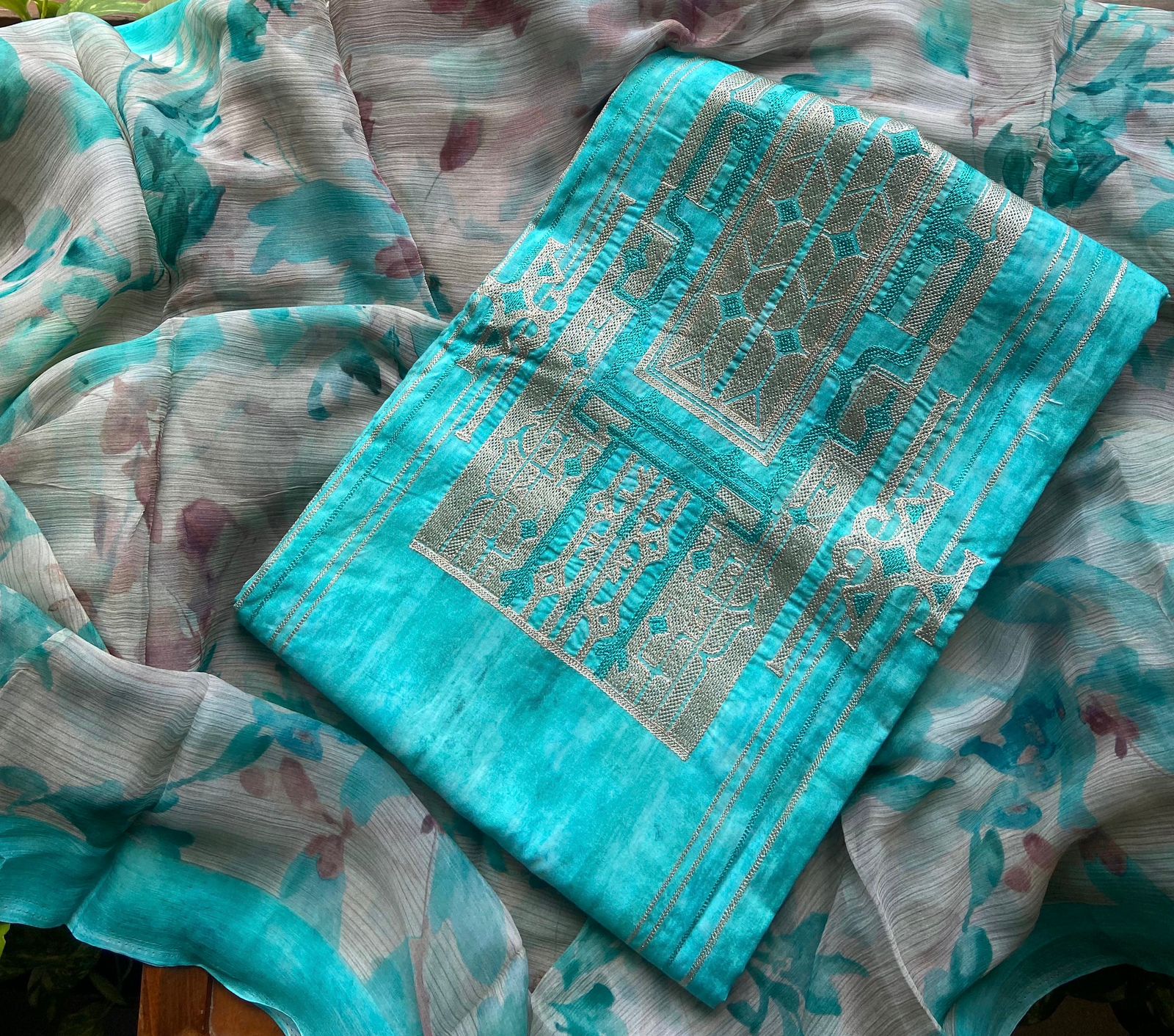 A Beautiful collection in pure Khadi Georgette top & Duppatta with stunning copper benarasi weave, cotton silk bottom