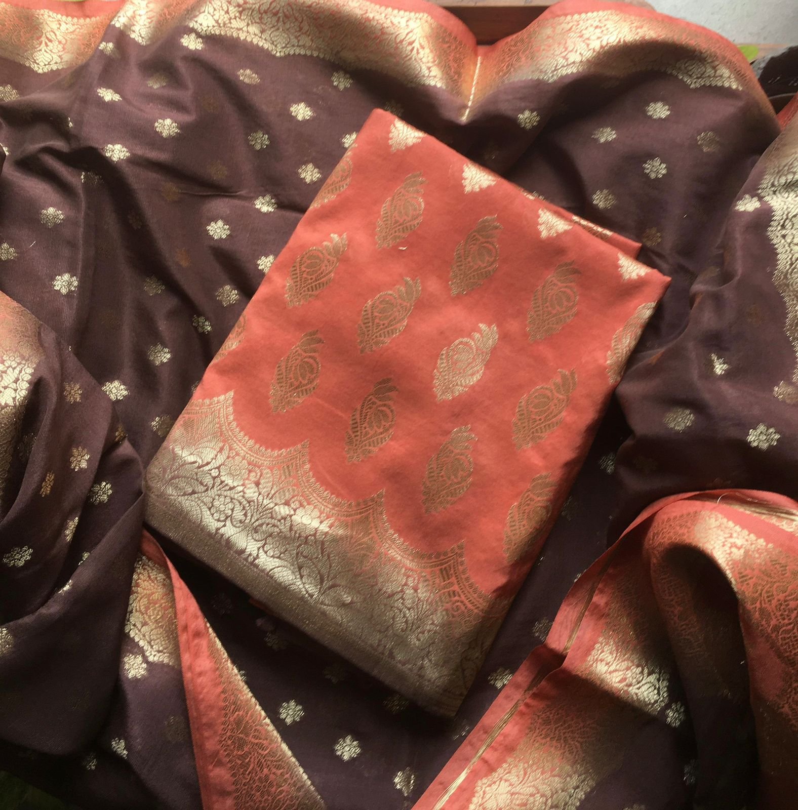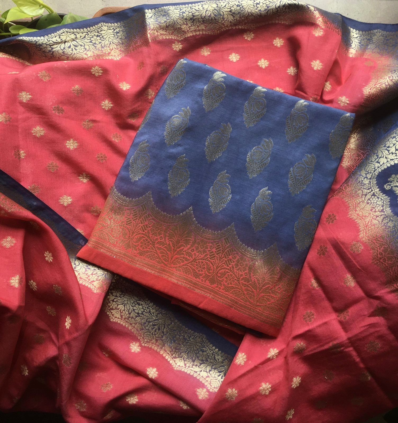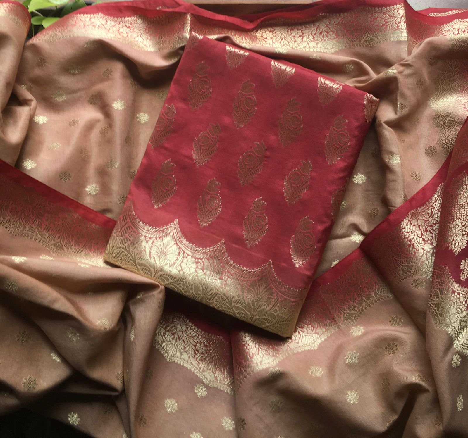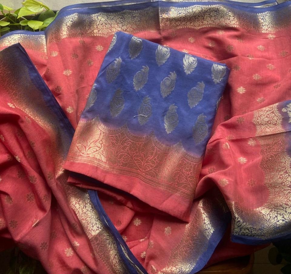 Are you looking out for Beautiful silk suits to add to your festive wardrobe ? These suits with beautiful Benarasi weaving is the perfect choice! Chandheri silk top & Duppatta with beautiful Benarasi weaving, cotton bottom & Benarasi Chandheri silk Duppatta