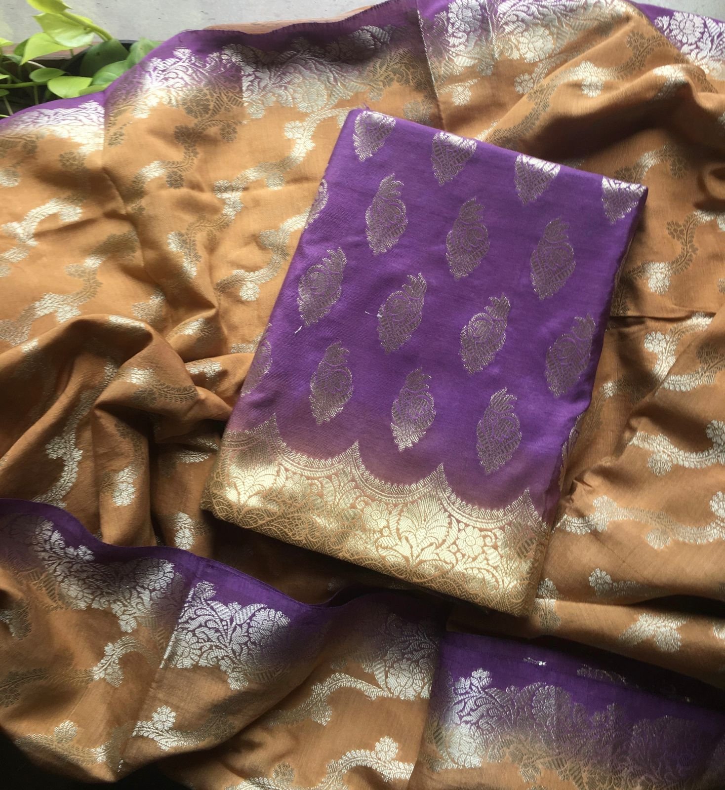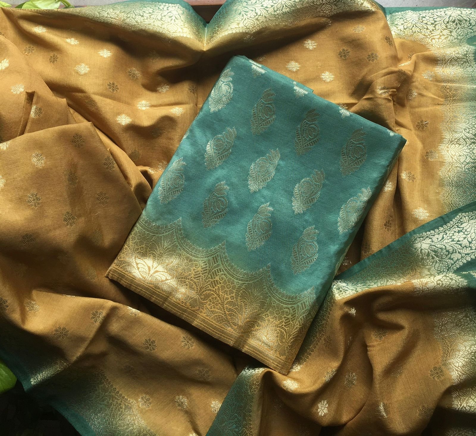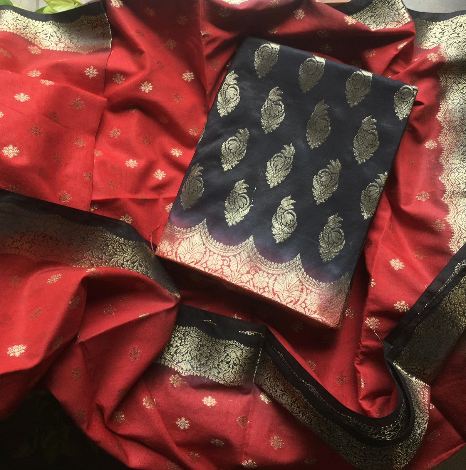 Are you looking out for Beautiful silk suits to add to your festive wardrobe ? These suits with beautiful Benarasi weaving is the perfect choice! Chandheri silk top & Duppatta with beautiful Benarasi weaving, cotton bottom & Benarasi Chandheri silk Duppatta