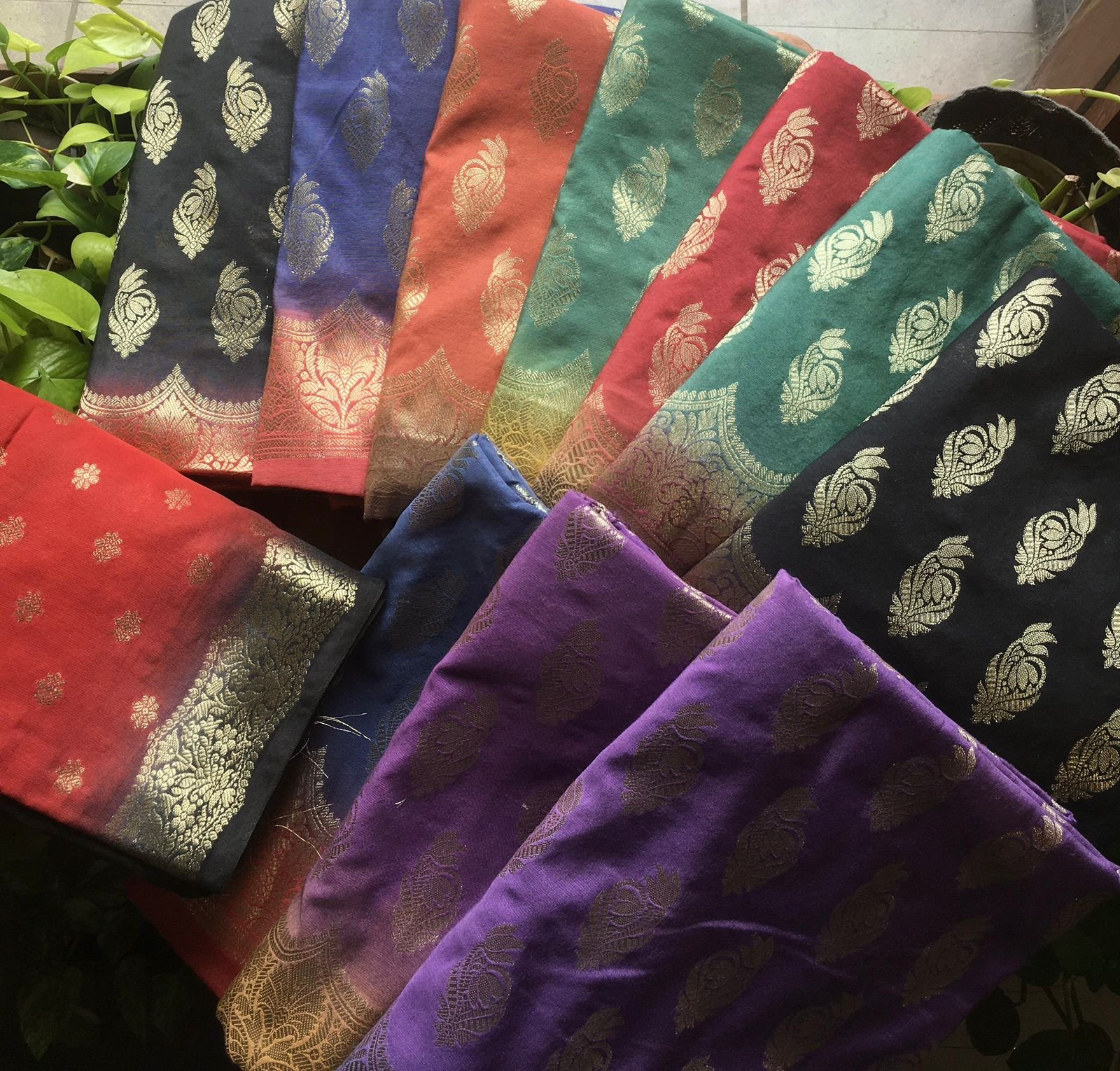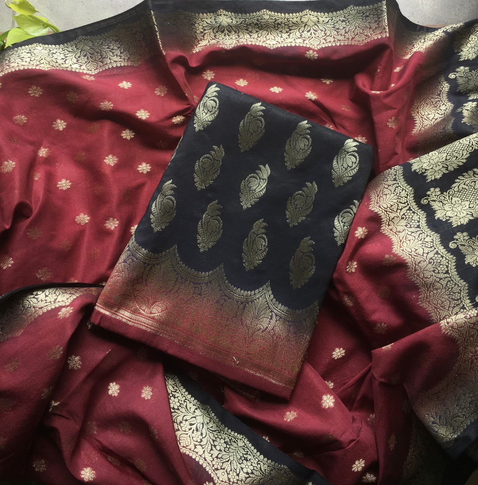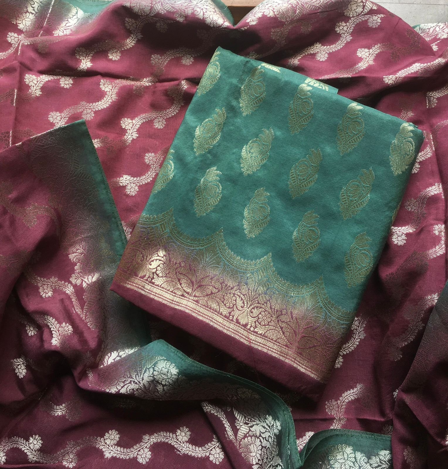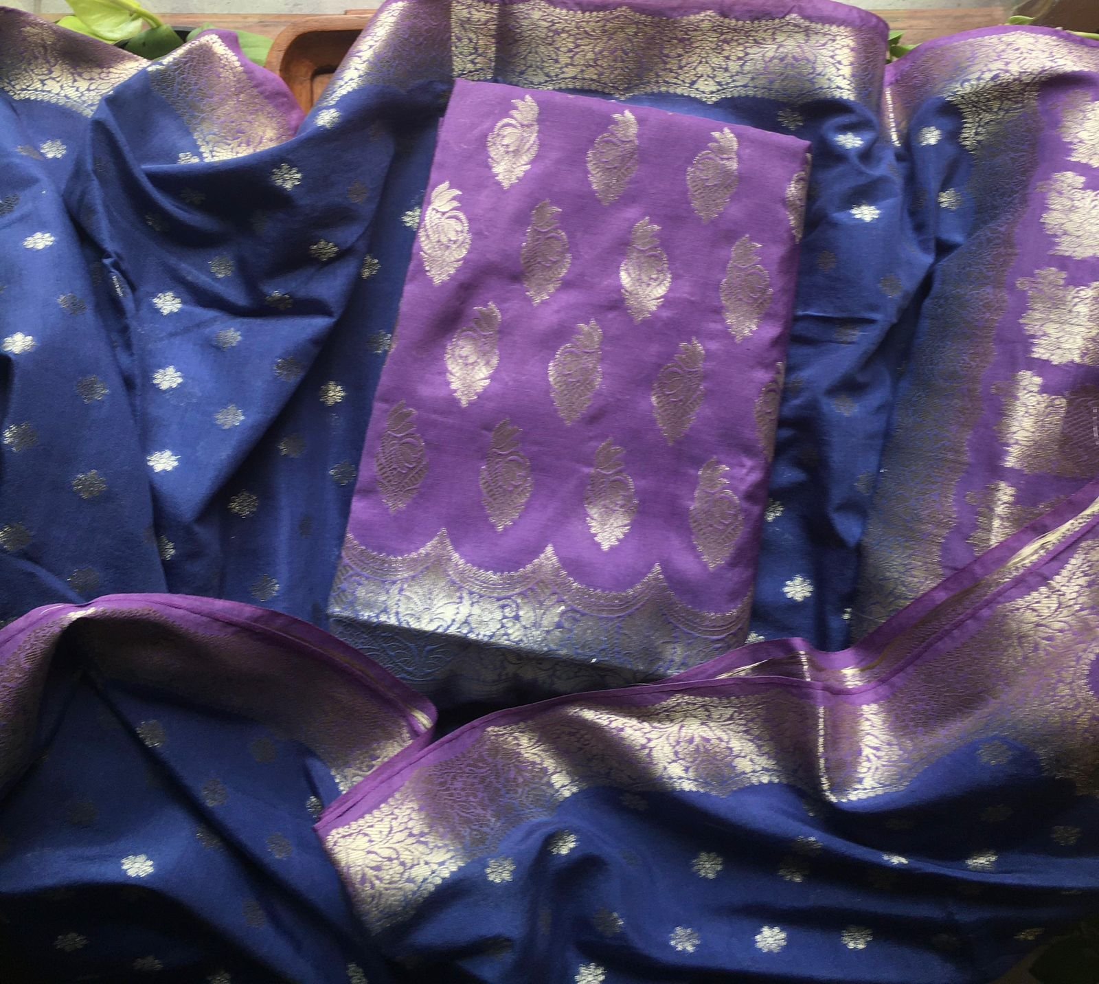 Are you looking out for Beautiful silk suits to add to your festive wardrobe ? These suits with beautiful Benarasi weaving is the perfect choice! Chandheri silk top & Duppatta with beautiful Benarasi weaving, cotton bottom & Benarasi Chandheri silk Duppatta