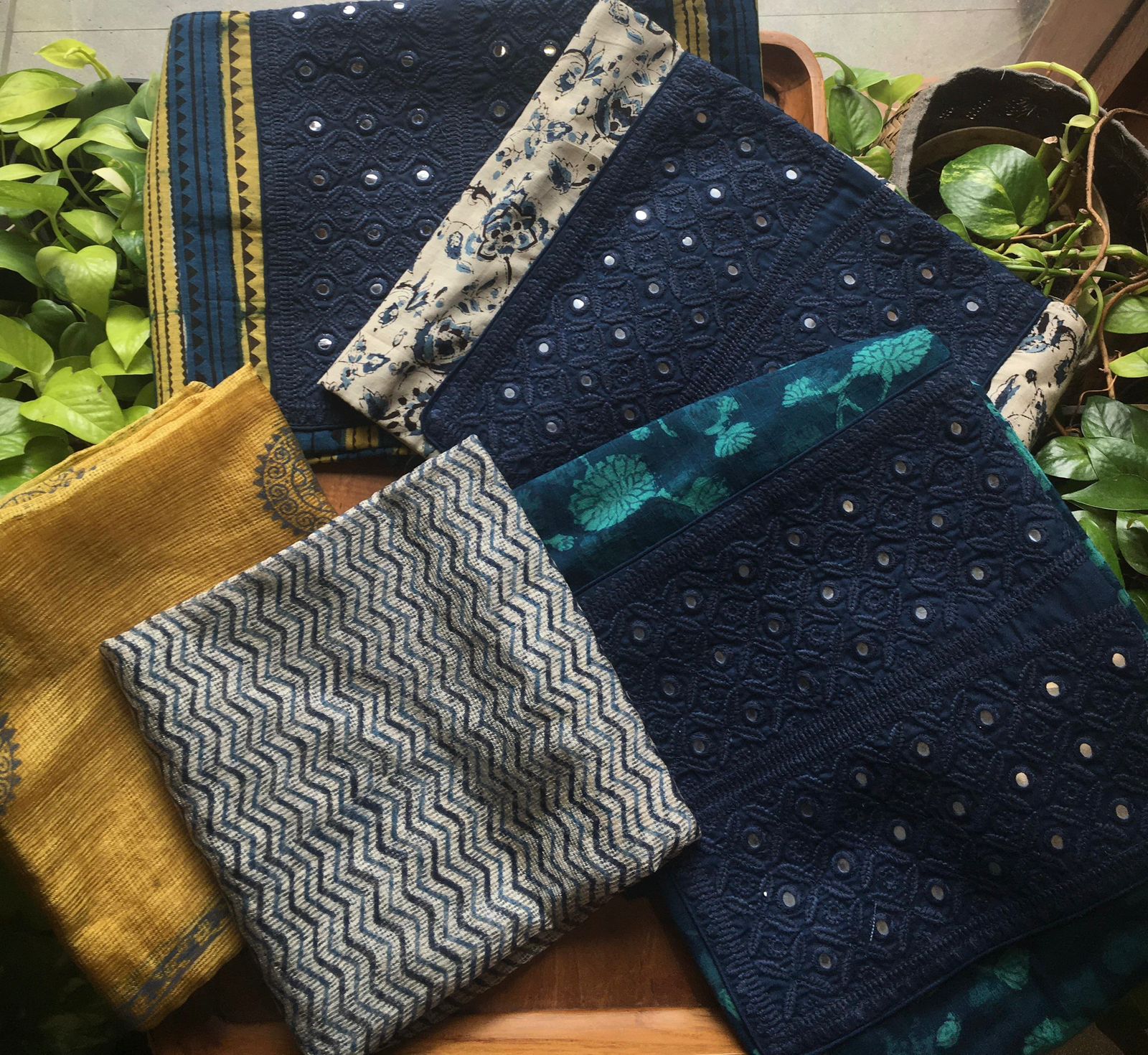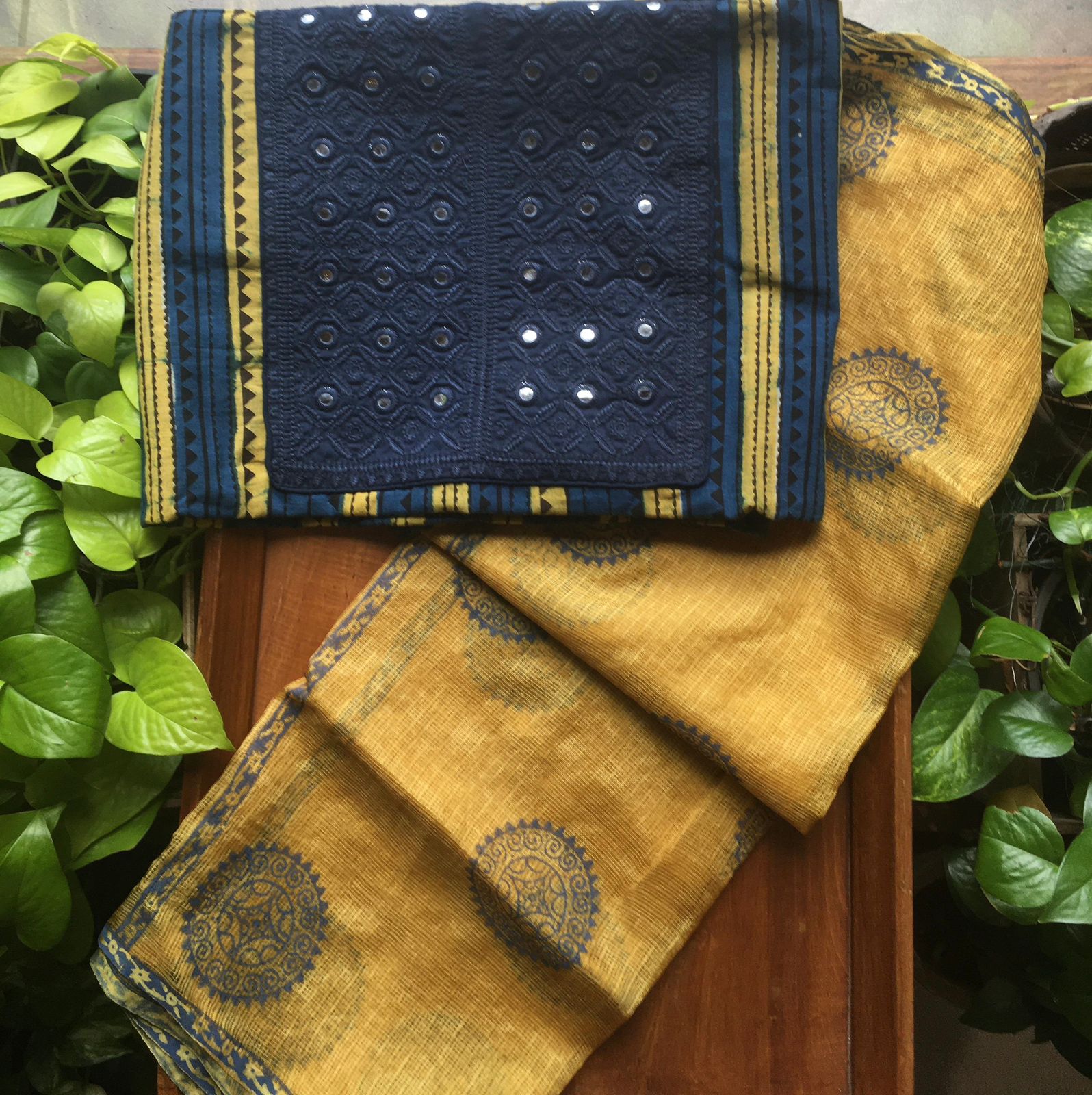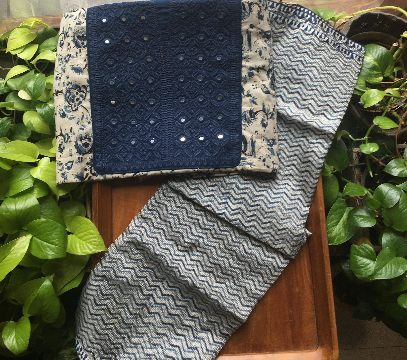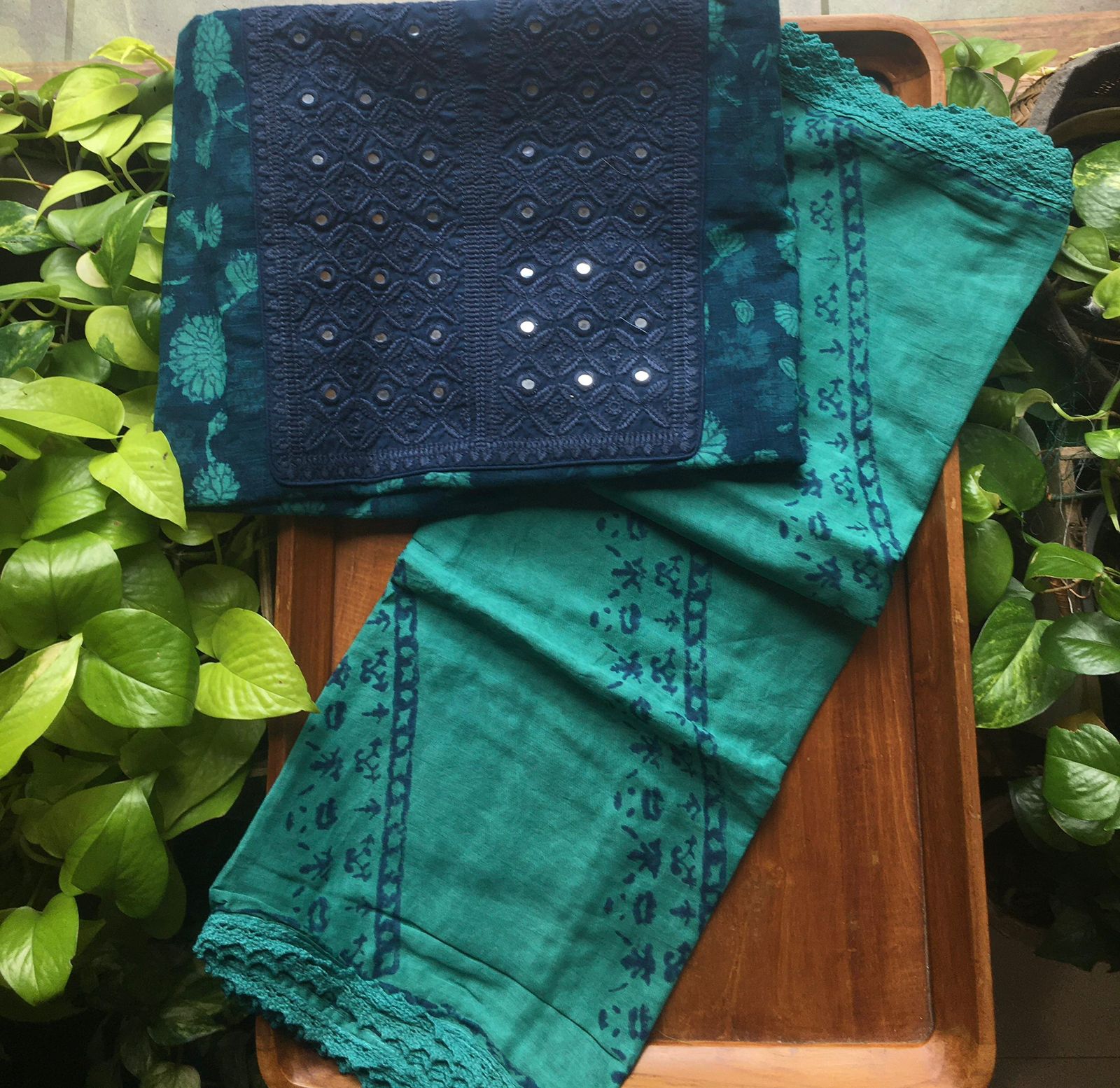 HomeSalwar Set are you looking out for Beautiful & Unique Designer Cottons to add to your wardrobe ? These Hand block printed cottons are the perfect choice! Pure cotton top with mirror work , (does not need lining ) cotton bottom and hand block printed chiffon duppattas