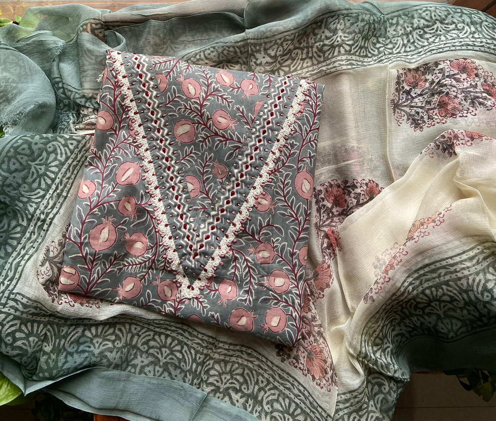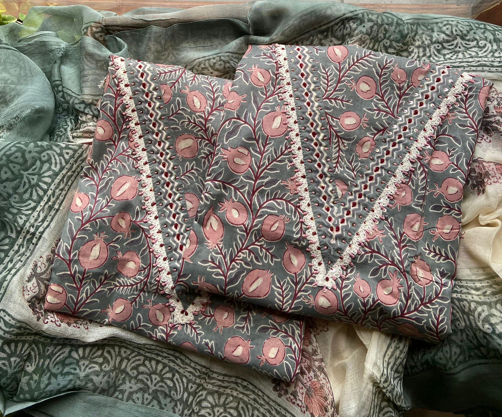 Are you looking out for Beautiful & Unique Designer Cottons to add to your wardrobe ? These Hand block printed Kutch worked cottons are the perfect choice! Pure cotton top with authentic Kutch work (does not need lining ) cotton printed bottom & hand block printed chiffon duppattas