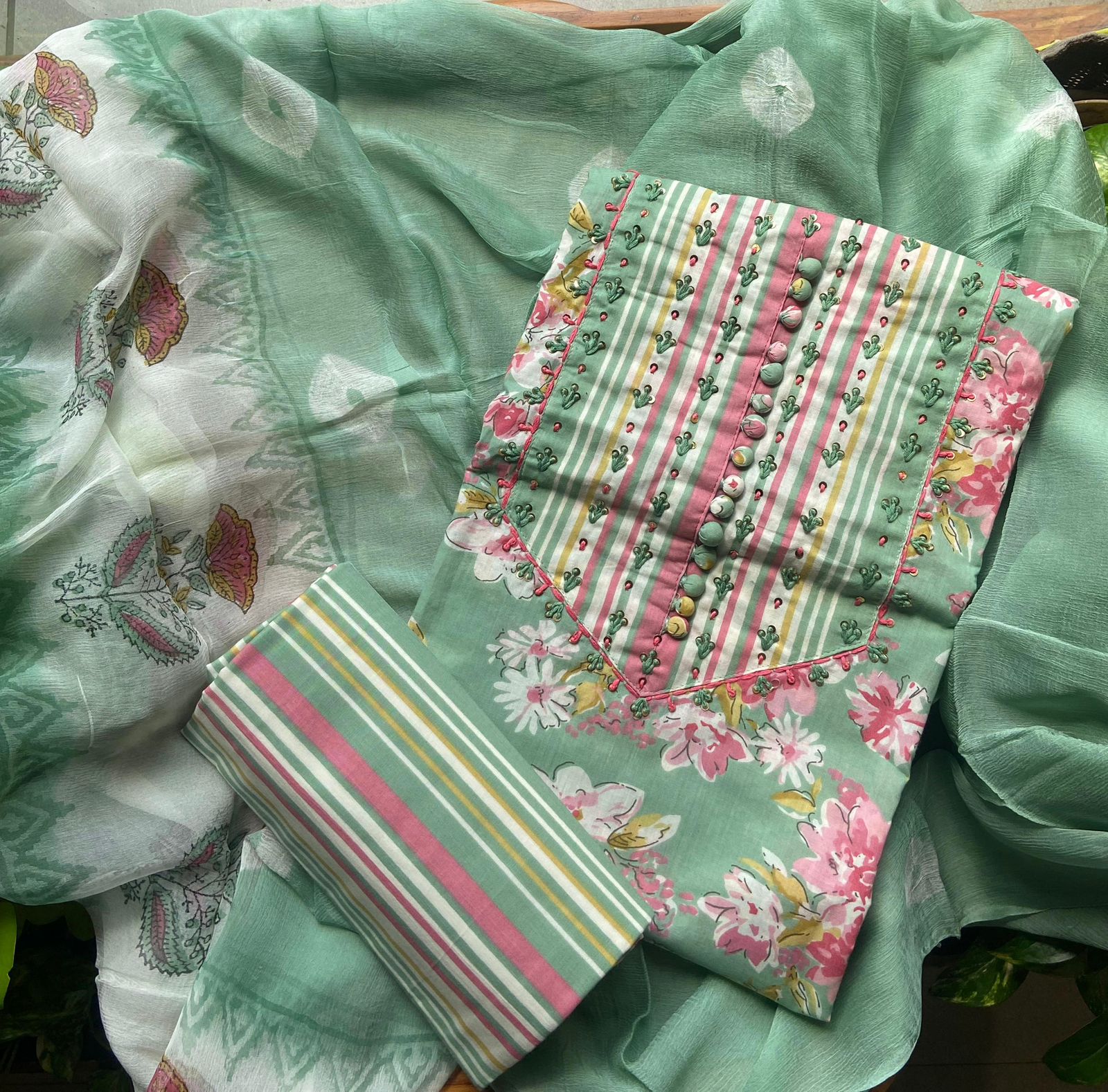 Are you looking out for Beautiful & Unique Designer Cottons to add to your wardrobe ? These Hand block printed Kutch worked cottons are the perfect choice! Pure cotton top with authentic Kutch work (does not need lining ) cotton printed bottom & hand block printed chiffon duppattas