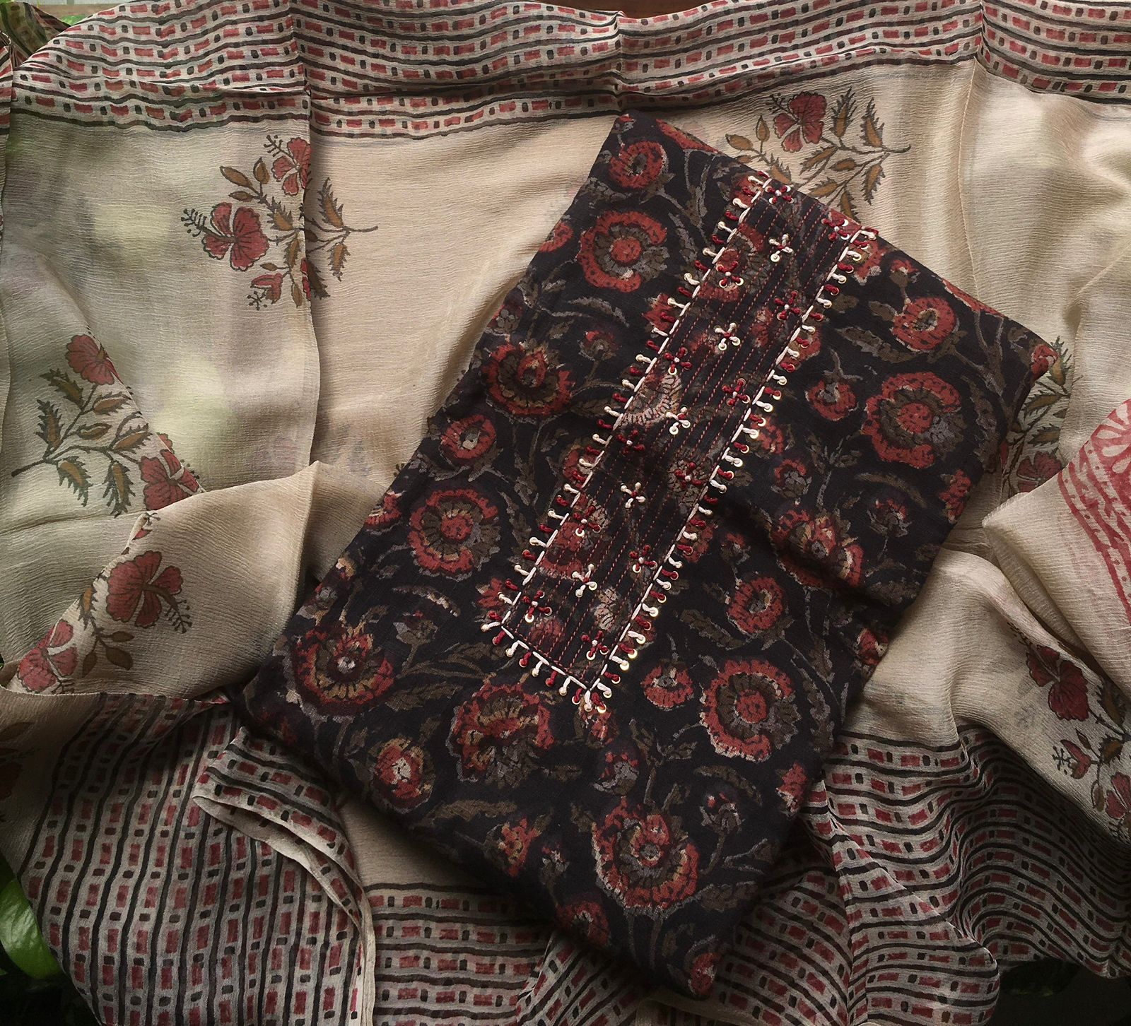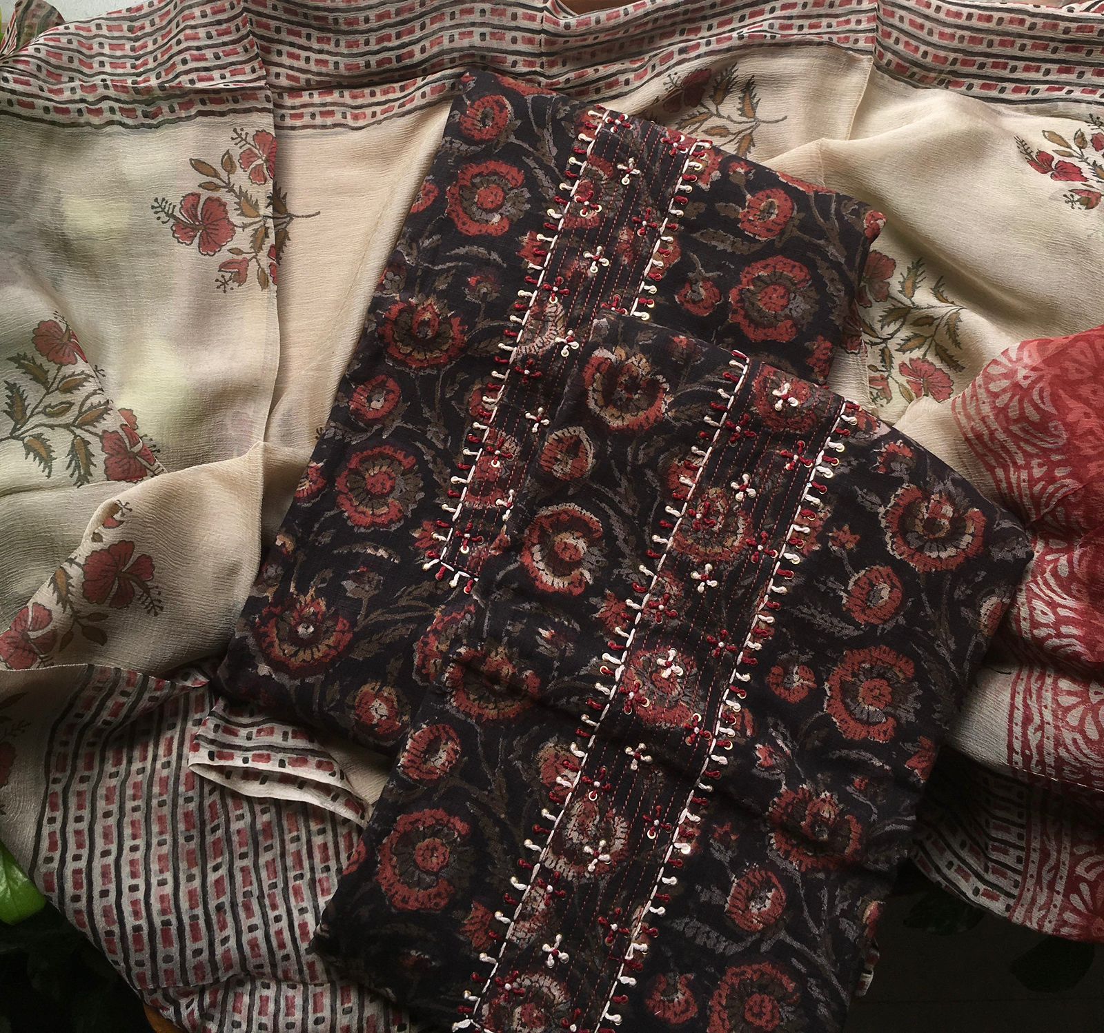 HomeSalwar Set Are you looking out for Beautiful & Unique Designer Cottons to add to your wardrobe ? These Hand block printed Kutch worked cottons are the perfect choice! Pure cotton top with authentic Kutch work (does not need lining ) cotton printed bottom & hand block printed chiffon duppattas