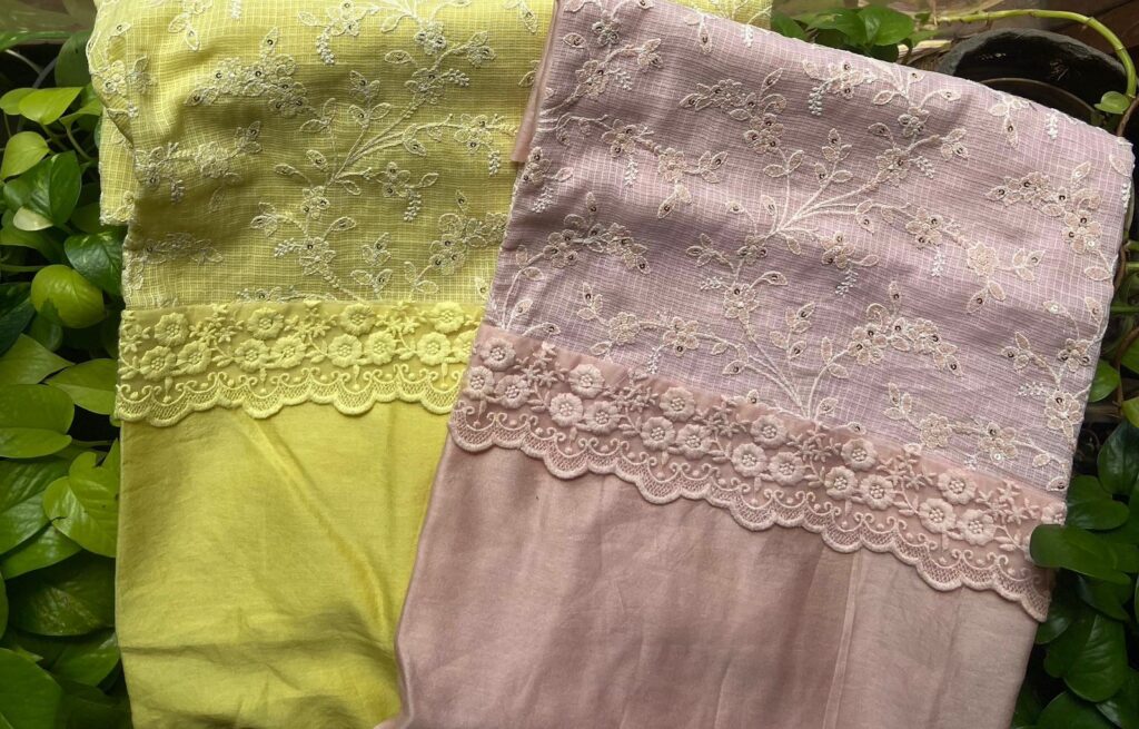 • Simple & elegant Chandheri silk kurta materials with Chikankari embroidery & French lace detailing at yoke ₹1,650.00
