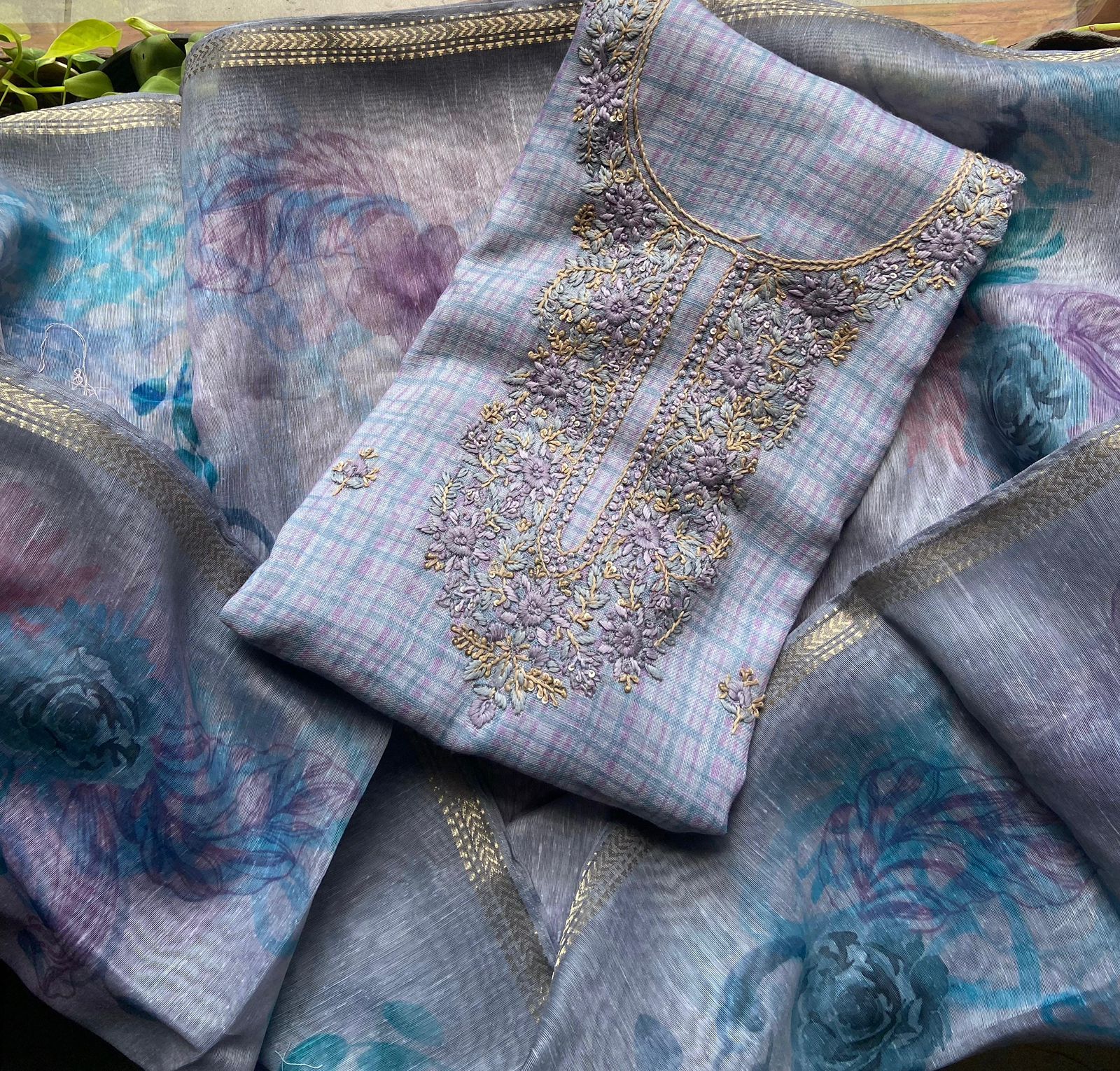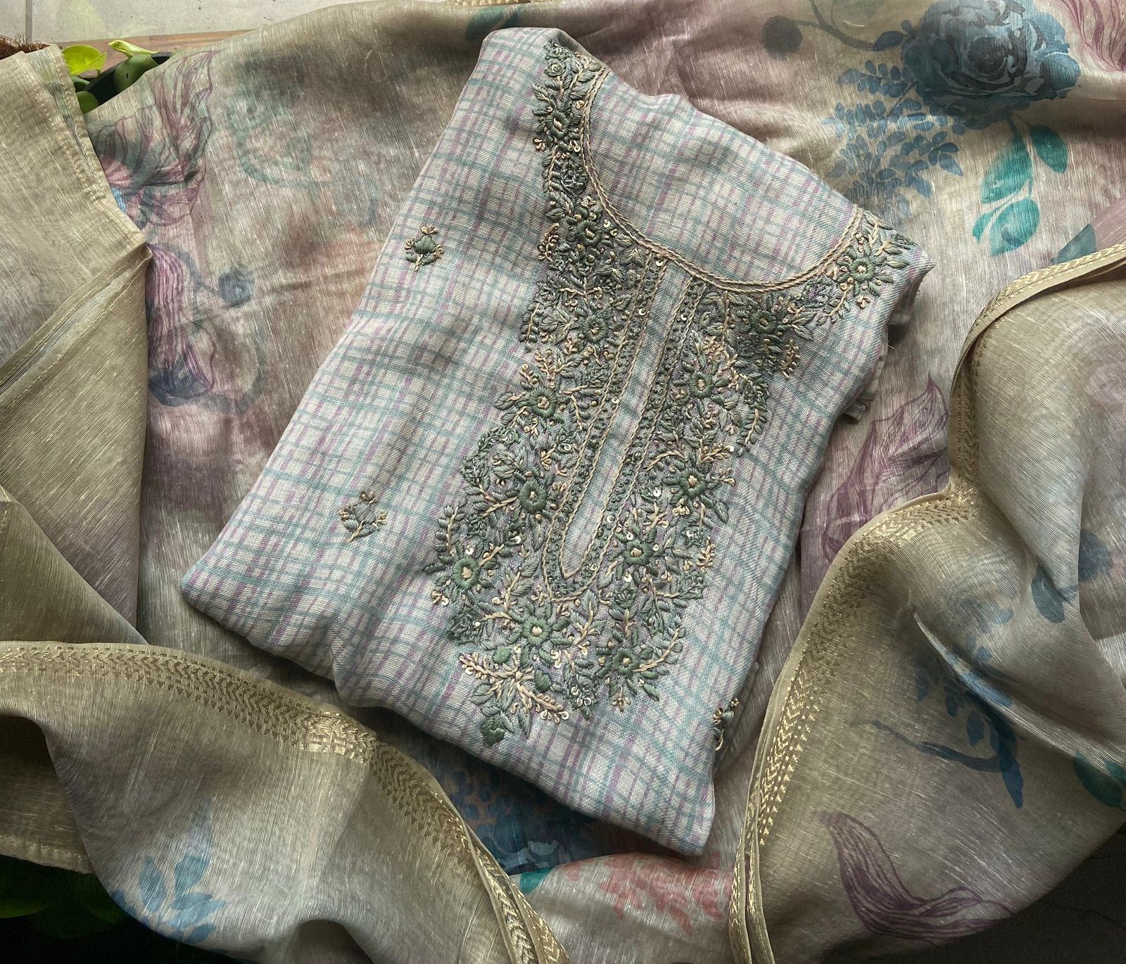 Are you looking out for Beautiful & Unique Designer Linens to add to your wardrobe ? These floral linens are the perfect picks! Linen top with subtle check block prints , hand embroidery, santoon bottom & linen silk floral Duppatta