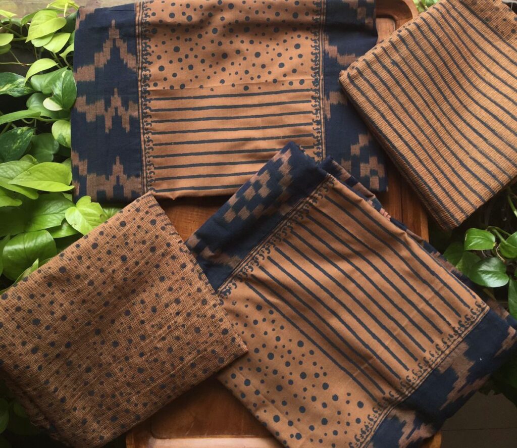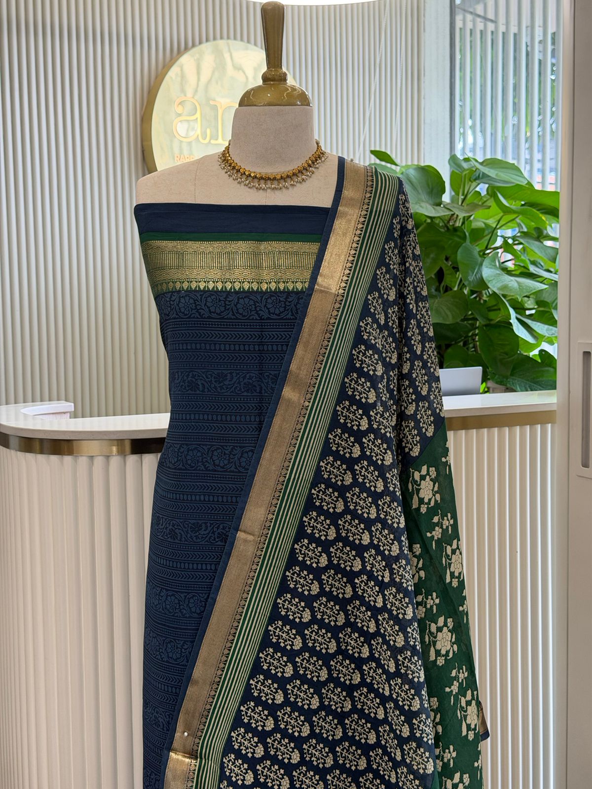 Are you looking out for Beautiful & Unique Designer Cottons to add to your wardrobe ? These Hand block printed Indigo cottons are the perfect choice! Pure cotton top with mirror work , (does not need lining ) cotton bottom & hand block printed chiffon duppattas ₹2,900.00