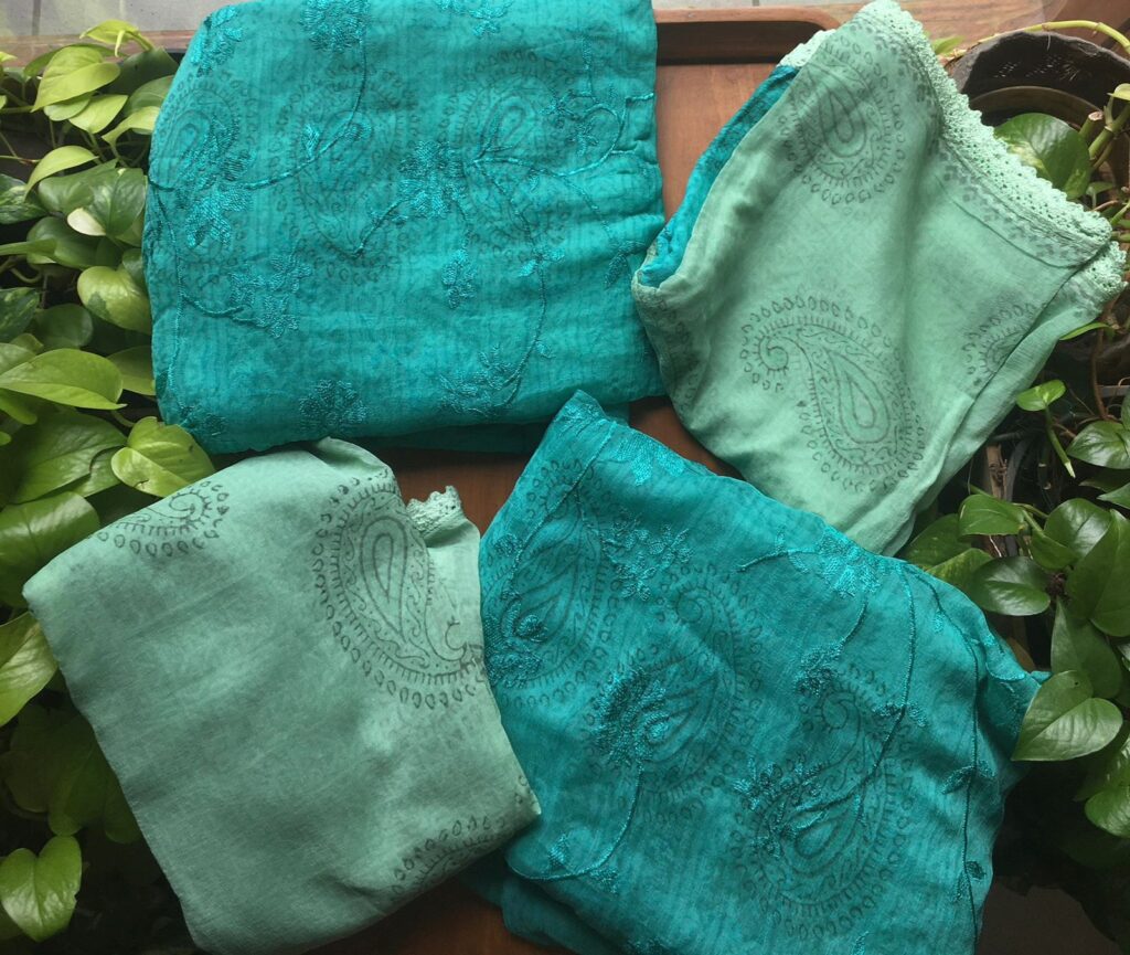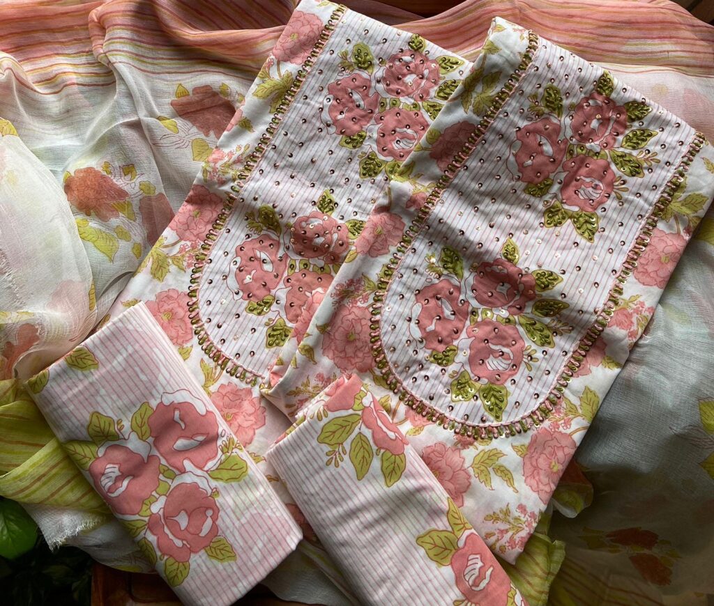 Are you looking out for Beautiful & Unique Designer Cottons to add to your wardrobe ? These Hand block printed Kutch worked cottons are the perfect choice! Pure cotton top with authentic Kutch work (does not need lining ) cotton printed bottom & hand block printed chiffon duppattas