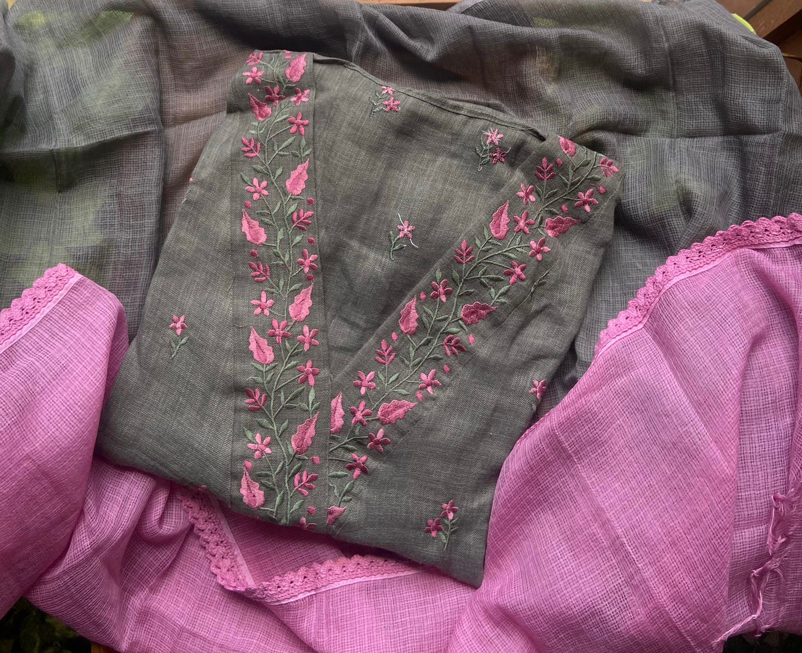 Are you looking out for Beautiful & Unique Designer wear suits in cotton to add to your wardrobe ? These Floral embroidered cottons are the perfect choice!Pure Cotton top with beautiful floral embroidery & lace detailing , cotton bottom & Kota Doria Duppatta ombré dyed Duppatta