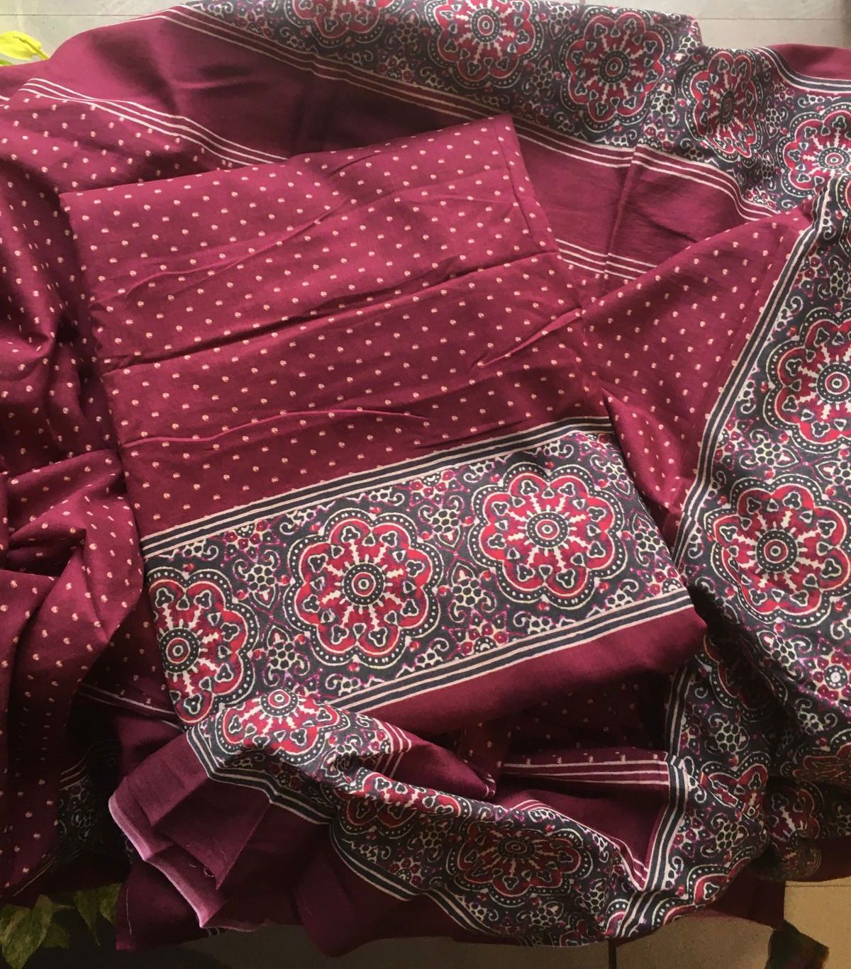 Are you looking out for Beautiful & Unique Designer wear suits in Silks to add to your wardrobe ? These Muslin Ajrak silk suits are the perfect choice!Pure Muslin Silk top &  Duppatta with stunning Ajrakh prints & cotton bottom